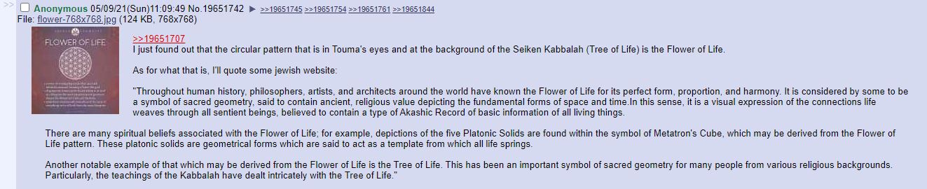 Edit again: You know the thingy with Touma's eyes? Seems like it's some sort of Flower Of Life. Accordingo this anon on /m/. Last edited by TheRaizin; 05-09-2021 at 05:39 AM.. |