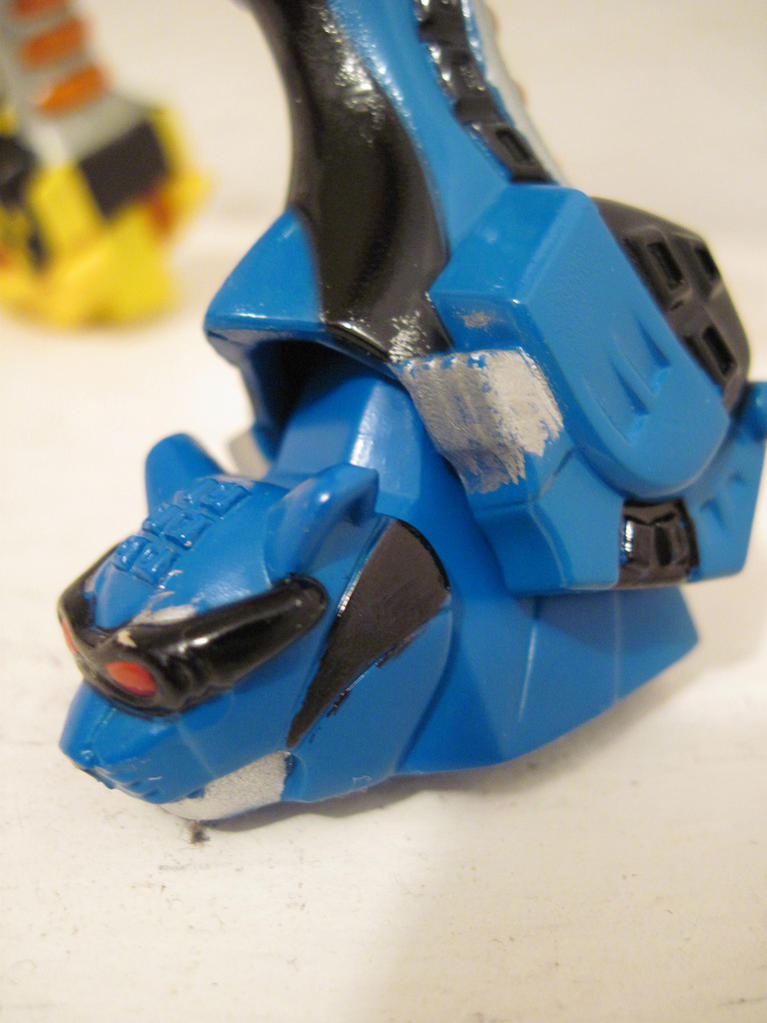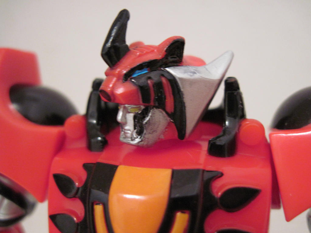 I've been a Super Sentai fan for several years now and I don't have any merchandise from it. The real stuff is a bit too pricey, so I looked to the Power Rangers stuff. I rather liked the idea of the retrofire series. I looked at some reviews and the Jungle Pride megazord seemed to be the best figure currently available. I thought the articulation was pretty cool, totaling 18 points. But the paint scheme seemed too simple. So I added all the details to make it show accurate. I added: - blue paint on the GekiTiger's eyes as well as the black trim around it going up to the ears. - Changed the black on the outside of the face to silver and the bits on the inside to black. - Painted the "rings" on the biceps black - filled the holes on the back of the fists with hot glue and painted orange. - painted the fist claws silver - black paint on the back stripes and back skirt. - black details on the tiger paws at the thighs - black on the thigh and lower thigh - silver on the back of the legs - orange on the leg bumps - black on the back of the legs under the silver - yellow on GekiCheetah's spots - black on GekiCheetah's head spots - silver on the feet of GekiCheetah and GekiJaguar as well as the top of the eyes above the "sunglasses" - black on the cheek stripes of GekiJaguar.