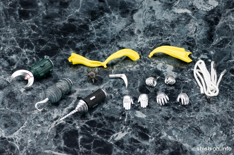 Riderman comes packed with a set of alternate interchangeable hands, along with his signature Rope Arm weapon. He also comes with his Power Arm and Drill Arm alternate weapons, as well as an attachable wire for the Rope Arm. Riderman also comes with two scarves, one stationary and one flowing. Click Here to see Shishioh’s full gallery. |