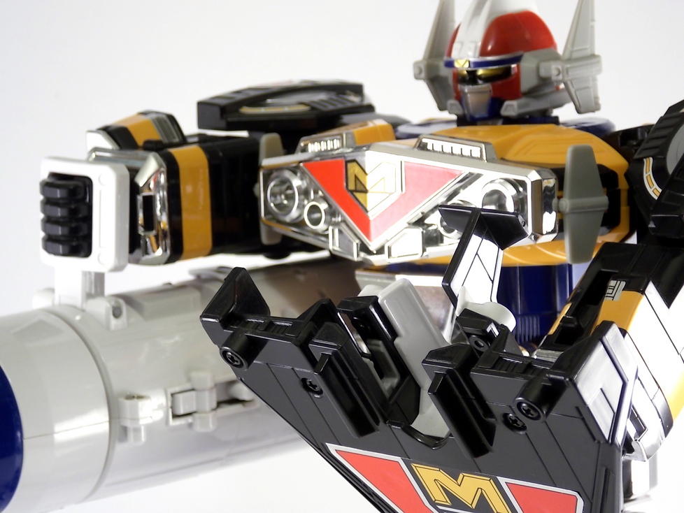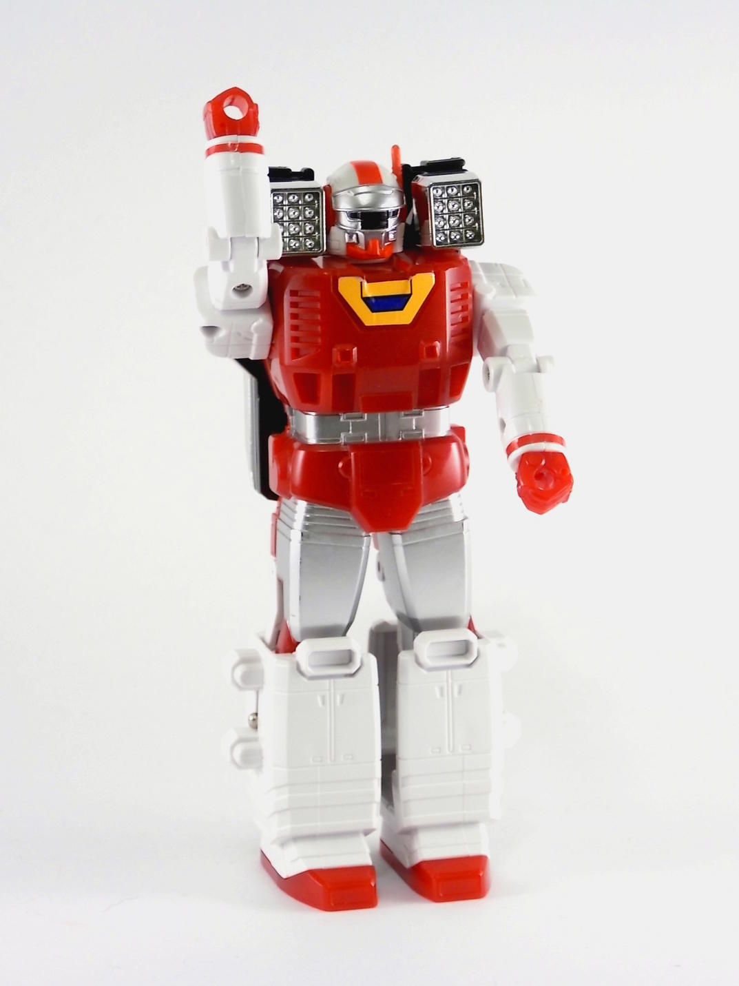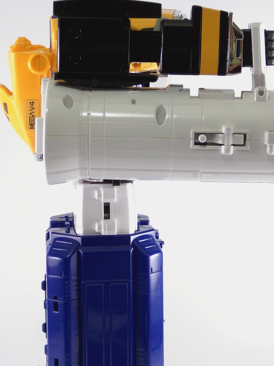 The voyager strays from the singular vehicle transformations of the Space Rangers first 2 Megazords and opts for a more traditional 5 piece combination. Each vehicle, named Mega V1 through Mega V5 , is unique to each ranger. V1 is a small robot which can operate on it's own, V2 and V3 can share a combined space rocket mode thanks to clips on the V3, and V4 & V5 are independent ships. In combined form a chunk from the rear section of V2 forms the head while the primary ship becomes a gigantic shield, and while sections of the V3 rocket form the legs and mid torso of the Voyager the forward section and capsule of the rocket form a large missile launcher! Want TokuNation.com updates on the go? "Like" us on Facebook and follow us @tokunation on Twitter!!