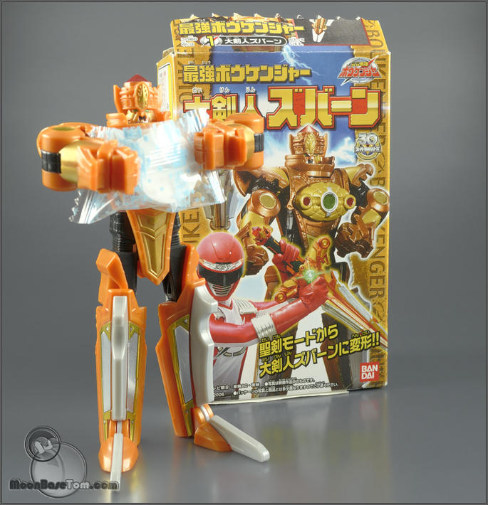 ZUBAAN! Here's a gallery of the candy toy figure of ZUBAAN! From Gogo Sentai Boukenger. Zubaan only spoke one word, ZUBAAAAN! And that's all he needed to say. This was a completed figure, and only needed labels applied. There was no construction involved at all. His transformation is simplified from his DX toy, the jewel on his chest didn't lock the toy it only turned on a peg.