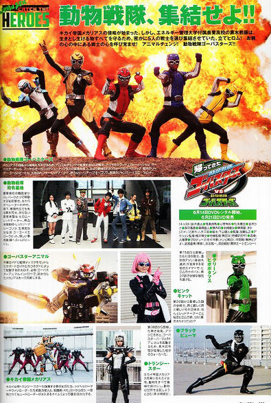 After several months of mentioning this new character in magazine scans we finally have our first image of Green Hippopotamus! Green Hippopotamus is of course the final member of Dobutsu Sentai Gobusters from the upcoming Tokumei Sentai Go-Busters V-Cinema! We see him here with fellow new character Black Puma and their universes' Pink Buster (Rika Sakurada). Remember the Dobutsu Sentai is an alternate world version of the Go-Busters that based themselves on animals.