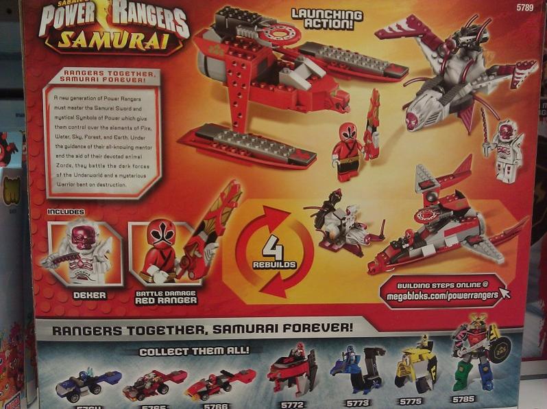 Just in time for the holidays, the Mega Bloks Power Rangers Samurai construction sets have been sighted at Toys R Us! Yours truly spotted them earlier today. The Samurai Megazord is fully articulated and can be built in 3 different modes. Also sighted were a Red Samurai Ranger VS Deker set, and 3 separate zord sets(red, blue, and yellow). The 3 zord sets can be built as their animal modes or a vehicular battle mode.