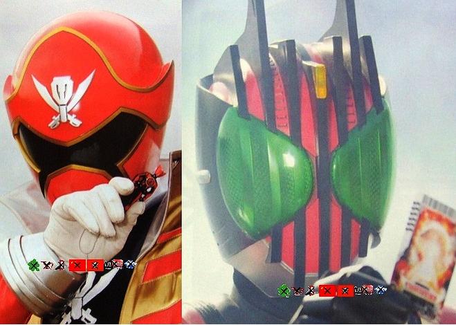 The new issue of Figure-Oh magazine contains new images and info on the upcoming Kamen Rider x Super Sentai: Super Hero Taisen movie, the most interesting info relating to Dai-Zangyack Emperor Gokai Red and Dai Shocker's leader Kamen Rider Decade! One image depicts Gokai Red holding a Kamen Rider OOO Tajadol key, while Decade is seen holding an as yet unidentified Gosei card! Other images in the magazine include out of suit fight shots of Captain Marvelous and Tsukasa, Dai Shocker's Crisis Fortress and Kamen Rider's Decade, Blade and Ryuki with Gosei cards in hand. You can check out all of the images after the jump! Sources: Scans - ca3blog Translation - HenshinJusice