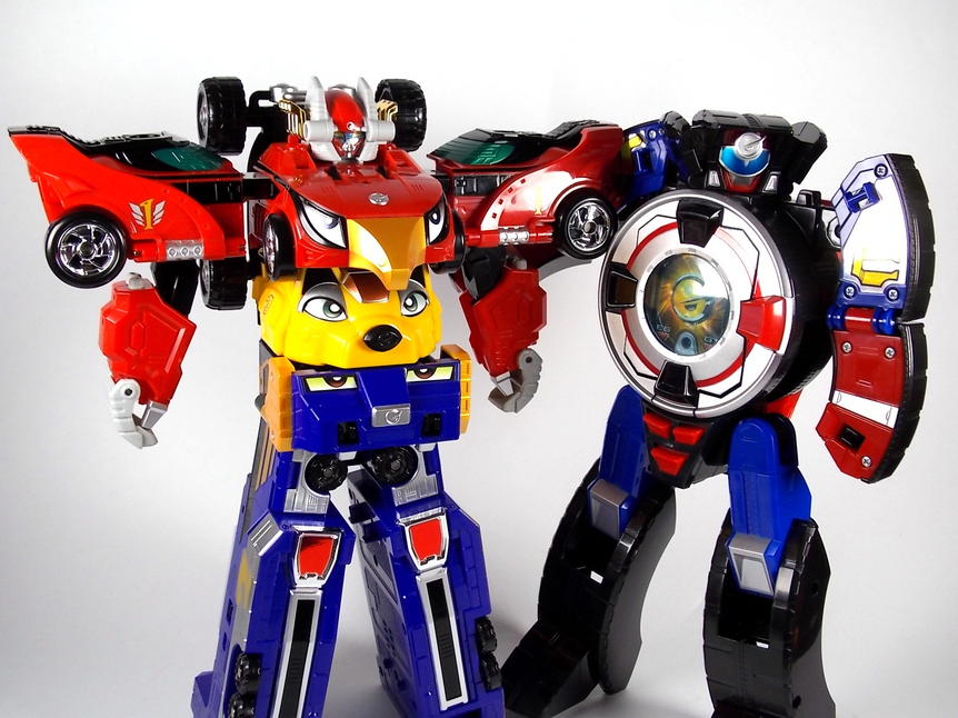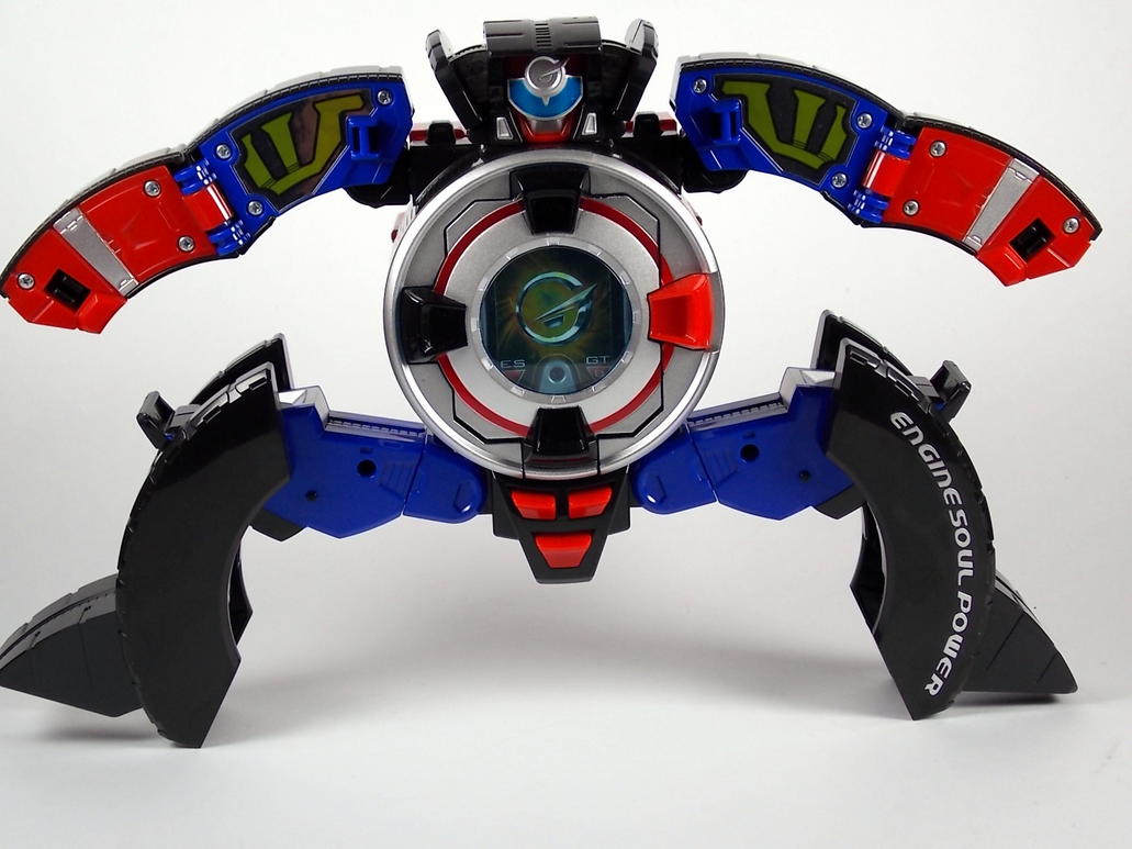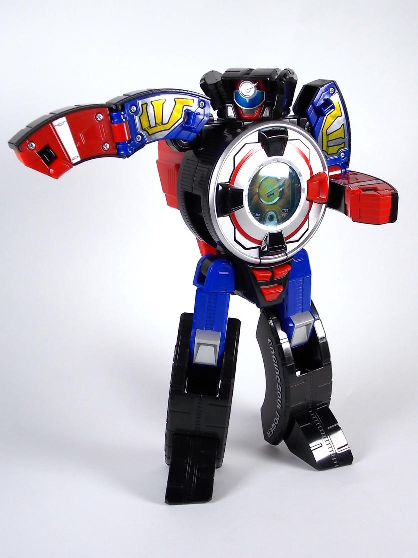 What is? There is no DX release of Go-Roader in the US. The only toy it ever got was a small 6" transforming figure. BOA made it and some Road Attack rangers that also turned into wheels. As if the robot mode for the Road Attack wasn't inaccurate enough it was also redesigned to be an off road tread tire rather than the racing wheel that the Go-Roader actually is. The real Go-Roader pictured here is the same size as the DX Engine-Oh and the other Go-Onger mecha.