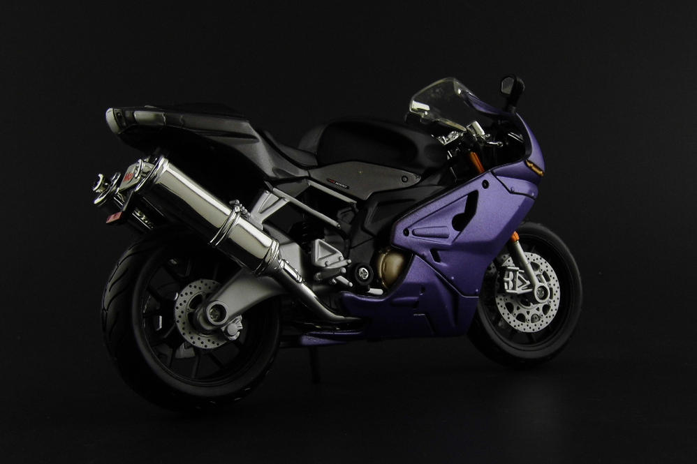 . Instead I decided to go ahead and get the old customs mojo flowing and do a quick repaint of an Aprilia RSV R 1000 in colors matching Kamen Rider Ouja.After a quick disassemble, I chose what colors would go on what parts. After priming, I used some Decorart metallic purple crafts paint thinned down with my special mix of matte medium, flow-aid, and retarder and fired up the ole airbrush. I had tried brushing the mixture on a palette, but it left a swirl and the thickness was too inconsistent. The parts I wanted to paint black were considerably easier. A quick mask and a couple of layers of black and we were good to go. Unfortunately I was a little impatient and didn't wait until the front fender was fully dry when trying to reassemble the bike. I left some gnarly looking fingerprints in the paint. I decide to leave it out, since it isn't vital to the bike and helps differentiate it from the stock model I still had. After reassembly, it still lacked something. After a brief look at Ouja for inspiration, I decided to add some gold accents to the front fairing to help tie the two together. Thank you for looking. |