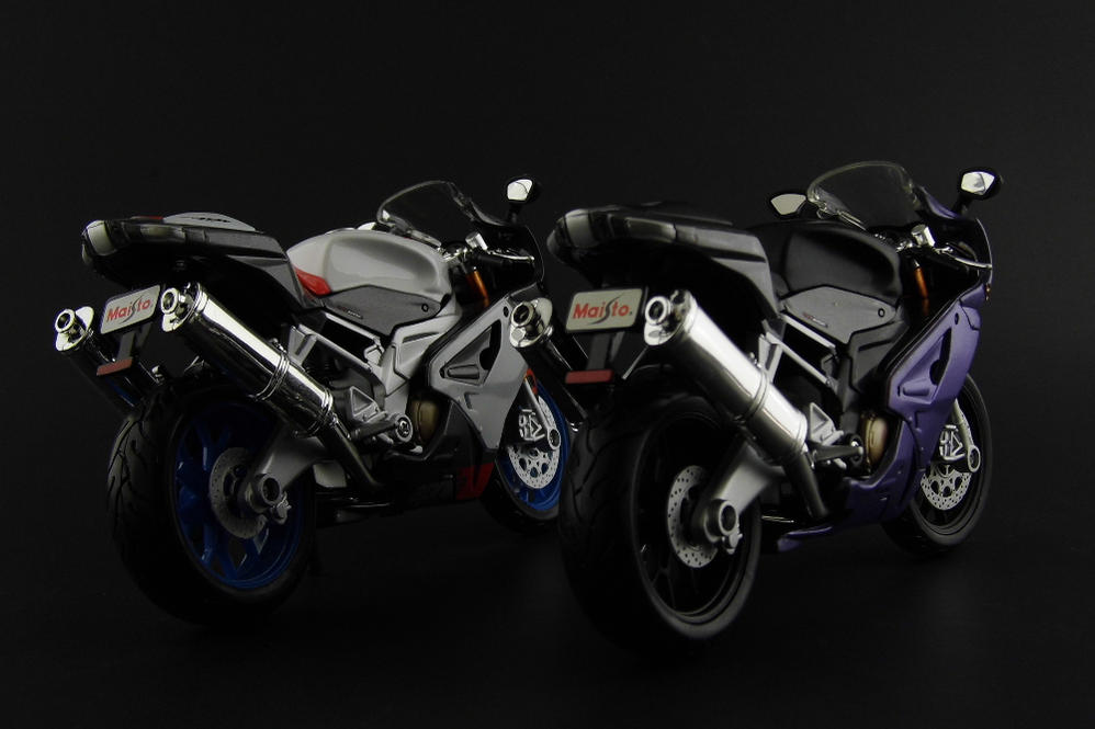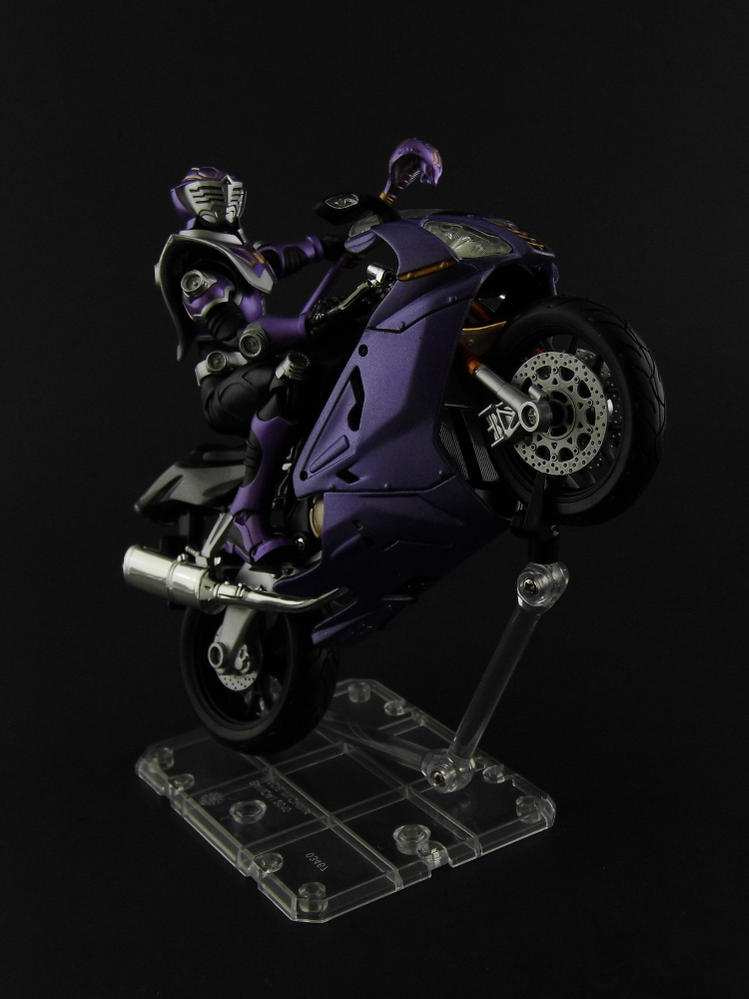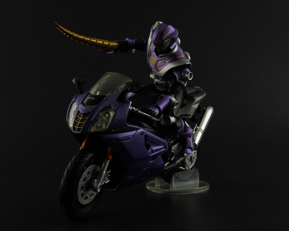. Instead I decided to go ahead and get the old customs mojo flowing and do a quick repaint of an Aprilia RSV R 1000 in colors matching Kamen Rider Ouja.After a quick disassemble, I chose what colors would go on what parts. After priming, I used some Decorart metallic purple crafts paint thinned down with my special mix of matte medium, flow-aid, and retarder and fired up the ole airbrush. I had tried brushing the mixture on a palette, but it left a swirl and the thickness was too inconsistent. The parts I wanted to paint black were considerably easier. A quick mask and a couple of layers of black and we were good to go. Unfortunately I was a little impatient and didn't wait until the front fender was fully dry when trying to reassemble the bike. I left some gnarly looking fingerprints in the paint. I decide to leave it out, since it isn't vital to the bike and helps differentiate it from the stock model I still had. After reassembly, it still lacked something. After a brief look at Ouja for inspiration, I decided to add some gold accents to the front fairing to help tie the two together. Thank you for looking. |