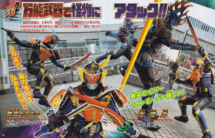 Additional images focus on Gaim and his bike, Sakura Hurricane, which we saw earlier. Meanwhile we also get a good look at this horse as well as his weapons, Daidamaru and the Musou Saber as well as their combined form, Daidaimaru Naginata Mode. Credit: Hero Shock