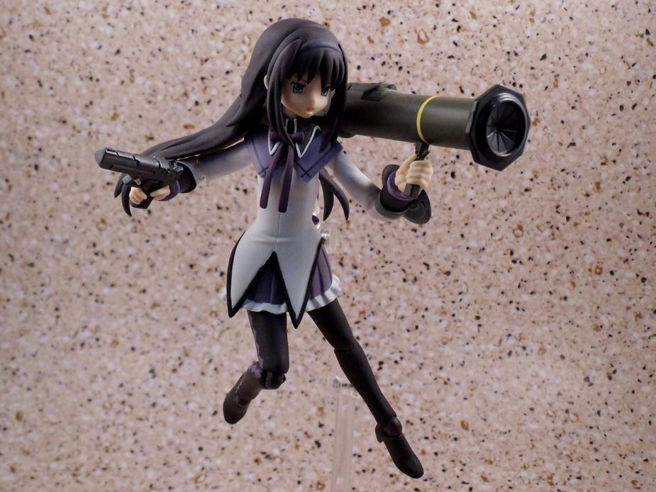 First up is undoubtedly my favorite magical girl from the series, Homura Akemi. Akemi comes with the requisite figma stand, twelve hand options, three different faces, a set of glasses, alternate hair piece depicting her twin braids, her signature shield, left forearm option without her shield, a grenade, a missile launcher, a handgun, and a golf club. She was a blast to play with. I don't know what it is about giving this young lady some guns to play with that is just so satisfying. As you'd expect, she stands rather small compared to figmas of adult aged characters. Her articulation is on par with what you'd expect from the line and the paint work is clean overall.