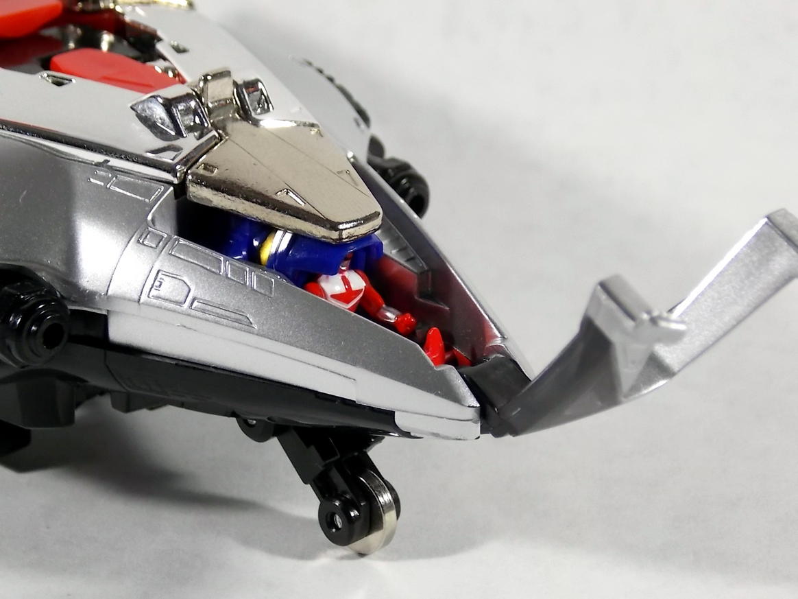 Also slight variations in seating while Time Robo is in Beta/blue mode: Time Blue & Green stand on the backs of their seats with their heads in that notch in the footrest. Red similarly flips around in his seat to stand upright behind the face of the robot. Another pointless aside: The cockpit covers on the Black & Gold version are more transparent to the point where you can see the mini-Rangers sitting in their seats when closed. The regular version's covers are dark enough that you can't easily see the Rangers |