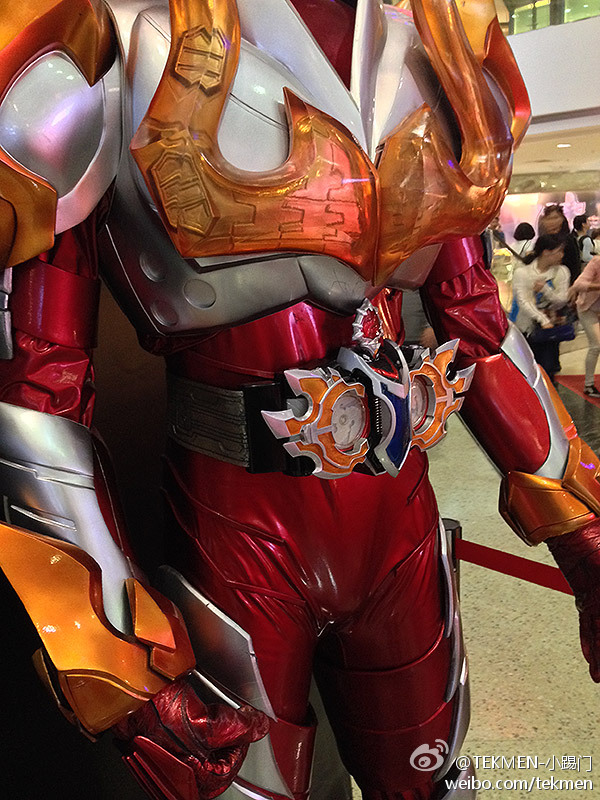 This time, all armors are based on elements of fire (Lava), wind (Tornado), water (Tsunami), earth (Cliff) and aether (movie character). TV series will air this December, and a movie next year. Yes, there surely will be a movie this time. The filming was already completed; It is now in post-production. You might notice the lock on the side of his head. This helmet was for roadshow, but the rest is for shooting. The belt is fully functional: turn the key can trigger spinning and lights.