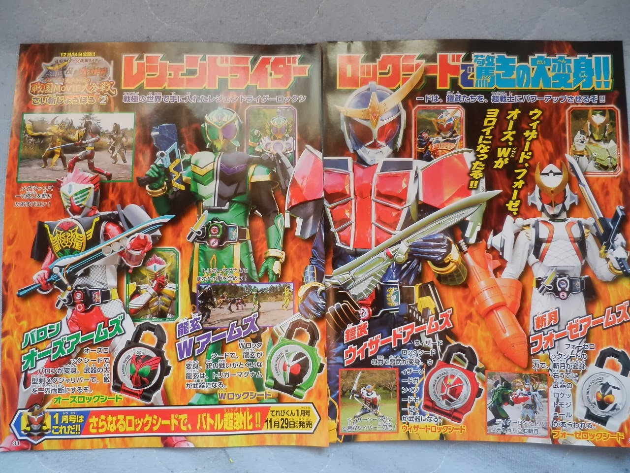On top of the new magazine scans for Kamen Rider Gaim and Zyuden Sentai Kyoryuger, we also have new images from Gaim X Wizard Fateful Sengoku Movie War! These new images showcase the 4 Heisei Rider Lock Seeds that will be used in the film! Wizard, Fourze, OOO, & W!
