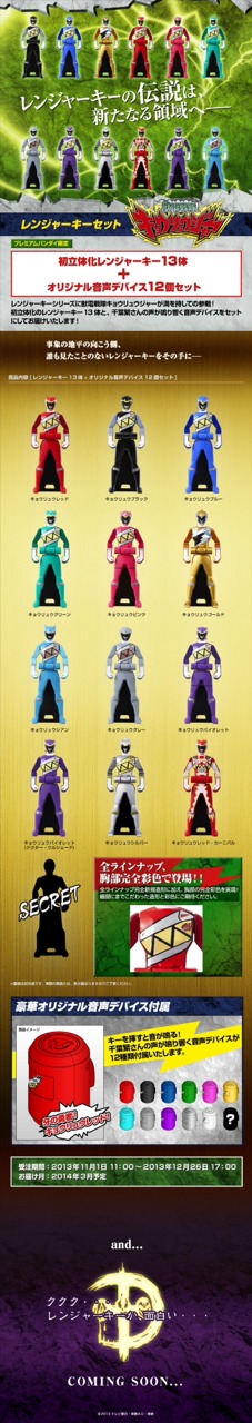 The set includes the 10 main Kyoryugers, as well as the male KyoryuViolet Key and KyoryuRed Carnival's key. The keys will not have a sound in the Mobirates, but there will be special "key slots" (like those on the GokaiGun and GokaiSabre) that will be able to make sounds, but with Shigeru Chiba's voice. Another key and key slot will also be in the set, but both have been labeled as secret for now. Pre-orders are up now, ending December 2013 with an estimated time of release of March 2014, for the price of 16,200 Yen. If you like collecting keys and bravery, it's time to go wild! -Also, at the bottom, a teaser of the Deboss Symbol is shown. Deboss Keys, anyone? EDIT: First post now has more images of the keys!