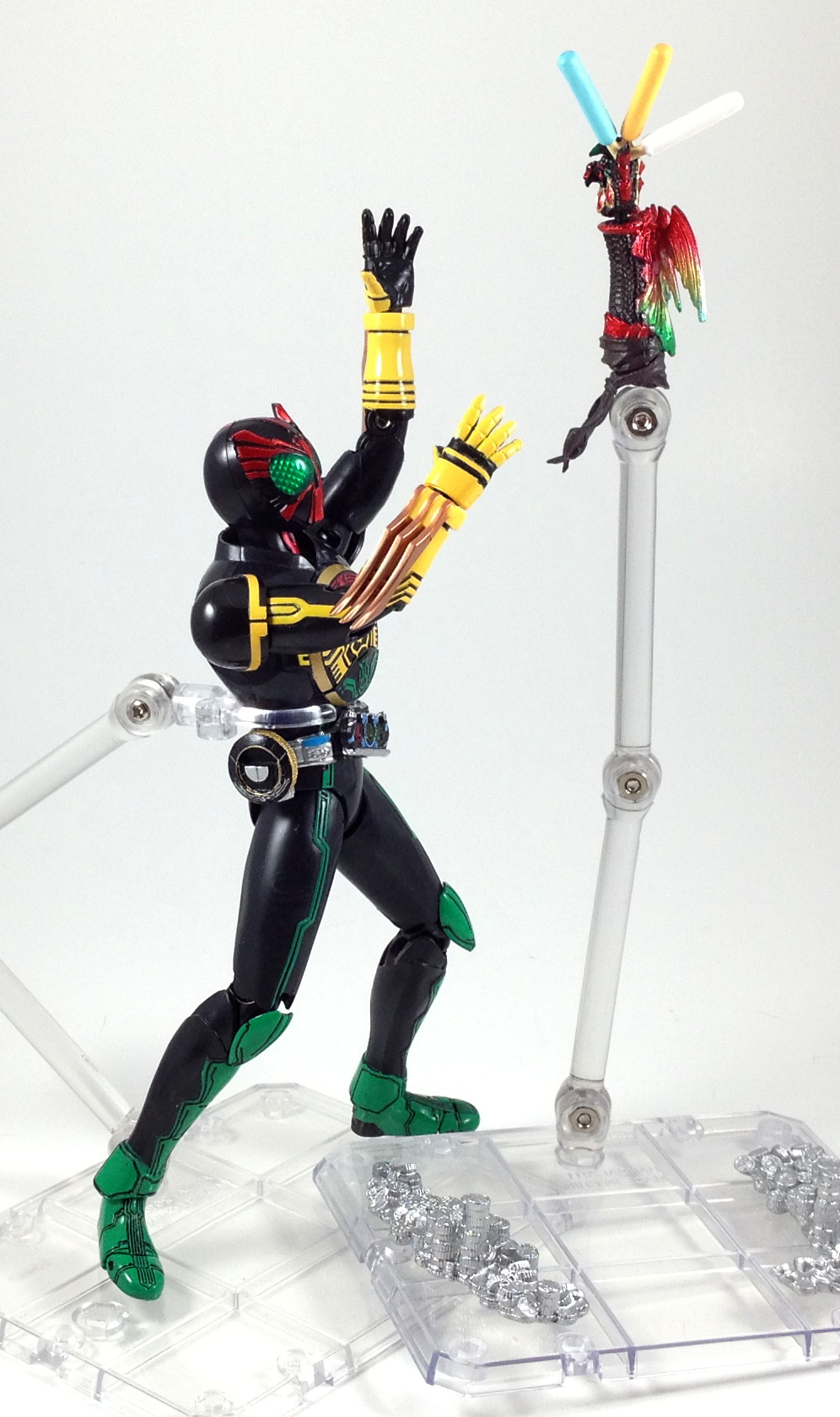 The SH Figuarts Ankh Stand Set from Kamen Rider OOO is a repaint of the Ankh that was a first release bonus with SH Figuarts TaToBa. It features a much more detailed and show-accurate paint job, a Tamashii Stage Act 4, two piles of medals and a total of 5 hands. Being one of the primary characters of the show, this set is a must-buy for fans of OOO.