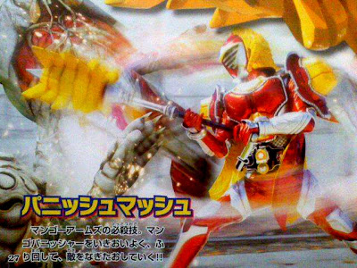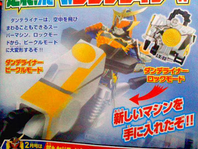 In the near-future it seems the Armored Riders will gather for battle in the Forest of Helheim, the source of all LockSeeds to date. These scans give us our first real look at Kamen Rider Baron's new form, Mango Arms- along with Kamen Rider Ryugen's second form, Kiwi Arms. Along with these new armors, Kamen Rider Gaim will be receiving a new vehicle- LockSeed LV-03, the "Dandeliner." Finally, the scans again tease the upcoming "Energy Riders" that use a new form of LockSeed. The only one with name confirmed at this point is Shin Zangetsu, an upgraded Melon Arms Rider. Things are looking good for Gaim in the future! |