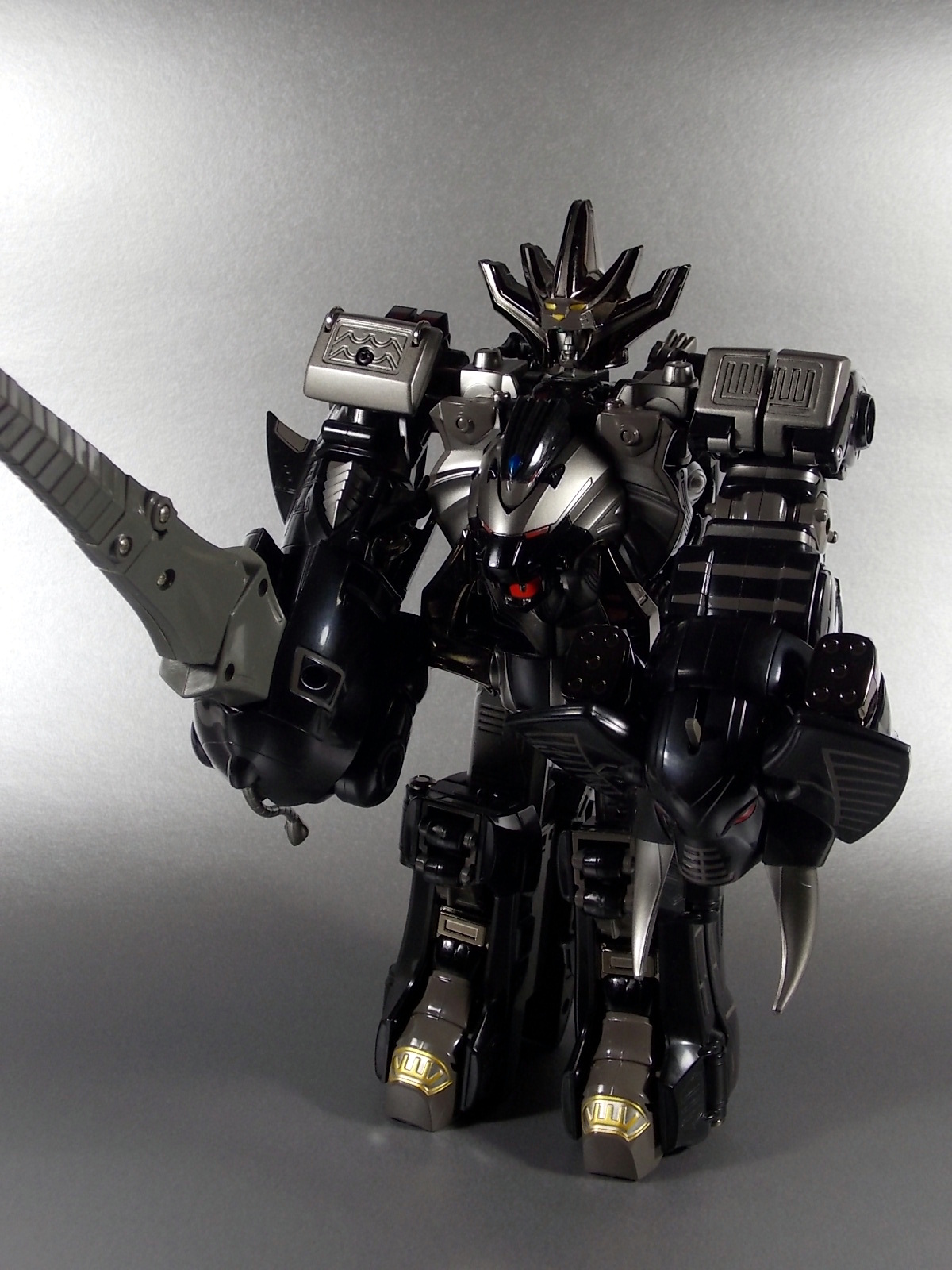 DX Black Gao King is a special repaint of the standard Gao King set done up in, you guessed it, black/silver, packed in a black/white version of the normal Gao King box. The set has a nice sleek uniform color scheme that's very pleasing to the eye. Though if you already have a normal Gao King this may not be a set you'd want to double up with. The Black Gao Elephant released with the TRU Gao Knight set is also a perfect addition to this set allowing you to make a full on Black Gao King Sword & Shield! Of course this set is part of a long long tradition of black repaints not only for sentai, but for mecha shows in general. The first black edition sentai robo being the Black Daizyujin later altered for release in the US as the Black MMPR Megazord. Want TokuNation.com updates on the go? "Like" us on Facebook and follow us @tokunation on Twitter!!