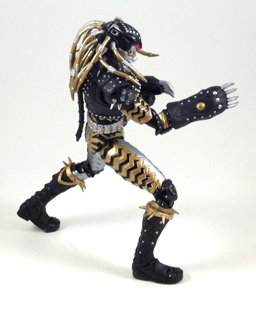 Honestly, until taking this photos, I had never noticed that Kazari's design isn't symmetric. The gold with black striping on the right side is awesome, and contrasts nicely with the black look of the left half. The gold and silver paint are both very shiny. One of my favorite things about this figure is the light-piping. The eyes/nose-piece is made out of a clear red plastic, which catches the light quite easily when viewed from a not-straight-on angle. The eyes don't reflect the light as much as the nose, but I like how it looks. Beware the spiked boot-tops and shoulder pads, they are very rigid and sharp spikes, and they will poke you if you slip while swapping the hands. Speaking of which, the claws on the forearms does make hand swapping a little tricky at times. Articulation on this figure is decent, though the ankles suffer from not having all the neat jointing earlier Figuarts have. The foot simply plugs into a ball joint which has significantly more limited range of movement than the hinges of say the Ryuki or W Figuarts. Kazari won't be taking keeping his feet flat on the floor in deeper poses. Aside from that, the dreads are slightly bendable, but pretty stiff and make it hard to have the head posed any other way than forward. The extra shoulder pads slightly limit the upward movement of the arms, but not too much. I believe all of the Greeed Figuarts were Tamashii Web Exclusives, but from what I have seen on Mandarake, their aftermarket price has been trending down of late, so they shouldn't be too hard to acquire, and they look fantastic displayed together as a group, or opposite the various OOO Combo figures. |