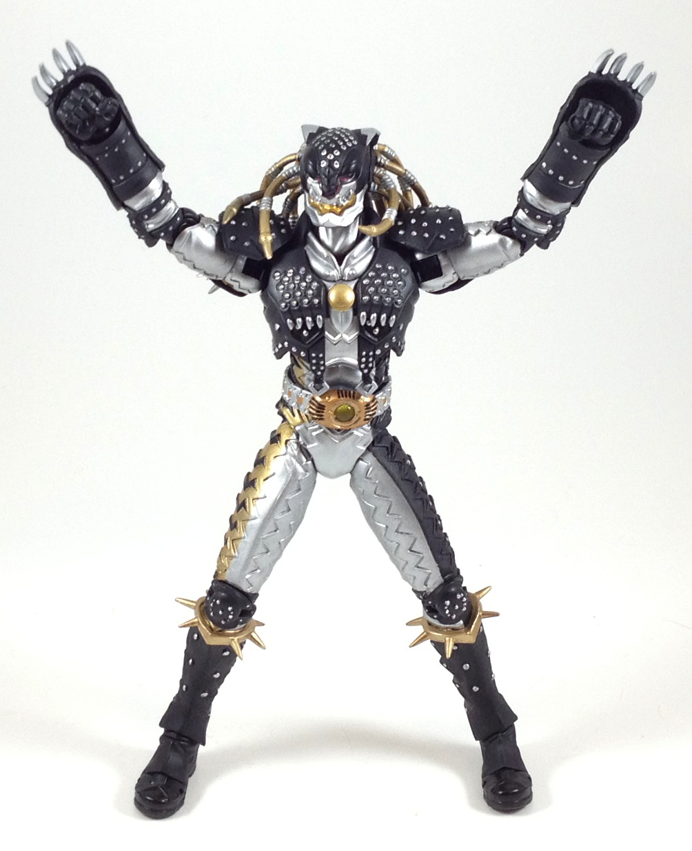 Kazari is beautifully sculpted. The suit was highly detailed and the Figuarts is sculpted to match. This figure is covered in studs and spikes, and all of them have shiny silver paint on it. The lines aren't always as clean as I would like, but I can forgive that for how small most of the studs are. Additionally, the left arm and leg have a ton of silver-painted rings on them, and those are almost uniformly perfectly painted, so the studs don't bother me as much.