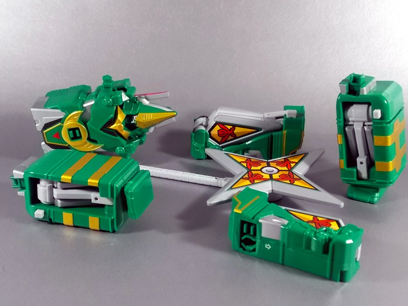 Today's subject is the grand power of Hurricaneger, DX Gokai Machine Furaimaru! Furaimaru is of course based on the character of the same name from Ninpu Sentai Hurricaneger. In fact just like Gaolion he's meant to specifically BE the character he represents, albeit in a new modified body. As you can see here, Gokai Machine Furaimaru differs greatly from the original. The Gokai version isn't constrained with the need to fit into Karakuri Balls, but at the same time is constrained by the design of it's massive spring loaded shurikens. The Gokai Version also opted for green over the originals blue. The green itself and the very overt shuriken theme are obvious homages to Shurikenger and his mecha Tenkuujin. The figure itself is very similar to Gokai Machines Magi Dragon and Patstrike in that it breaks down into 5 components and can be fully stored in Gokai Oh's compartments when not used. When the Gokai Oh dial gimmick is activated the spring loaded shurikens in the arms and legs will spring forward. Now they may appear to be cumbersome, and that's because they are! They're very big and look very silly, but this isn't far off from the Gokai Oh's on screen appearance. The new helmet and chest piece are spring loaded like the other parts, however it doesn't fully pop onto Gokai Oh's head. After it springers out you need to manually attach it via the clip on top of the head and then fold the crests out on each side. The new face however looks great and is a double homage to Furaimaru and the Hurricanegers main robo, Senpuujin. This combined form with Furaimaru is called Hurricane Gokai Oh! The large shuriken stored on Furaimaru's back can also be held by Gokai Oh. However the rather larger (and aforementioned to be cumbersome) shurikens in either arm make it difficult. The large shuriken is not on a chain as it is in show. So, is this a perfect toy? No. But replicating a hyper physical robot ninja who flies on a giant shuriken, can duplicate himself, and throw tons of Kunai blades at a time doesn't seem entirely easy to do in toy form This toy compromises a bit of it's individual form toward the combined one and a bit of the combined form loses out for the individual. It's not perfect in either mode, but at it's price point it would be a fair addition to any Gokaiger collection!