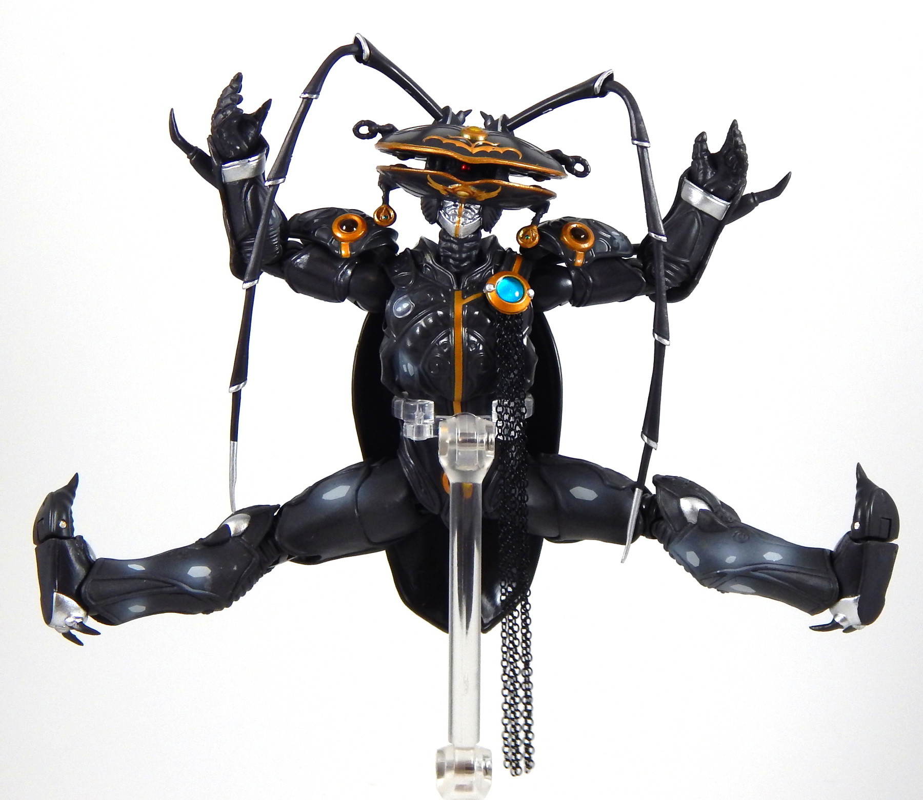For accessories, Libra comes with a decent pile of things, though they boil down to just 3 items and a bunch of hands. He has a small Zodiarts switch, with two paint apps. The switch has some detailing on the side, but it wasn't painted at all. Somebody with a fine brush and some gold paint could make it look pretty excellent though. Libra includes a special right hand that's slightly more splayed open than the other open hand, for offering the switch to unsuspecting school kids so they can wish upon the stars. He has his staff, with metal chains on each each end and lots of nice, fine, gold detail work, and his cloak. Ah, the cloak. What an awesome thing to include. In theory. I love how the Horoscopes look in their matching robes, the sinister look they convey, so I was really happy that these Zodiarts Figuarts include the cloak. But, sadly, the execution doesn't match my expectations. The cloak is comprised of 6 distinct pieces of very hard plastic. It snaps together around the figure, killing all articulation except some head movement (limited by the high collar of the robe and Libra's giant head). The arm movement is restricted to moving forward a couple of degrees, and you barely have access to his hands. The look is pretty decent, but there's no way he will hold his staff in an upright position while in this robe. Oh, and because his legs can't move, balance definitely becomes an issue with the robe. I knew all of this going in to the figure, but it's still a little bit disappointing, but at the same time, it's not a huge deal, because I wasn't ever going to display the figure too long with the robe, because the Zodiarts all look the same with their robes. As is expected with any Figuarts, the sculpt is as detailed as the suit it's replicating. Due to the dark color palette of this figure, the details are not alwasy visible unless you look closely, but it's all there. The paint work is excellent. The gold detail work is very crisp and clean, with little or no slop, and the stars painted on his body are surround by a light over spray to simulate a glowing look, that I think works quite nicely. The inside of the head cavity is even painted with a couple of gold bits, and metallic red over his eye, both on the front and back. Looks-wise, the figure is pretty awesome, but the articulation is where it started to let me down. It has all the standard Figuarts articulation, and the range of movement on most of it is what you would expect. My complaints are with the back cockroach 'wings', which are a single, solid piece, with absolutely no flexibility. In fact, it's made out of much too thick, or heavy a plastic, and it slightly affects his posing, in that it's hard to get the torso pieces to line up so the gold line down his front is straight. Also, Libra will never be able to sit down, as the wings extend far past his waist, down to the knees, in fact. Additionally, his legs can't move back very far, again, blocked by the wings. The other posing issue I had was the head. The antennae are huge, a softer plastic, as they should be, so you can get them out of the way of his arms and staff, without worry of breakage. But, between the antennae and the giant head, the neck joint feels just a bit too lose, so he tended to want to cock his head to one side, or more frequently, down. It's not a huge deal, but it was kind of a hassle at times. The shoulder pads don't move up very high, they're not attached to the arms like most other Figuarts, so they do hinder the arms at times, but they do rotate forward and backward a little, so they can be moved out of the way for most poses. Some of the things I really like about this figure are the clear plastic bits that make up the stars of the Libra constellation, and the fine metal chains on his chest. They can get caught on all the sharp edges of the figure, but it didn't cause too much trouble. I also appreciated the few spikes thrown here and there on the figure: the shoulder pads end in a nice spike, there's one coming off of each forearm, and his heels have two small ones as well. In the end, this is a decent figure, and I would say he's worth getting, but of the Zodiarts released in the Figuarts line, he's also probably going to be the most bland looking, as he features the most bland deco of the five. Scorpion is primarily ivory colored, Leo is white, Virgo is pink, Sagittarius has lots of red and orange, but poor Libra is dark gray, which just a few gold highlights to liven him up. Side note: this is my first gallery done with my new camera. I think it looks much better than my previous galleries, done with an iPhone 4S, hope you all agree. |