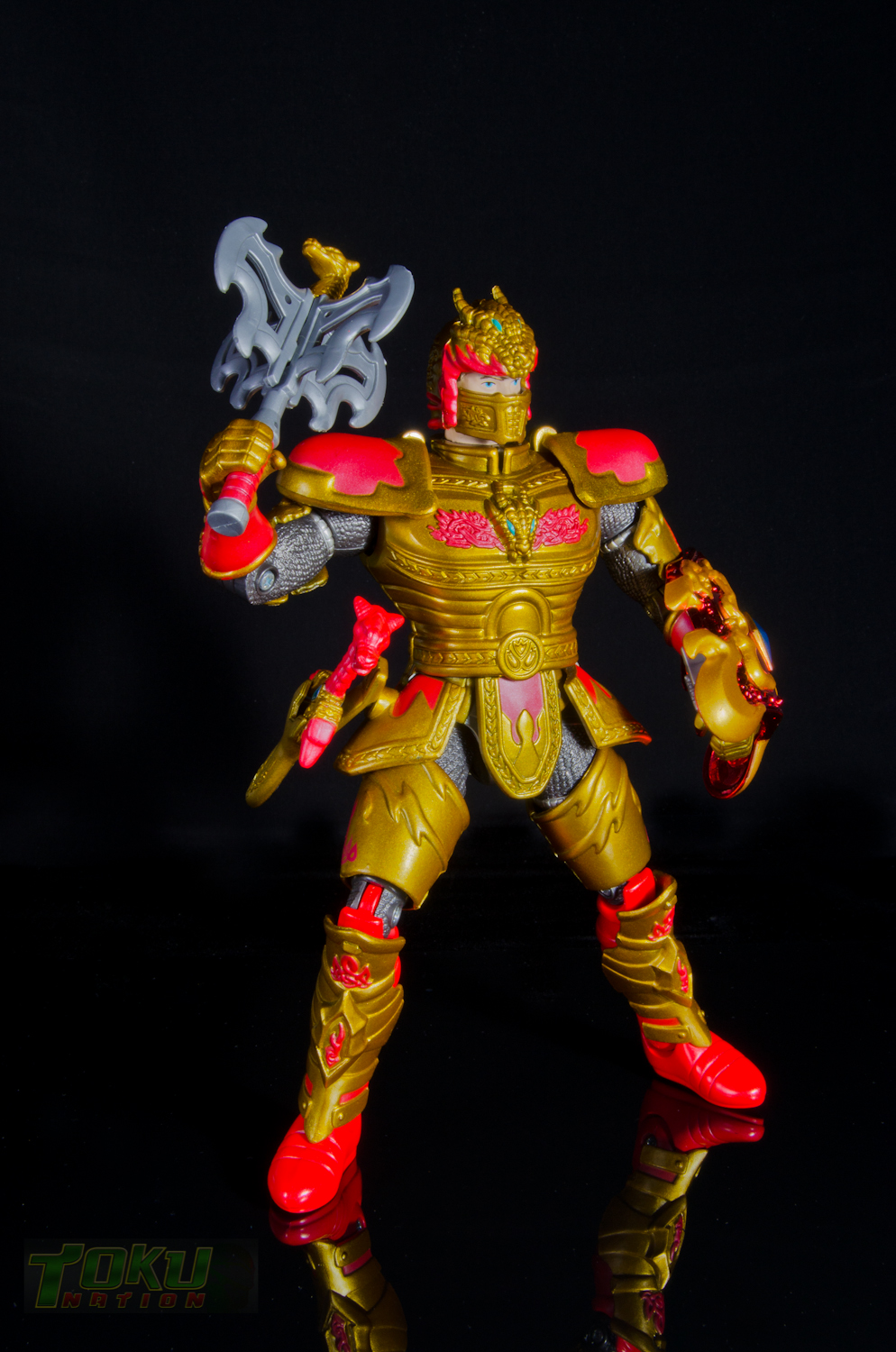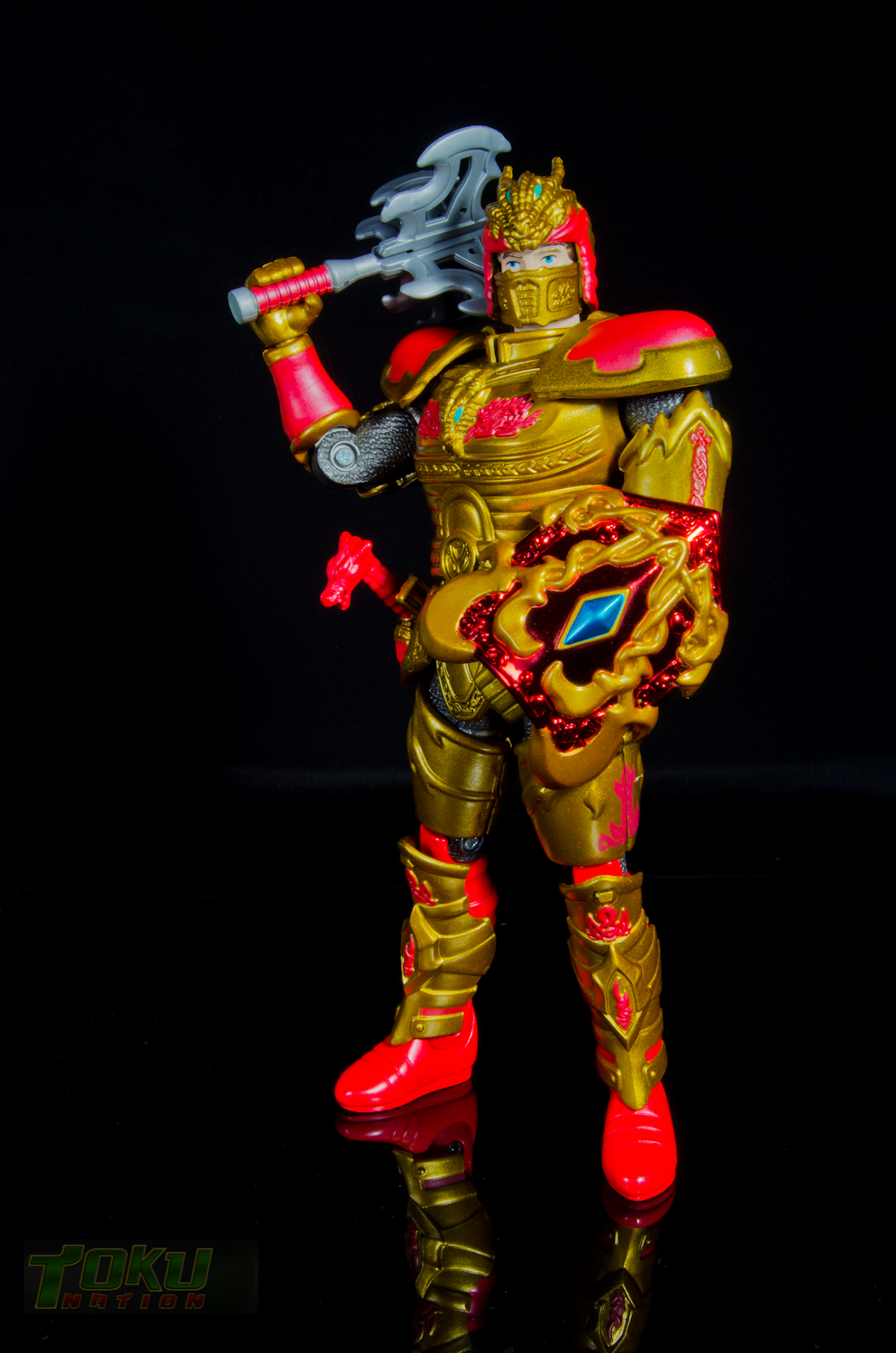 We're back with another gallery featuring Bandai of America's 1998 Mystic Knights of Tir Na Nog line and this time we're taking a look at the 8 inch Rohan, Mystic Knight of Fire. Simply put, everything that the 5 inch Mystic Knights do (you can check out the gallery of 5" Rohan here) the 8 inch figures do better. Rohan features 21 points of articulation, has 18 pieces of removable armor, and comes with The Sword of Kells, a smaller sword, an axe, a Dragon's Breath Dagger, dagger sheath, and a shield. Unlike the 5 inch version, this larger Rohan's shield cannot clip into DX Pyre's chest. Somehow, the designer's managed to accurately capture all of the gorgeous designs and details of the on-screen armor in this figure. Due to the way the chest armor and skirt pieces connect together, the hip/thigh articulation of the figure is not hindered that much. All of the armor pieces attach very securely to the figure and although there are some noticable seams, it holds together well. I would easily recommend the 8 inch versions of the Mystic Knights over their 5 inch counterparts, however, there are two drawbacks. First, it's extremely difficult to find one loose, complete, and for a reasonable price on the secondary market. Secondly, only Rohan, Angus, and Ivar were made in the 8 inch scale, leaving completionists pining for an in-scale Deidre. In the end though, the 8 inch Rohan is the best representation of the Knight of Fire that you can get and I highly recommend it to fans of Mystic Knights of Tir Na Nog, the suits, or just American Toku in general. |