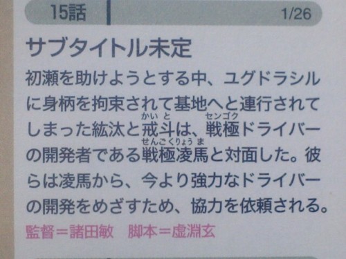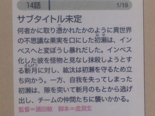 After somehow becoming obsessed and eating the strange fruit from another world, Hase changes into an Invess and rampages. Standing against Zangetsu, who tries to exterminate him on sight, Kouta tries to protect Hase. Hase, who’s lost his sense of self, takes the opportunity while Zangetsu is busy and escapes, going to attack his teammates. Episode 15, 1/26, not yet named: In the middle of trying to save Hase, Kouta and Kaito are brought into custody and taken to the Yggdrasil base, where they meet the developer of the Sengoku Driver, Sengoku Ryouma. They’re asked by Ryouma for their cooperation in developing an even stronger driver than before. (Translations via HenshinJustice.com) |