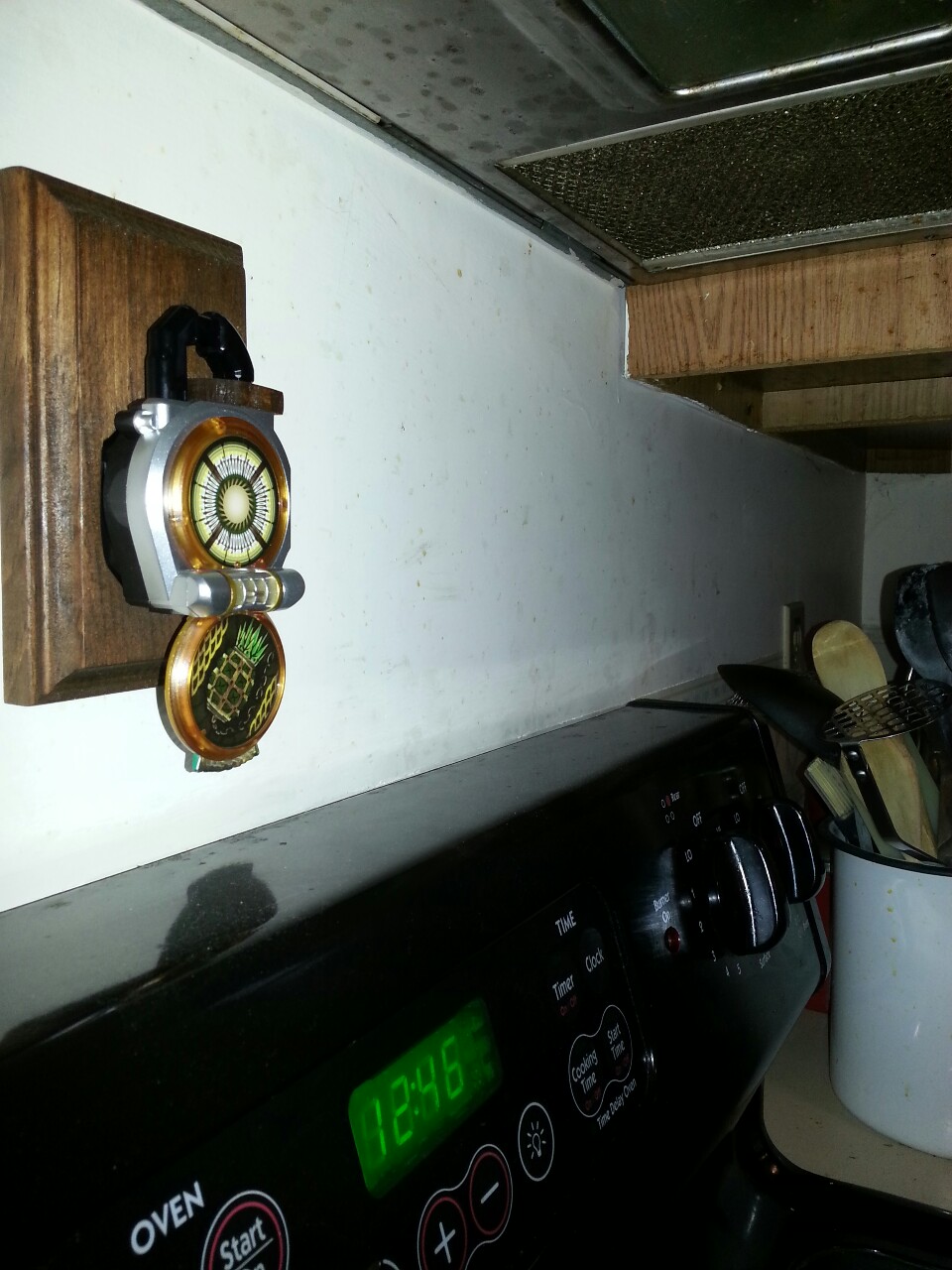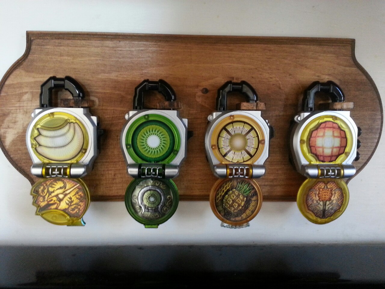 The plan is simple, buy four capsule toy Lock Seeds of my favorite fruit (banana, pineapple, mango, and kiwi) and mount them on a wood stained plaque from a craft store. This of course meant I had to somehow carve out a notch for each one...which was the first hurdle. I looked around and got myself a budge model Dremmel, a carving guide attachment, and a carving drum head. At first I was going to go all in on the first go of it...then I thought it might be best to do a test run on a cheaper, smaller, plaque seeing as I never in my life have used a Dremmel tool or attempted any kind of wood working outside of Shop Class. Good thing I did. The first attempt was butchered horribly, as you can see in the first few pictures. The notch was an awful rounded thing that showed gaps on the sides when mounted, I used the grinding head to sand the wood (which burned it horribly), and I mis-measured the placement of the locking piece, which also broke as I tried to attach it. ...but the proof of concept was there, and it looked cool. But, I still wanted to give it another try before going on to the final product. As you can see, my second go was vastly improved. I took my time, edged with a smaller carving head, and sanded by hand. The locking piece is still a bit rough (it's balsa wood so the carving bit chewed it up around corners), but it's damn good. **UPDATE** 01/18/14 Did the staining and seal coat today, which completes the prototype process. As you can see from the new pictures, the staining is a little uneven, but that's what the prototype is for. It looks great otherwise, especially when mounted on the wall. Although, supplies cost a bit more than expected for this stage, so unfortunately I have to wait until next paycheck to start with the final, larger, plaque. **UPDATE** 02/09/14 Carved out the slots for the large plaque, not nearly as clean as my prototype unfortunately, but it works. I'm waiting to get some better wood to make the locking pieces, Balsa wood gets eaten up by the dremmel bit and doesn't look at all presentable. **UPDATE** 04/12/14 It's finally done!!! As you can see from the images, there's a bit of a learning curve between the prototype and the final in many ways. I got better with the dremmel, used better wood for the locking pieces, and learned how to stain properly. I also learned that crazy glue was probably not the best way to attach the locking pieces, as, even if you sand it down, it does something to the wood that makes it damn near impossible to stain properly. Oh well. I'm happy with it, that's all that matters. Trying to decide what to do with the prototype piece. It's far from perfect so I wouldn't feel comfortable selling it. Maybe I'll see if anyone is interested in trading for a small gashapon toy or something. Message me if you are interested. As far as taking commissions for these things? I'm still on the fence. On the one hand, I have A LOT of stain left. On the other, I don't know if I've gotten good enough with the dremmel to start charging folks yet. We'll see what happens in the future. But for now, I'm going to enjoy my new kitchen decor!