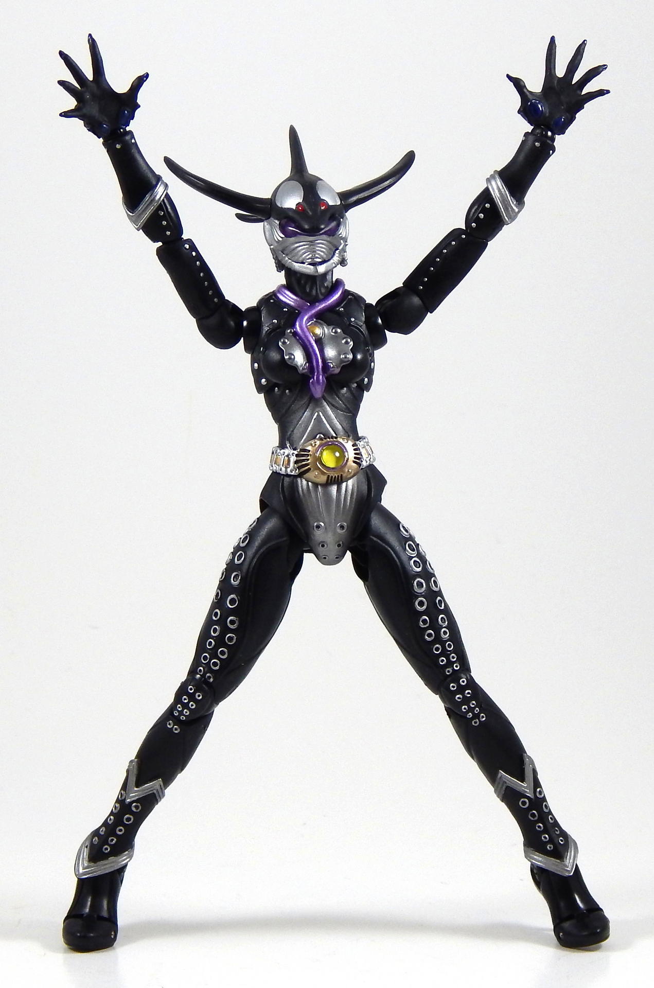 I was pretty upset for a few minutes, then I got on Mandarake and saw that it's current price was almost half of what I originally paid. So I ordered a replacement for 2500 yen plus shipping, and about month later, I received the replacement figure, so I started packing up the original Mezool, in case somebody wanted to buy a broken figure. And the other side of her cape broke off! The hinge just up and broke, same as the first side had done. And the new one didn't quite make me happy either, the upper torso kept popping off, when I was posing it. It doesn't just fall off at the drop of a hat, but it kinda feels like if you move the joint at all, it slowly works its way off the ball. Not exactly a problem, but definitely enough to be irritating when posing her a lot for a gallery. So I swapped top halves with the broken Mezool, and that one stays on better. The new one also was put in the tray wrong at some point (I'd guess at the factory), one of the tails on her cape wasn't in the right place, and got sandwiched around a corner of the tray, so it's got a funny squiggle in it now, which you can see in the pictures. Since I started with problems, I might as well finish them. She is a bit of a pain to balance. It shouldn't be a surprise, since she has thin, lithe legs (which I think look really good) and high heels, with a big funny shaped head and a cape, she's very top heavy. But, you may notice, I didn't have to use the stand for any of the standing poses. It took a few tries, but I could get her to stand with her feet close together, it was just kind of a hassle, and would have been easier had I used the stand. I will definitely use the stand for long term display, but I wanted to show that she could stand on her own. The other issue is that, of course, the cape restricts her arm movement. It's a decent design, made of 5 pieces, so there is room for movement, but they do get in the way, and since I broke the first one, I was somewhat hesitant to try and wrestle with the new one to much. Looking back at the pictures, I don't have one showing how far forward the arms can go with the cape on, because I never tried it. I seem to recall not being disappointed with the articulation when I first got the figure, so I imagine the joints/separations in the cape let her move her arms forward sufficiently, I just didn't do it this time around. Oh, and the belt, it tends to ride up the more you pose her, revealing the separation between the stomach piece and the crotch piece. I was always having to push it down (and I'm sure there are pictures where I didn't notice it had moved.) Alright, enough complaining about the figure, what do I like about SHF Mezool? Quite a lot. The paint is great, as expected. Like Kazari, she has a bunch of silver rings up and down her legs, and silver studs on her arms, and the paint is quite crisp and clean, and really stands out on the matte black of her body. It's hard to see, but her nails, the backs of her hands, and a little of the palms are a really dark, yet glossy blue, it's rather subtle, but looks pretty good. The sculpt is very good. The design is weird, I mean, she's got an orca for a head, an octopus body just hanging off her back, and a purple eel wrapping around her neck and coming to rest between her breasts. It's really rather strange, but I've always kinda liked it, and the figure pulls it off. The legs are nice and shapely. High heels make the leg muscles go a certain way, and the sculpt of Mezool's legs looks right. The cape has lots of folds and ridges and other details that make it look interesting. The articulation of the body underneath the cape is great. With the cape on she can extend her arms all the way out horizontally, though the cape starts looking pretty unnatural, but once both sides had broken off my original figure, I removed the back part of it as well, and just played with the figure like that. The shoulders look kinda crappy, since they have no covering (that was part of the cape's job), but I found the figure to be rather fun to play with, there's nothing to restrict any of the joints, and I've added capeless Mezool to my display shelf, alongside regular Mezool, since she's more free to be put in interesting poses. For example, she can it in chairs without her cape, and I did get caped Mezool into a pretty good sitting pose, with her legs crossed, if I had a stool for her to sit on, she'd look pretty natural. I liked the Greeed as characters, but beyond that, their designs are very interesting, that's one of the driving reasons I wanted the Figuarts, and they do not disappoint, despite all the complaining I did earlier about Mezool. As with Uva and Kazari, Mezool also has clear plastic for the eyes, but unlike them, hers doesn't really catch the light, so it's not particularly interesting looking. She comes with the same cell medal piles as Uva and Kazari, as well as a Tamashii Stage Act 4, 3 pairs of hands, gropey hands for reaching for things, hands that are hard to describe, open palms but closed figures for gesturing at things I guess? Or Karate poses? Or maybe it's for parade waving, I don't know. The last pair isn't quite fists, but kind of angled, with the thumb up like she wants to hold medals between the thumb and forefinger. I really wish I could find the SHF RideVendor so I had some individual cell medals, but it hasn't shown up on Mandarake that I've seen in the last 5 or 6 weeks. Finally, and this is sorta stretching to call it an accessory, because it's an integral part of the character design, she has a cape. It's made out of 3 pieces, back and two sides, and the two sides are comprised of two different cape pieces that are permanently attached to each other via a small plastic hinge that is apparently breakable. Anyway, clearly I talk too much in these reviews so let's wrap it up. I like the figure, it's pretty cheap right now (especially considering she was originally a Tamashii Web exclusive release), but I do ca