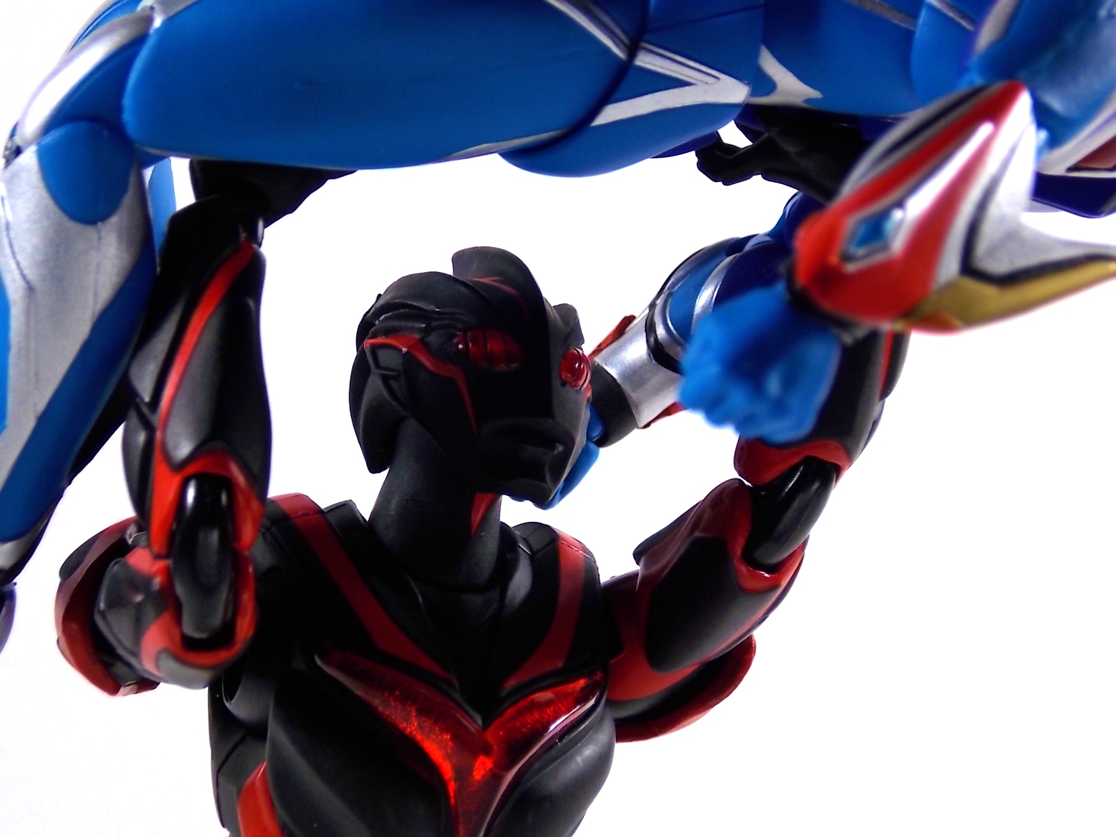 Ultra-Act Dark Zagi is the newest release in the Nexus series of UA's and it does not disappoint. (The companion piece Ultra-Act Ultraman Noa will be out this month and we'll be bringing you a gallery of it ASAP) A little background for those who missed this LWW segment. Dark Zagi is a being created by a race of aliens known as the visitors. The beings cloned Zagi from the powerful Ultraman Noa, after witnessing his ability to protect life. During the process however Zagi went insane and destroyed The Visitors homeworld. Gathering the Space Beasts together Zagi rampaged across the universe. An ensuing battle with Ultraman Noa, and a brief run in with the Showa Ultra Universe, would render Zagi without physical form and Noa almost entirely expended of energy. Both Noa and the visitors wound up on Earth predicting the return of Zagi there. Zagi arrived nearly 18 years before the beginning of the TV series and inhabited the body of a human who would one day become an integral part of TLT. Using this guise he killed and manipulated anyone and everything he could until the final episode of the series when he could finally seize Ultramans power to regain his original form. But just as before the mighty Noa rose up to defeat Zagi. A version of Zagi would later appear in Ultraman Ginga with much of the same rampaging personality. Now for the figure, for starters Zagi is absolutely gorgeous. Of all the recent Ultra-Acts which take advantage of improved design and quality in the line, Zagi is one of the best. Right up there with Ultra Seven Renewal and Father of Ultra. The deep almost blood red markings accent his black body very well and it gives off the most devilish look the form of an Ultra can achieve. Zagi may not have tons of accessories, but what he comes with is perfect for him. Of course there's the standard extra sets of hands, and even a beam effect to replicate his Lightning Zagi Attack. However this release goes the extra distance by including an explosion effect piece. One meant to go with Ultraman Noa to replicate their final struggle in the last episode of Ultraman Nexus. With Zagi in Space and Noa in Japan their twin beams met in the atmosphere with explosive force. This effect piece appears to be specifically molded on both sides to only accept either Zagi or Noa beam effects. The Nexus used in this photo shoot can sort of peg into it, but not securely. Also included is a small display base to hold this effect piece. Zagi has a fantastic range of motion, especially in his neck where it's the most needed to replicate his animalistic movements and contortions. This figure does the absolute best job of capturing the wild chaotic nature of this character. It's a welcome addition to any Ultra-Act fans collection.