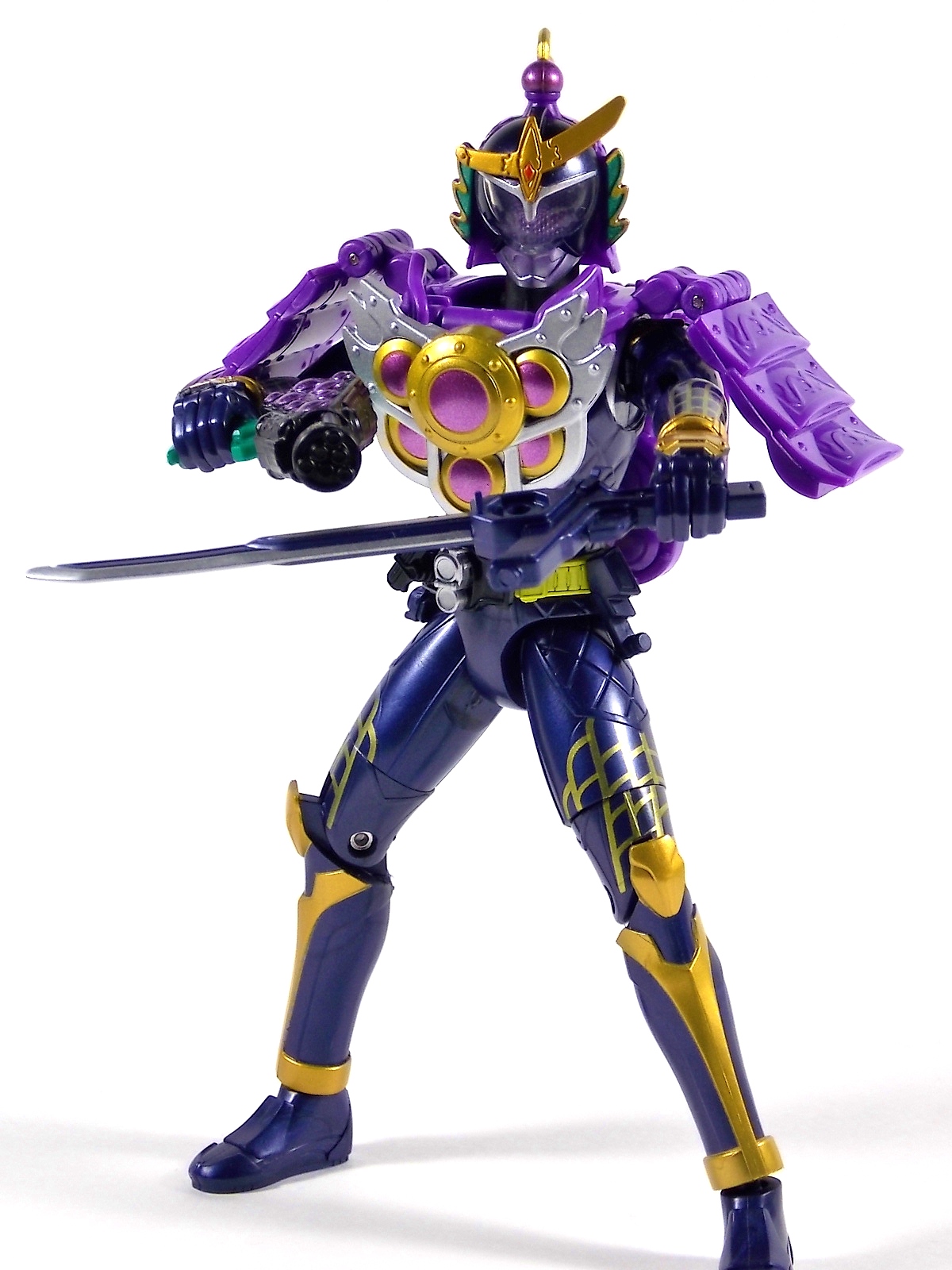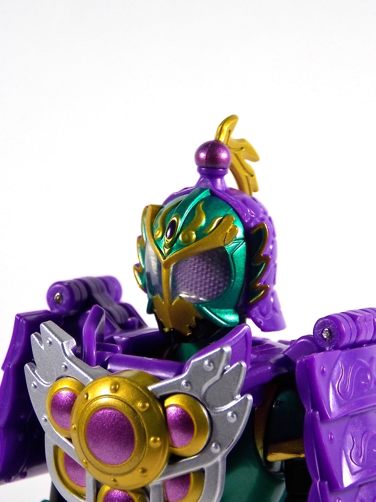Kamen Rider Ryugen is the next entry in the massively popular Arms Change line from Bandai. Ryugen is primarily based on a Chinese warrior motif and utilizes a ranged weapon rather than a melee weapon as the other initial Armored Riders do. He is also the younger brother of Zangetsu and heir to the Yggdrasil Corporation. But on to the figure! Arms Change Ryugen is another new remold of the base AC body type with some extra flare. The under suit itself minus the armor is actually really appealing on it's own, looking very much like an adept hand to hand fighter already. The loin cloth is also made of a fairly bendable rubber plastic so you can get it out of the way when needed. Even when you put Ryugen on a Lock vehicle. The Budou (grape) Arms goes back to basics like Orange, unfortunately shying away from the awesome asymmetry of Banana. But that by no means makes this a bad piece. Budou looks very similar to a paper lantern when on it's own, intentional or not I can't help but make this comparison. When combined with Ryugen the whole package looks absolutely gorgeous. The mixtures of gold, green, and purple couldn't be more perfect. They all compliment each other really well. And this armor does a much better job of folding up and out of the way than either Orange or Banana. The back panel can actually lay almost flush without much extra hang. These shoulders also provide a bit better range of motion than Oranger, and far more than Banana. A downside I've seen mentioned is that Ryugen can't seem to hold the Dragon Shot well. Mine seems capable of it. You just have to press the fingers inward once you get it in his hand, I've yet to really have much issue. But once you do it right it's solid. Overall Ryugen is another lovely addition to the line that is really enjoyable and looks great. Doing a little Arms Changing both Orange and Banana work really well on Ryugen, Especially Banana. However Budou looks terrible on pretty much anything but Ryugen The purple clashes with the other base suits quite a bit. Prices for the Arms Change figures have continued to sky rocket week after week and Ryugen is no different. Prices now range anywhere from $50-100 for the figure so if you can find a good deal, take it.