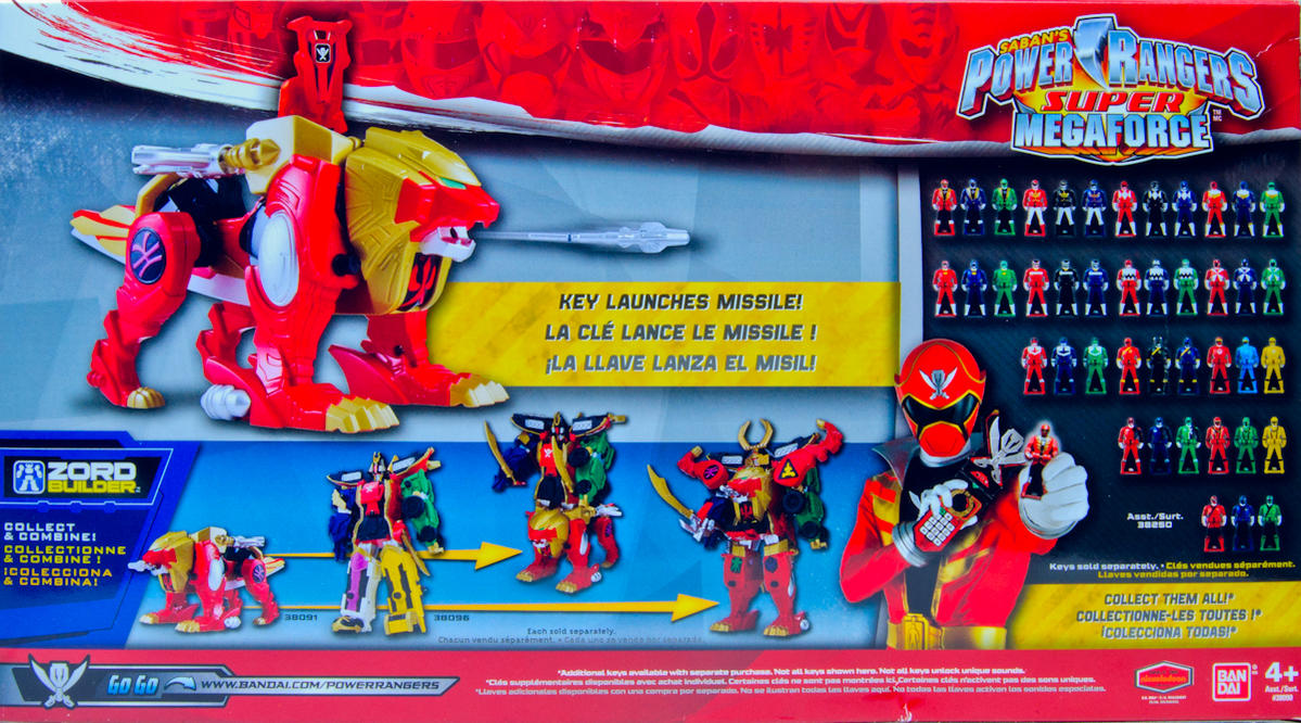 The new season of Power Rangers Super Megaforce is underway and today we're taking a look at the DX Wild Force Red Lion Zord from the Super Megaforce toyline. The figure is a Bandai of America adaptation of the DX Gokai Machine Gao Lion from Kaizoku Sentai Gokaiger and in turn, represents the Legendary Power of both the Power Rangers Wild Force and Power Rangers Samurai teams. As part of the Zord Builder line, Red Lion is chock full of ports and pegs that allow for an endless amount of combinations with other compatible figures. Aside from the standard 'Lion' mode, there are two other configurations shown in the instructions that utilize parts of the Fire Smasher, helmet crest, and 'boosters'. Red Lion comes packaged with a Wild Force Red Ranger Key that can be used to launch simple pressure missiles from the Lion's mouth. The Key can also be used to open the chest panel of the Legendary Megazord and again, fire a missile. The figure breaks down into 12 separate parts and can be combined with the DX Legendary Megazord to form 2 different combinations. The first is a 'Centaur Mode' similar to the configuration the 'Giant' Red Lion and Wild Force Megazord had in Wild Force and the second is a take on the combo seen in-show. This second combination, yet-to-be-named in show, is a solid configuration and possibly one of the best Auxiliary Zord powered-up forms we've seen from this toy line. The 'Wild Samurai' combo can wield an over-sized Fire Smasher as it's weapon or the standard Sabers can attach to the Lion's 'boosters' to form a long, double bladed staff. Overall, The Wild Force Red Lion auxiliary Zord is a fun figure and a 'decent' representation of it's on-screen counterpart that also offers a lot of play value. So far, the only downside to this figure is how hard it seems to come by. |
