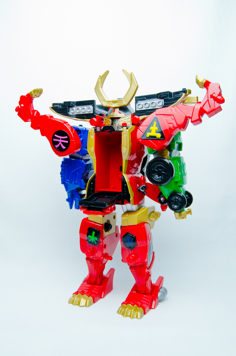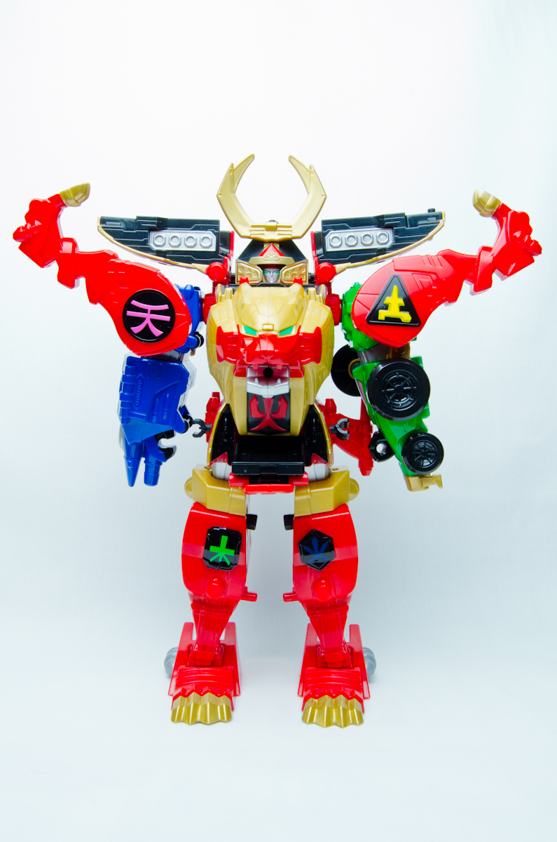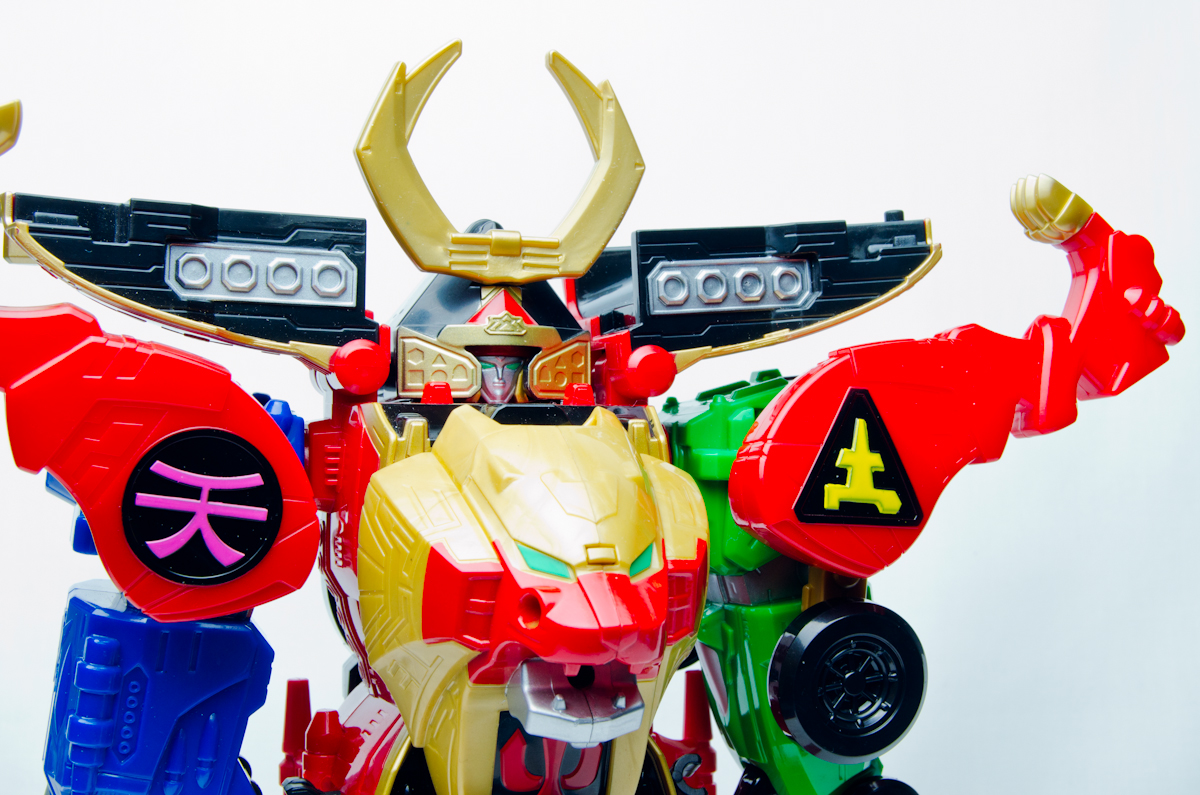 The combined mode is awful. I have seen so many people try and defend it by saying it looks more "streamlined" or "samuraiesque" or what have you (neither of which are particularly true), but it in reality it just looks dismal compared to Samurai Gokaioh. The legs sticking out over the shoulders do not even slightly look like shoulder pads, they just look like lion legs sticking out the sides. There has been no effort to hide that.
