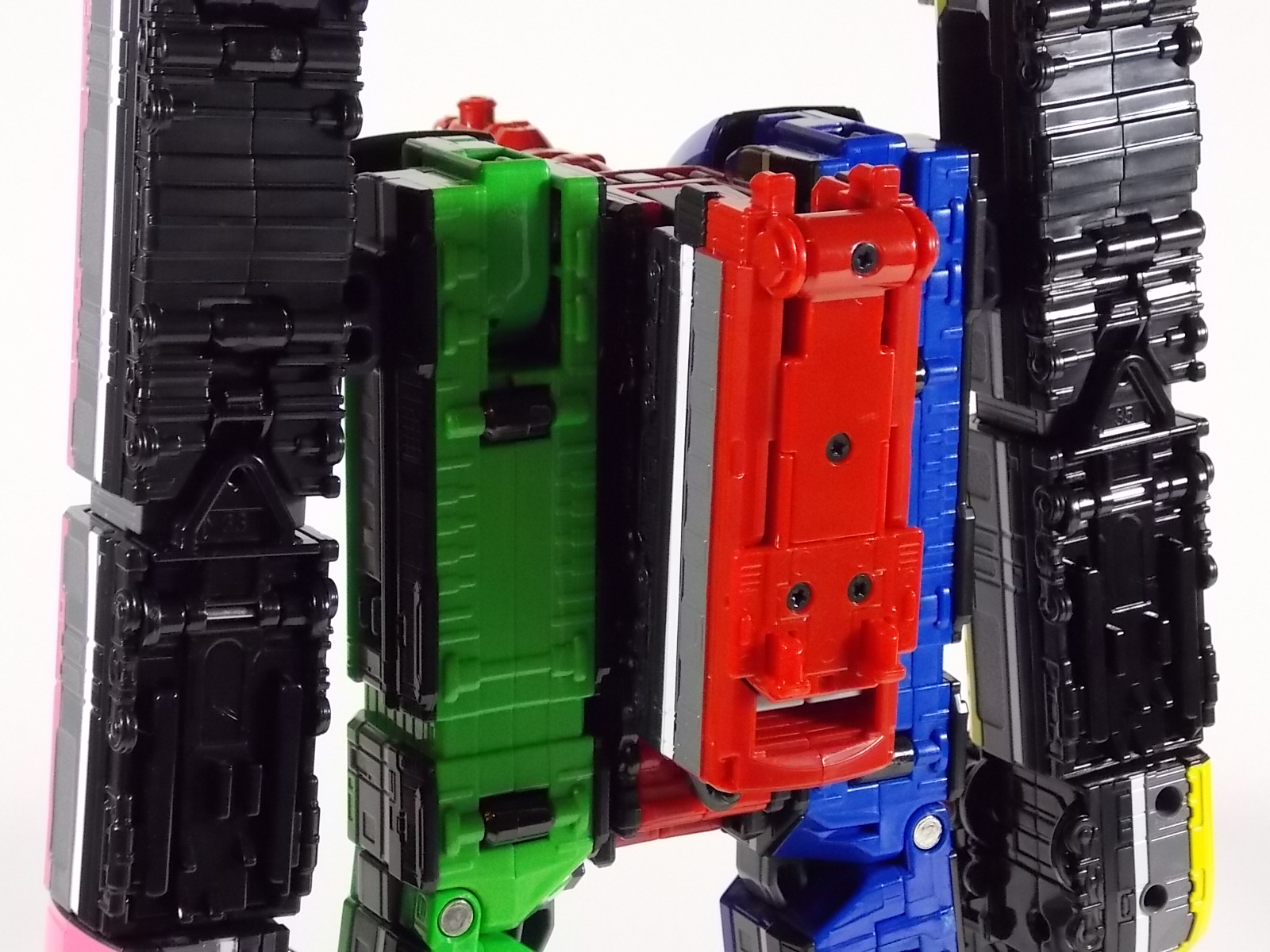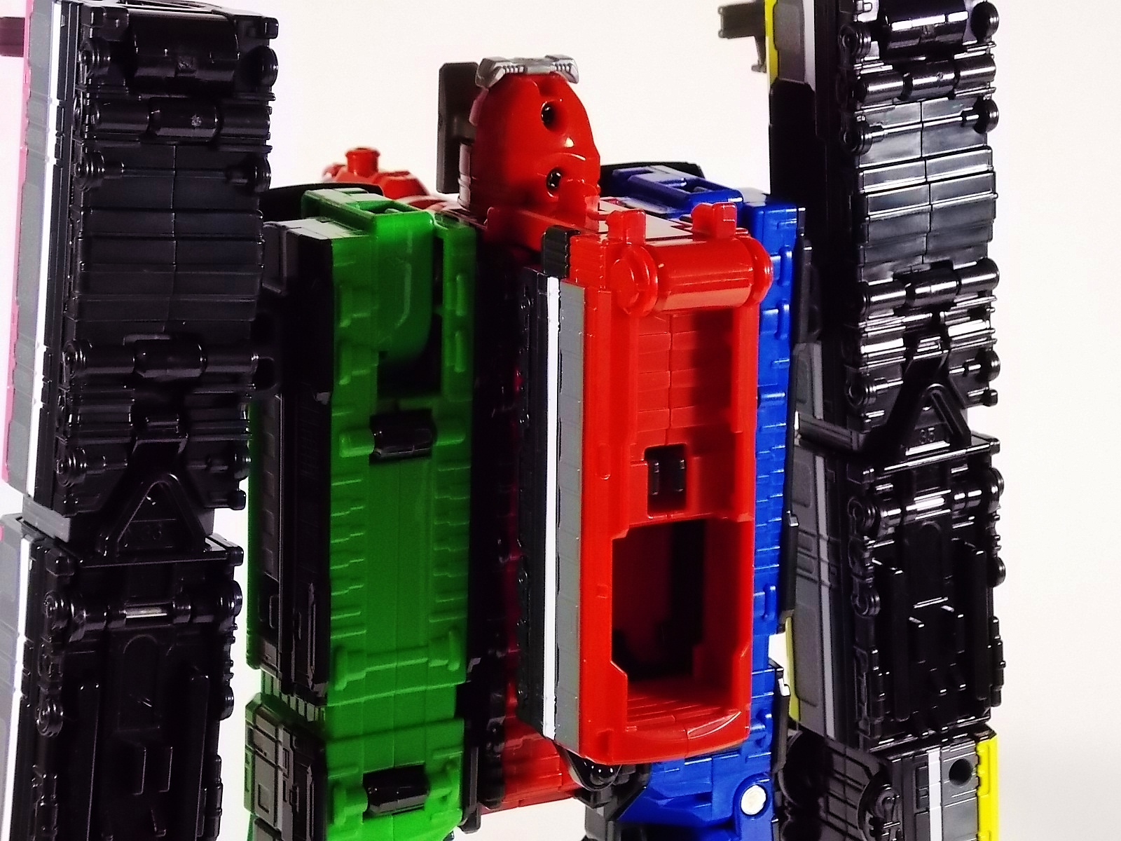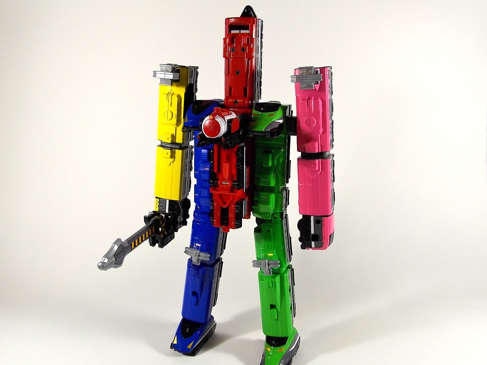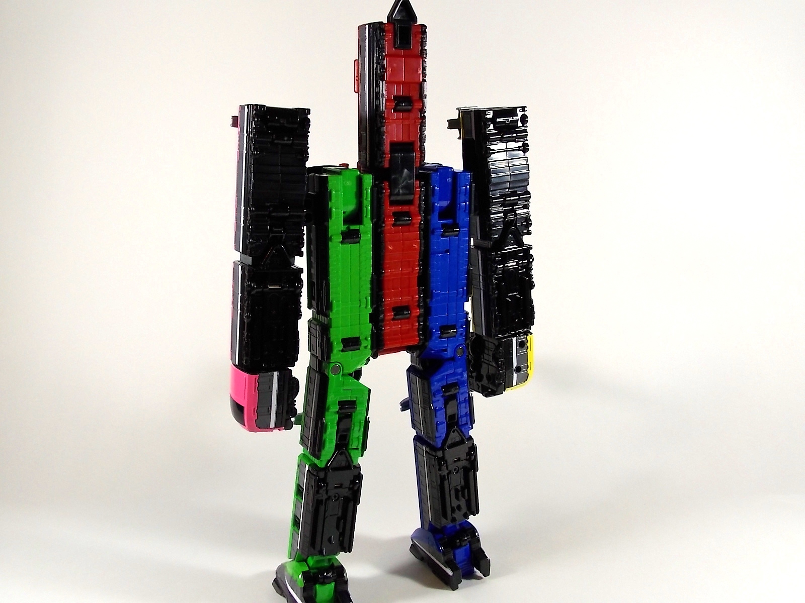 **We've got so many images that this bad boy takes up 80 images across two posts! Scroll down to the second post of this thread to see the second half! DX ToQ Oh is of course from everyone's favorite new train themed sentai, Ressha Sentai ToQger. And though we're only 3 episodes into the series it's already shaping up to be a really fun rider But enough about that, onto the toys! DX ToQ Oh is composed of the 5 main Resshas (trains) from the series. Red, Blue, Yellow, Green, and Pink Resshas. Plenty of people have expressed concerns that this mecha both on screen and in toy form is plain and simplistic. Let me assure you it is neither. To start with the Ressha's themselves are more complex than one would initially think. Out of the box they are each one long train piece with no moving parts. However, in the midsection of each Ressha is a really nice square connecting joint. Some pressure tabs hold these joints in place but I can safely say they are some of the sturdiest connections you'll find on a sentai robo. When released you can flip out an alternate tab underneath the peg that can hitch the two "cars" of each Ressha together. Thus giving them a moveable joint in the middle like the linkage between real rail cars. This joint is what also allows you to remove the main engine of each Ressha, to use them with the DX ToQ Changer. That's right, each forward section of the Resshas is fully compatible with the Changer. Small sets of tabs placed at varying intervals on the bottom of each car determine how the Changer detects them. Of course the secondary cars can not be used in this manner. But more to the point the joints in the middle of each train allow you to create one very long vehicle. These trains may be small but they more than make up for it in functionality. While the size has been a point of contention with this set, reasonably so, in hand you really don't notice. This set really needs to be seen in person to appreciate it. Neither my pictures nor baltmatrix's review can really get the point across the same way actually handling it would. To combine the resshas for ToQ Oh you can 100% mimic the TV counterpart. The Resshas line up in a row, then very nice very awesome sliding locks on either side of the Blue & Green Resshas slide right into place on Red. These are very firm connectors and Bandai NEEDS to use them more. Pink & Yellow have fold out peg joints to plug into the shoulder so that's pretty straightforward. Then we need to do the naughty bit of the transformation and fold up Red Ressha. Some traditional Bandai DX clips hold this piece in place but the ammount of force needed to use them is minimal. We probably won't see the same kinds of breakage occur like last year with Kyoryuzin. And in fact these clips are strategically placed all over ToQ Oh. We will most certainly be seeing some big combos when other Ressha are introduced. The clips on the bottom of both feet, the sides of the legs, and the tops of shoulders strongly imply this. Now you just need to fold the feet up and rotate the hands. The feet by the way have a pair of locks on them so they don't rotate while the robot is standing, much like DX Gosei Great. Again very smart, and very secure, thanks Bandai! Then rotate the shoulder pads down, stand him up, fold the second half of Red Ressha down, and pop the head up! Oh and open the awesomely detailed train "doors" that conceal the head, and ToQ Oh is formed! There's also the included train crossing themed sword Fumikiriken. Nicely enough it can be stored on Red Ressha while in vehicle form. Looking at this set as a whole I am impressed, damn impressed. Bandai has cleverly engineered this thing. It's as efficient as it can be and really pulls off the look of it's show counterpart. Could it have elbows? Sure, but then you would loose the separating pivoting joint the cars use in train form. Overall this is a very impressive piece that still stacks up well to the last few years of sentai DX robos. If anything it's size is indicative of much larger combinations to come just like the DX Go-Buster Ace of 2 years ago. I HIGHLY recommend you pick this set up. The Ressha modes are really well done with absolute mountains of detail and the Robo mode is a joy to see and handle. A+ Bandai!