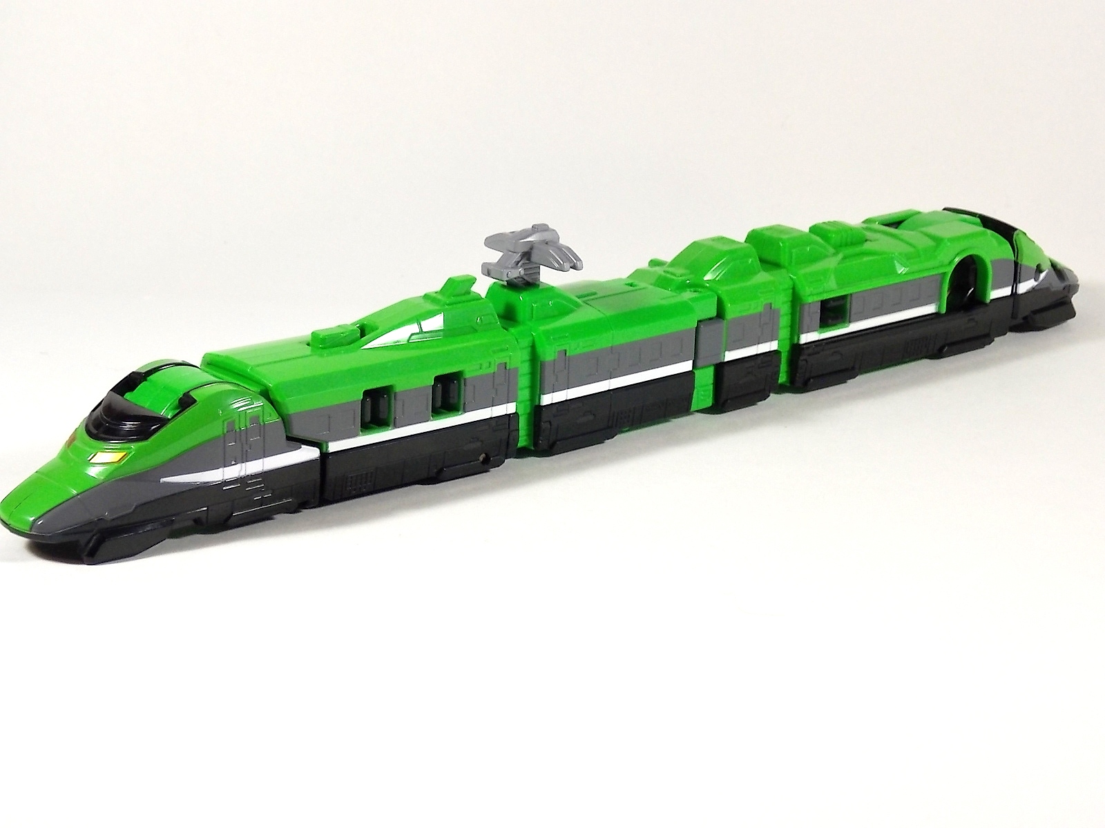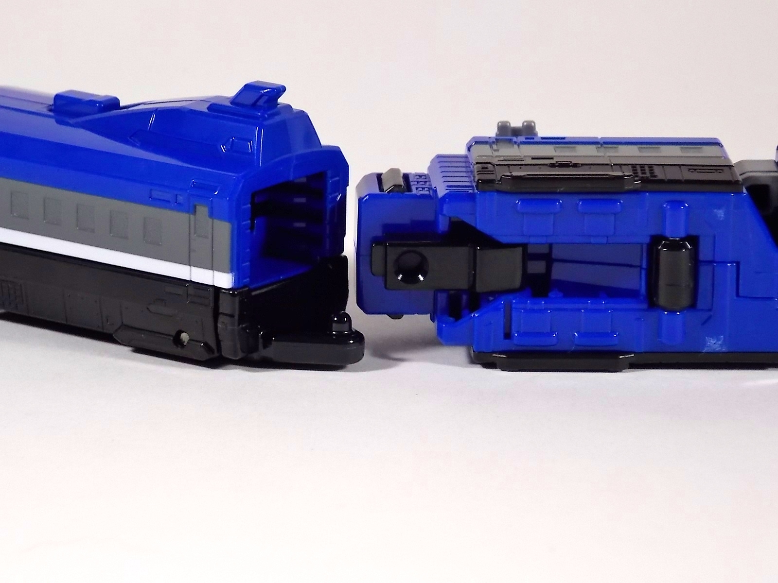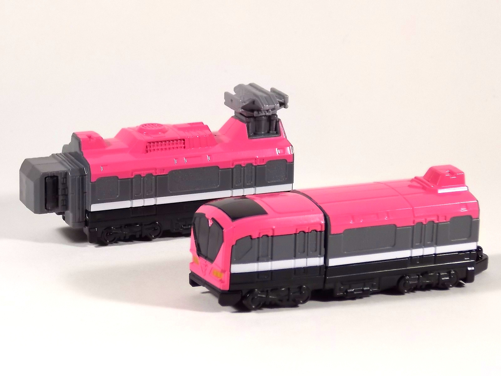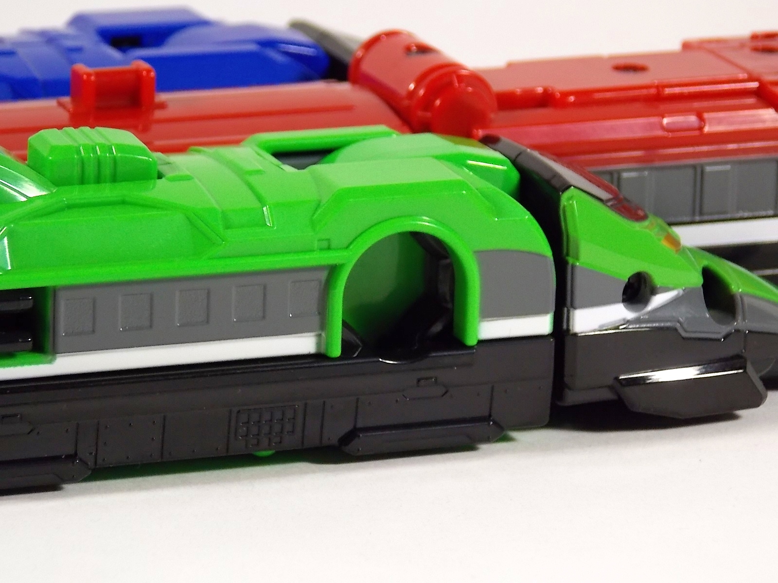 **We've got so many images that this bad boy takes up 80 images across two posts! Scroll down to the second post of this thread to see the second half! DX ToQ Oh is of course from everyone's favorite new train themed sentai, Ressha Sentai ToQger. And though we're only 3 episodes into the series it's already shaping up to be a really fun rider But enough about that, onto the toys! DX ToQ Oh is composed of the 5 main Resshas (trains) from the series. Red, Blue, Yellow, Green, and Pink Resshas. Plenty of people have expressed concerns that this mecha both on screen and in toy form is plain and simplistic. Let me assure you it is neither. To start with the Ressha's themselves are more complex than one would initially think. Out of the box they are each one long train piece with no moving parts. However, in the midsection of each Ressha is a really nice square connecting joint. Some pressure tabs hold these joints in place but I can safely say they are some of the sturdiest connections you'll find on a sentai robo. When released you can flip out an alternate tab underneath the peg that can hitch the two "cars" of each Ressha together. Thus giving them a moveable joint in the middle like the linkage between real rail cars. This joint is what also allows you to remove the main engine of each Ressha, to use them with the DX ToQ Changer. That's right, each forward section of the Resshas is fully compatible with the Changer. Small sets of tabs placed at varying intervals on the bottom of each car determine how the Changer detects them. Of course the secondary cars can not be used in this manner. But more to the point the joints in the middle of each train allow you to create one very long vehicle. These trains may be small but they more than make up for it in functionality. While the size has been a point of contention with this set, reasonably so, in hand you really don't notice. This set really needs to be seen in person to appreciate it. Neither my pictures nor baltmatrix's review can really get the point across the same way actually handling it would. To combine the resshas for ToQ Oh you can 100% mimic the TV counterpart. The Resshas line up in a row, then very nice very awesome sliding locks on either side of the Blue & Green Resshas slide right into place on Red. These are very firm connectors and Bandai NEEDS to use them more. Pink & Yellow have fold out peg joints to plug into the shoulder so that's pretty straightforward. Then we need to do the naughty bit of the transformation and fold up Red Ressha. Some traditional Bandai DX clips hold this piece in place but the ammount of force needed to use them is minimal. We probably won't see the same kinds of breakage occur like last year with Kyoryuzin. And in fact these clips are strategically placed all over ToQ Oh. We will most certainly be seeing some big combos when other Ressha are introduced. The clips on the bottom of both feet, the sides of the legs, and the tops of shoulders strongly imply this. Now you just need to fold the feet up and rotate the hands. The feet by the way have a pair of locks on them so they don't rotate while the robot is standing, much like DX Gosei Great. Again very smart, and very secure, thanks Bandai! Then rotate the shoulder pads down, stand him up, fold the second half of Red Ressha down, and pop the head up! Oh and open the awesomely detailed train "doors" that conceal the head, and ToQ Oh is formed! There's also the included train crossing themed sword Fumikiriken. Nicely enough it can be stored on Red Ressha while in vehicle form. Looking at this set as a whole I am impressed, damn impressed. Bandai has cleverly engineered this thing. It's as efficient as it can be and really pulls off the look of it's show counterpart. Could it have elbows? Sure, but then you would loose the separating pivoting joint the cars use in train form. Overall this is a very impressive piece that still stacks up well to the last few years of sentai DX robos. If anything it's size is indicative of much larger combinations to come just like the DX Go-Buster Ace of 2 years ago. I HIGHLY recommend you pick this set up. The Ressha modes are really well done with absolute mountains of detail and the Robo mode is a joy to see and handle. A+ Bandai!