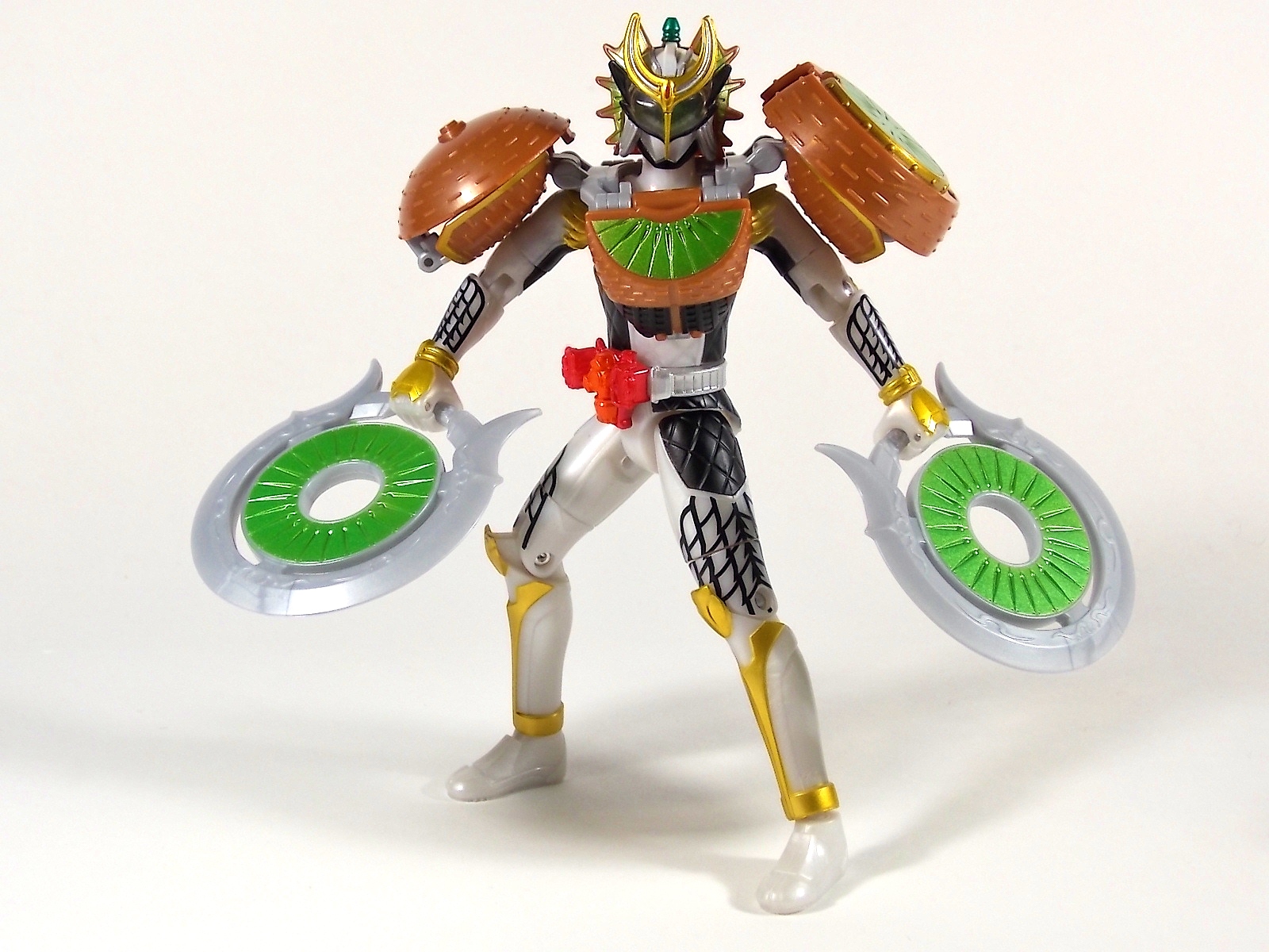 Time for another winner from Bandai's Kamen Rider Gaim Arms Change line! **Post #2 features additional images of alternate Arms Changes. AC08 Shin Zangetsu is at a basic level, an easy repaint, and slight retool of the standard AC05 Zangetsu figure. The base body is nearly identical to Zangetsu, itself a repaint of Gaim. The head has been remolded and the Sengoku Driver replaced by a Genesis Driver. The peg hole to accommodate the Musou Saber holster is also absent from this version of the mold. Aside from these three physical changes the rest of the body is differentiated only by paint applications. The Melon Energy Arms themselves are radically different from the standard Melon Arms. At first glance they do share the same hue of green as well as the same fruit engraving/detailing. However the Melon Energy Arms is far more complex than simply folding out symmetrically. The Energy Riders have begun a trend of new radical asymmetrical transformations for their arms. What began with Baron's Banana Arms has carried over to these newer releases in fantastic fashion. The only downside is that even in his Energy Form, Zangetsu still has half the Melon hanging off his back. But in this case it remains useful as storage for the Sonic Arrow weapon. On that subject the arrow is amazingly nice. The bowstring is actually hinged so that it can be pulled backward and forward as needed. However this feature is almost entirely wasted since the figure can just barely hold the Sonic Arrow in the first place. The handle, much like the Dragon Shot and Kiwi Gekirin, is simply too thick for an effective grip. And attempting to reach either arm across the chest to pull the string results in some infuriating clearance issues. Of course the Energy Riders are a new breed entirely for this series. Their powers aren't capable of interacting with the basic Armored Riders without the aid of a Genesis Core or an entire Genesis Driver. But with Arms Change being what it is you can totally slap the energy arms onto the previous releases in the line. Unfortunately it looks quite bad on just about everyone. The Melon Energy Arms is far too specific to Shin Zangetsu for proper use with anyone else aside from the original release of Zangetsu. Similarly to the original Zangetsu, Shin looks pretty good with most other Arms. Though Orange and Budou simply look terrible on him. As a stand alone figure Shin Zangetsu is still excellent. In all honesty it feels like an improvement on the original figure. As the first of the energy riders it seems to miss the mark ever so slightly in the form & functionality departments, but it's still a really nice looking figure and a welcome addition to any Arms Change collection.