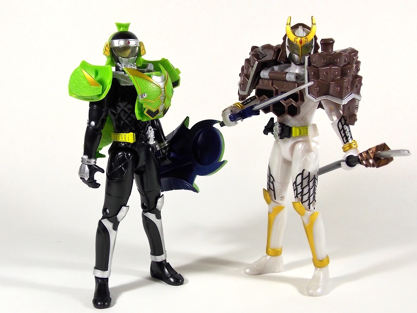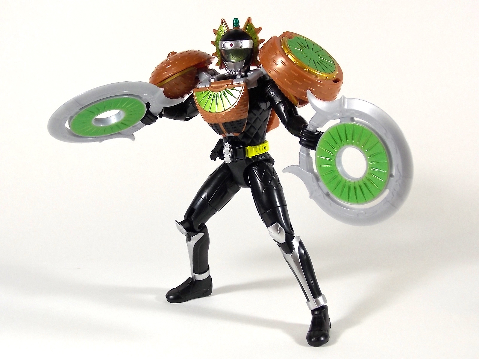 Once again it's time for a Kamen Rider Gaim Arms Change gallery! The subject of today's gallery, the late great Kamen/Armored Rider Kurokage! **Post #2 contains images of the Tulip Hopper Lock Vehicle This figure is intended to represent Ryoji Hase AKA Armored Rider Kurokage. However he's double packed with the Tulip Hopper vehicle, so far seen to be used by the Mass Produced Kurokage Troopers. However the belt of this figure is yellow, like the first 6 armored riders, the production model belts of the troopers are silver. Really this figure fudges the details just enough that it could be troop built as Kurokage Troopers, or stand in just fine as a standard Kurokage. The inclusion of the Tulip Hooper suggests that Bandai may want us to troop build this release. The base body of Kurokage is yet another repaint/slight remold of Gaim. Like Gaim & Zangetsu/Shin he has the same base suit patterns and molding right down to the shoulder ruffles, which sadly are not painted. Nor should they be. Because the Kurokage suit pre-arms has no details to speak of, of course this figure should accurately portray that. And it does, devastatingly so. The lack of any real paint applications to the generic black plastic of Kurokage makes him feel very cheap. The overwhelming plastic odor he has out of the box doesn't help matters either. The head is of course new but that's pretty much it for the base body. It even still has the hole in the waist for a Musou Saber holster, though no evidence exists to suggest Kurokage or the Troopers have ever used one. The Matsubokkuri (pinecone) Arms is of course all new. It's brown coloration is just a tad off the standard Kurokage's coloration but is even further away from the Troopers. It has a fairly simple drop down transformation like many early Arms in the line. Once plugged on the shoulder armor folds down, but as it does you need to un-peg the sides from the brackets that actually hold them. Then it's simple matter of folding the front and back plate down to complete the look. The weapon of Matsubokkuri arms is the Kagematsu. This spear itself also has a pinecone theme to it and looks pretty nice. The downside of the toy is that the spear is made of very flimsy black plastic. Gravity will bend it over time. Of course it should also be noted that Kurokage looks awesome with his partner in crime Armored Rider Gridon. The two actually fit each others Arms quite well. And on that topic, Kurokage doesn't look great in much of anything other than Matsubokkuri. Completely unsurprisingly he looks awesome in Banana Arms, as does everyone. However that's about it. Perhaps in Mango & OOO Arms he works as well. The cheap black plastic he's cast in clashes pretty badly with almost any other Arms. The Lock Vehicle Tulip Hopper is actually pretty nice. Being larger than the other Lock Vehicle you'd think it would have more weight to it, it doesn't. It has a smooth transformation to walker mode and actually accommodates an Arms Change pilot pretty well. There are pegs to plug the feet onto as well as handlebars for a figure to grab. As a toy it may not do much but if you've seen it's debut episode then you know the Tulip Hopper packs a punch in ways that simply can't be carried over to toy form. And hey, check the last image, it has a convenient lawn chair mode ![]() Although Kamen Rider Kurokage feels a bit cheaper than his predecessors he does a fantastic job of replicating the his on screen counterpart. Though again the details have been fudged a bit. And his included vehicle is quite fun. With Kurokage that officially rounds out the initial Sengoku Driver users aside from Mister Dangerous himself, Kamen Rider Bravo, who is a Bandai Premium Exclusive scheduled for release alter this year. Check back with us next month for a gallery of the next release in the Arms Change Series, Gaim Jinba Arms!