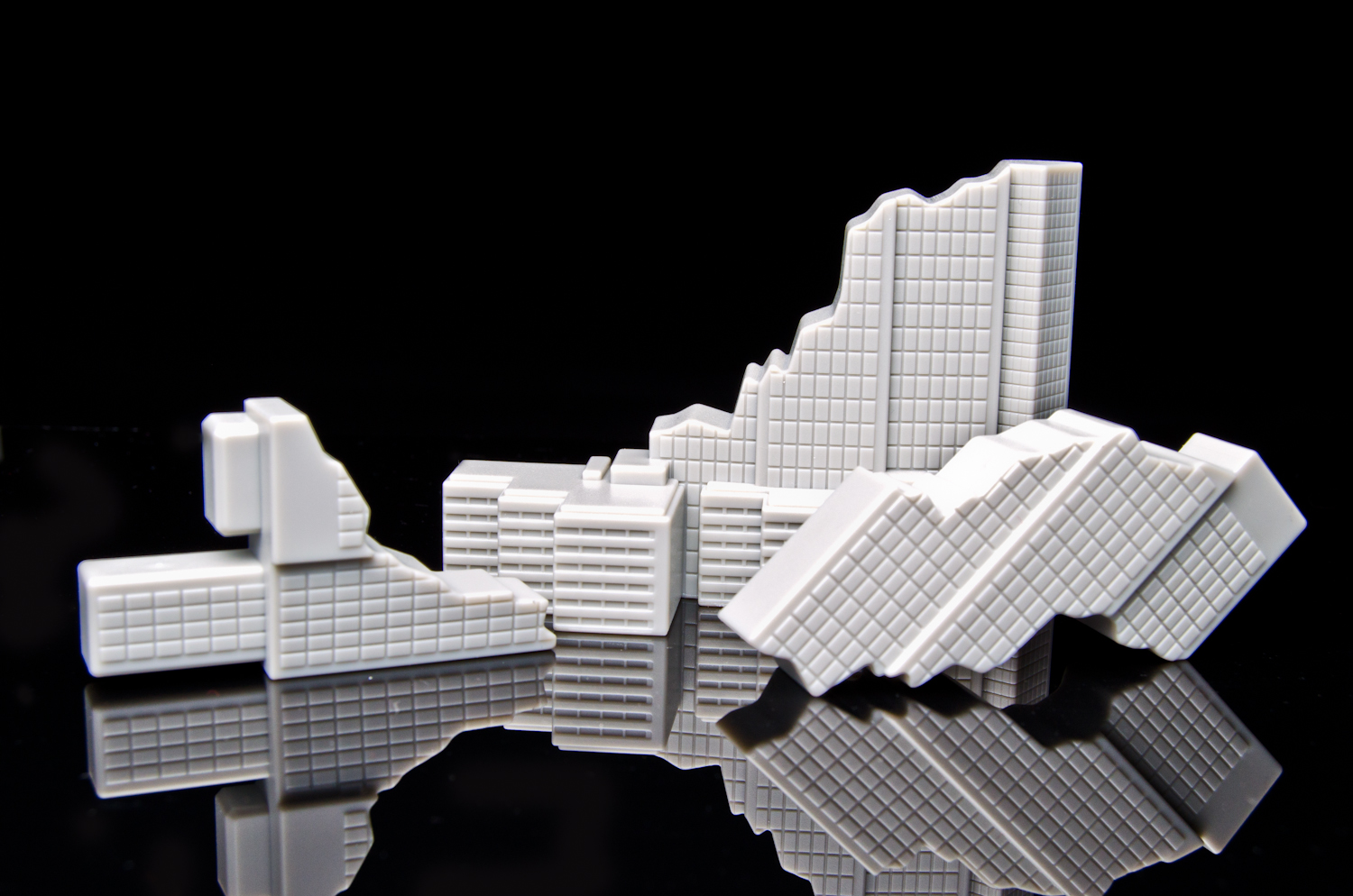 The set includes a Godzilla figure, a 'Muto' figure, 7 building pieces, 2 bridge pieces, 2 jets, 2 helicopters, and 1 battleship. Godzilla stands at approximately 3 inches tall and only has limited forward and backward movement at the shoulders and hips. Despite it's small size, there is a lot of intricate sculpted details all over the figure and the paint applications are minimal but effective. The 'Muto' figure also stands at approximately 3 inches tall and does not have any articulation. The figure has some detailing on the head and is cast in a reddish-black plastic. All of the vehicles in the set a little over in an inch in length and are cast in a mid-grey plastic. The helicopters do have moving rotors despite the reduced scale. The buildings are simple, molded in a single color, but they do have a lot of fine details on them from the windows to the numbers on the 'warehouses'. The different pieces do not clip or lock in place to form buildings, they just sit on top of one another. Overall, the Destruction City pack from the Godzilla line is a fun set with a lot of playability. |
