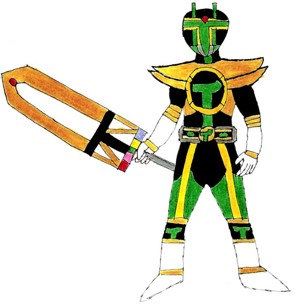 And here is my second Idea, "The Nation." Seeing as Kickback loves King Ranger, that was who he's based from. His motif is T's and N's, with a T and two Ns (One reversed) being his visor. He wields the TokuSword, powered by the beliefs and hopes of the TokuFan. His Henshin Item is the TokuNation Belt, with a Green T and Yellow N piece being put into the buckle. Hope you likey! :3 The Nation's final appearance-