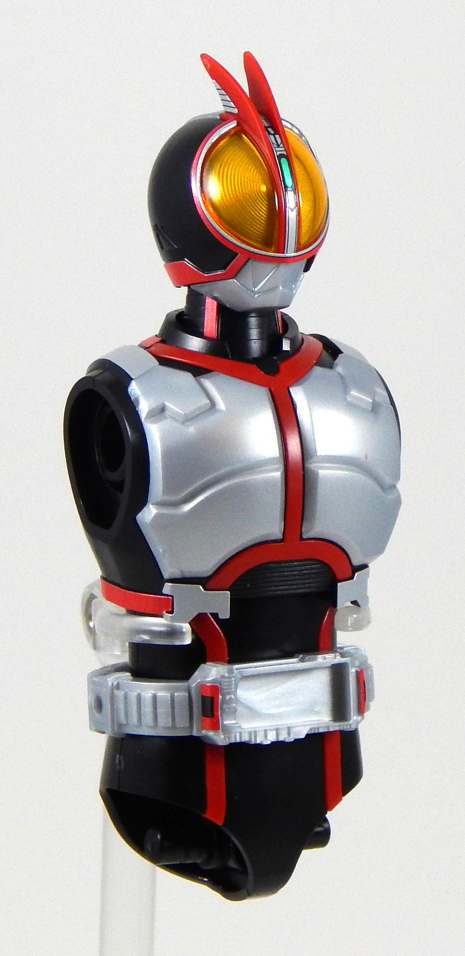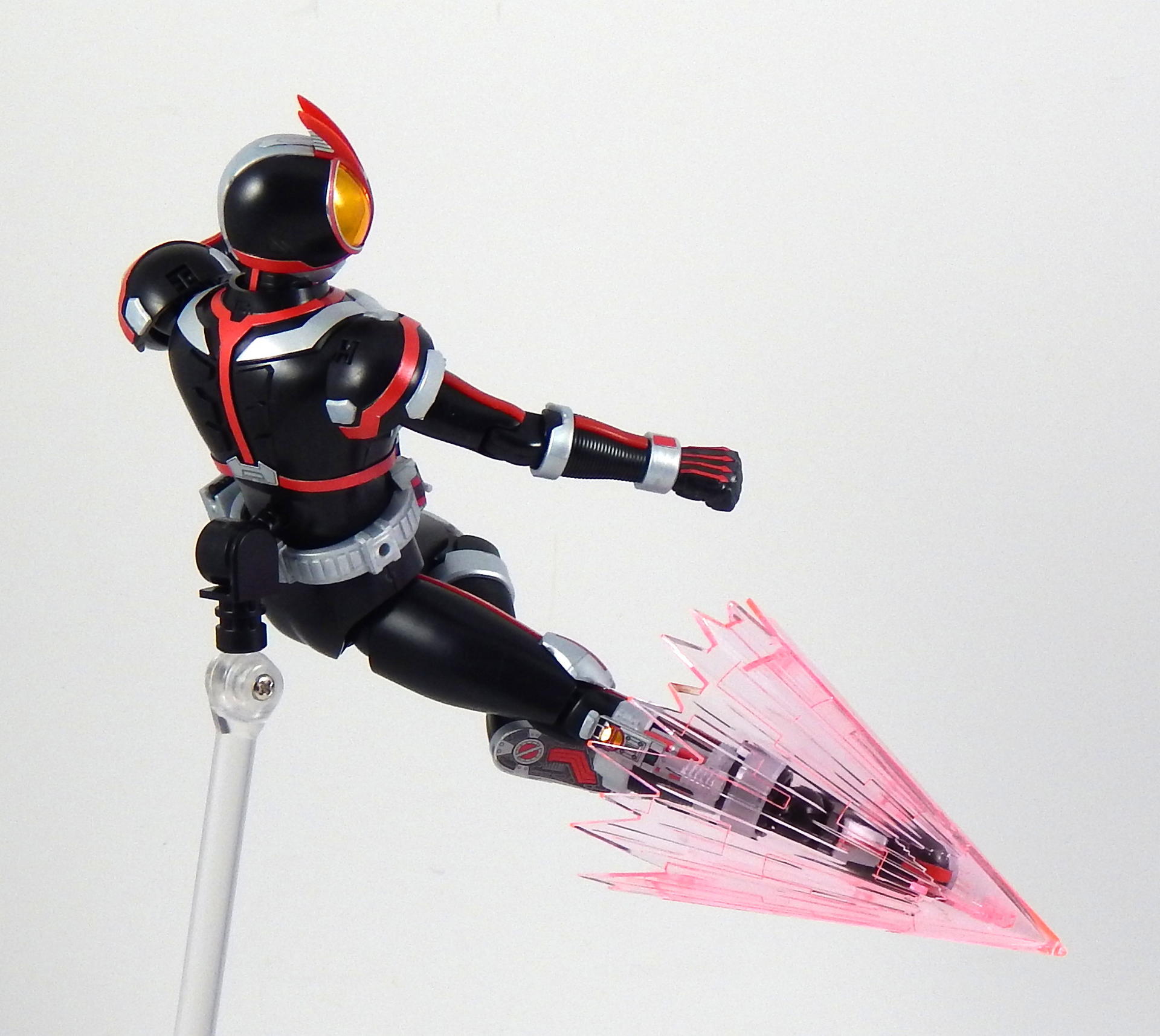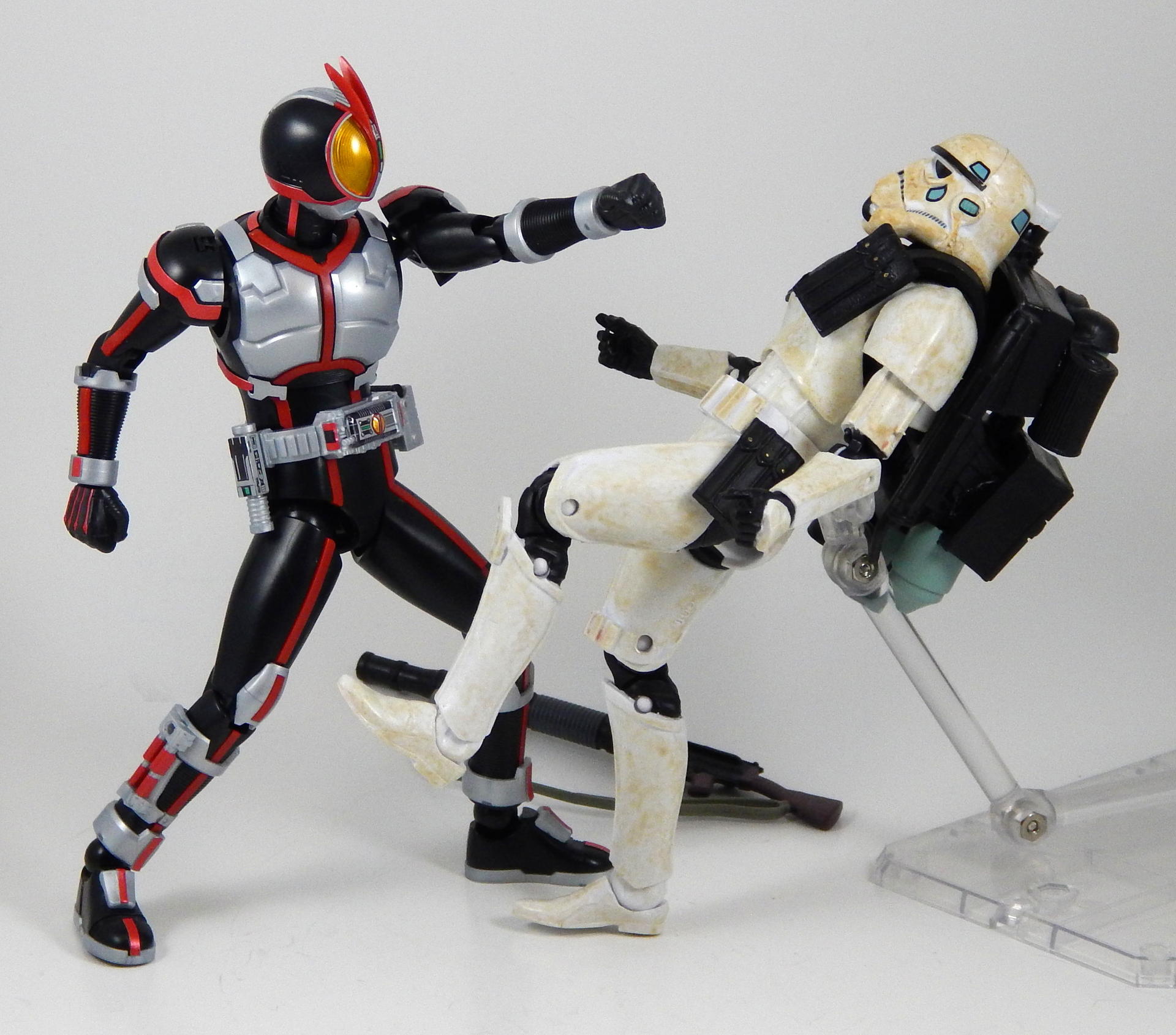 In short, this model kit was fun to build, it's quite detailed, it is very poseable, and has a great selection of accessories. It's a little bigger than the Figuarts, closer in scale to the Star Wars Black 6" figures and Marvel Legends. That's the minimum you should know about this kit. For further thoughts and info, read on. I have a smattering of experience with Bandai models, having assembled a couple each of Gundam High Grades, Master Grades and Real Grades, as well as some Kamen Rider Master Grade Figure-rise kits (TaToBa and all of the W kits, except CycloneJoker). This is my first experience with the Figure-rise 6 line, and it reminded me most of the more recent High Grade Gundam kits, in that it was both simpler than the Master Grade lines, but still surprisingly detailed. Consisting of 6 trees of parts (one of which is the stand, one being the effects pieces), Faiz doesn't have a super high parts count, but what he has is impressive. A lot of the detail is dealt with via stickers (there is an impressive sheet of around 60 labels), but a decent amount is managed through plastic. Take the red power lines all through Faiz' suit. It's about 50/50 split between red plastic and red stickers. The stickers are slightly metallic red, while the plastic is a more dull red, but the difference isn't all that noticeable. It is the main point where a Master Grade would be an improvement though, as I would expect much more of the red lines to be handled by plastic. I found the stickers to be a breeze to apply, even the longer straight ones weren't difficult to get aligned correctly. The only stickers that don't go one easily, or don't look pretty natural when applied, are those that go over the Mission Memory sculpts. It's hard to get them to lie smoothly on the big, rounded surface. The kit snaps together easily, everything fits together snugly. Some of the pieces require a decent amount of force to snap into place. I didn't push the arms into the shoulder joints hard enough at first, so you may notice that in some of the pictures there's a bit of a gap between the biceps and the shoulders. The articulation is quite good, nearly on part with a Figuarts, in most places. The biggest disappointment to me, is that the foot is one solid piece. I really like toys to have toe joints. The wrists are probably the most limited joint, with almost no range to them. Everything else is going to give you all the range you want. The two torso ball joints, in particular, I found to have a really good range of movement. The hips even hinge downward like the Figuarts to, allowing the legs to reach higher than the sculpt would otherwise allow (though it can introduce unsightly gaps in the sculpt in some poses). The figure is much lighter than the Faiz Figuarts, despite being a little bit larger. It balances very well, despite the light, plastic feet, though one of the one-legged poses I put him in require a couple extra minutes of fiddling with to get him to balance right. As for accessories, Figure-rise Faiz comes with everything he could possibly need for his default form, and a little more even. He has two pairs of hands, fists and open hands, and two gripping right hands. He has the Faiz Pointer in two modes, the Faiz Shot with working handle and holder, as well as an extra Faiz Shot sculpted into the holder. There are three versions of the phone, the Faiz Edge, and finally, there is the Axel Watch, which can attach to his left wrist. Comparing the accessories to those of the Figuarts, the Figure-rise versions are a little bit more detailed, in some respects, thanks to the stickers, but the Figuarts make up for it in paint. We get three variations on the Faiz Phone, one molded in gun mode (with a slight chunk removed from the handle so it fits in the gun-holding hand better). The other two phones are constructed of three pieces and are functional in ways I did not expect on a 6 inch figure, indeed, the Figuarts doesn't include functional phones like this either. The phones flip open and closed, and can even turn into the gun mode. It's definitely something I would have only expected for the larger MG Figure-rise line. The difference between them is that one is sculpted and stickered without the Mission Memory. The only drawbacks to the accessories is firstly, the Faiz Edge remains nearly colorless in the stock build. There is no red sticker for the blade part of it, nor the black grip. All we get is a Mission Memory sticker, and that's a bit disappointing, though likely stickers would have been unpleasant to apply, or looked bad. Secondly, I would have really liked a case to hold the Faiz Gear in. I have a thing for gear that stores neatly in cases, and the Double Driver case and memories that comes with MG Figure-rise Skull is honestly half of the reason that I bought that kit. But, while a case for the gear would have been an awesome addition, it is by no means a requirement for a kit such as this, so it's not something that really counts against it. For this review, I build the figure as directed by the manual, to show what the stock build looks like. It's mostly quite nice, but to improve it a little, all of the red plastic lines could be painted over with metallic red, to make them match the stickers better, and, like the Figuarts, the fingertips lack the silver paint that is one of the standout aspects of the Faiz suits. The silver plastic is noticeably swirly in places, so it would also benefit from some silver paint (I did so on the MG Figure-rise Accel kit, and it massively improved the look). Speaking of silver paint, this figure can be customized into Faiz Axel Form by painting all the red lines silver, and opening the chest pieces, which are constructed specifically for this option. Overall, I was very please with this kit. It's an excellent representation of one of my favorite suit designs, I would definitely buy a Faiz Blaster Form kit, as well as kits of the other Riders from this show. It feat