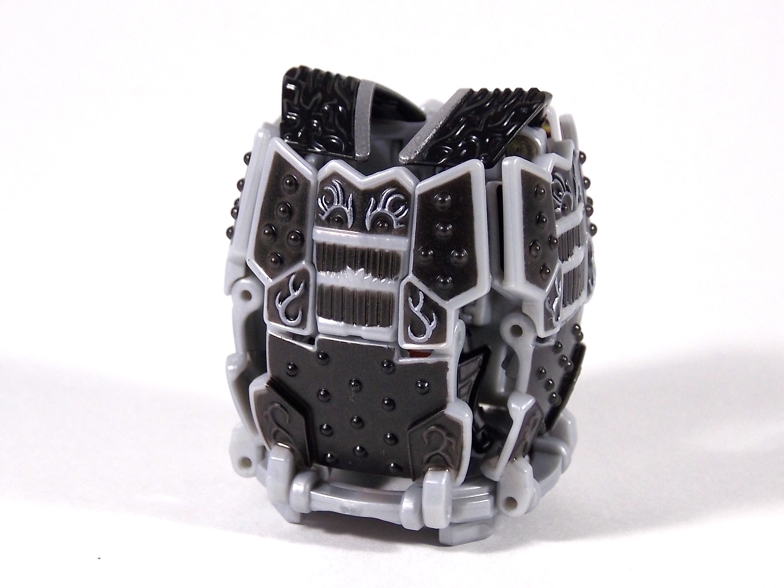 After a brief hiatus I'm back with yet another gallery of an Arms Change figure! Today is AC10 Kamen Rider Gaim Jinba Arms! Gaim Jinba Arms is probably the most unique release in the line so far. If you don't know by now, in show Jinba Arms actually contains the power of all 4 Energy Riders. Contained in this lantern shaped armor are the powers of the Peach, Melon, Lemon, & Cherry Energy Lock Seeds. And awesomely the toy replicates this gimmick! But let's start with the base body. As you can see it's physically identical to the standard Gaim included with Orange Arms. The only differences being the remolded driver and repainted faceplate/crest. This new version of the figure has the Genesis Core & Lemon Energy Lock Seed molded in place to the side. The faceplate is painted black similarly to the Bujin/Blood Gaim and the head crest is now silver rather than gold. The holster for the Musou Saber is also gone, but this figure doesn't come with one anyway. Mainly because the Jinba Arms primary weapon is that of the Energy Riders, the Sonic Arrow. However unlike Shin Zangetsu there's nowhere to store this weapon on Jinba. But this form is sort of a hack of the E. Rider powers in show so is it any wonder that it couldn't properly store such a weapon? The Arms. AC Jinba Arms has all 4 Jinba Forms contained within it. In show we see the arms rotate through the air as it falls onto Gaim's head. The toy replicates this by having the clasps which lock over an AC figures shoulders remain stationary. The 4 sides of the Arms rotate around this stationary piece on a connected ring, allowing you to access any of them at any point. Each "side" transforms exactly the same as the last. Any one of them can become a shoulder, chest, or back plate. The Jinba energies are represented under two flip down panels with foil labels under them on any of the 4 sides. These are damn nice labels, though mine had some air bubbles under them. The new visor/helmet piece is a basic remold of the Orange Arms one. Though the orange color plays off the black of this new form oh so nicely. It should be noted you do have to parts form this slightly to get the armor to work. The shoulder pads which come off the neck area are a separate piece that you need to remove and plug back on each time you rotate the arms. This piece locks the currently used face of the arms in place and fills out the neck area. It also locks together the top of the Jinba Arms making it more secure. It wouldn't have been possible to make it sort of magically attach the way it does in the CGI model so this is a good compromise. Of course I never really have anything bad to say about Arms Change, and this time is no different. AC 10 Gaim Jinba Arms is an excellent figure, and dare I say it I like it better than the original Gaim. A lot of people have been turned off by this form being "lame". Which I don't really get considering how ingenious it is to include the powers of 4 riders/forms in one. The toy being able to pull this off is just brilliant. Easily my favorite AC so far. The next gallery in our series of AC's will of course be Gaim Kachidoki Arms! So I'll be back as soon as I have one!