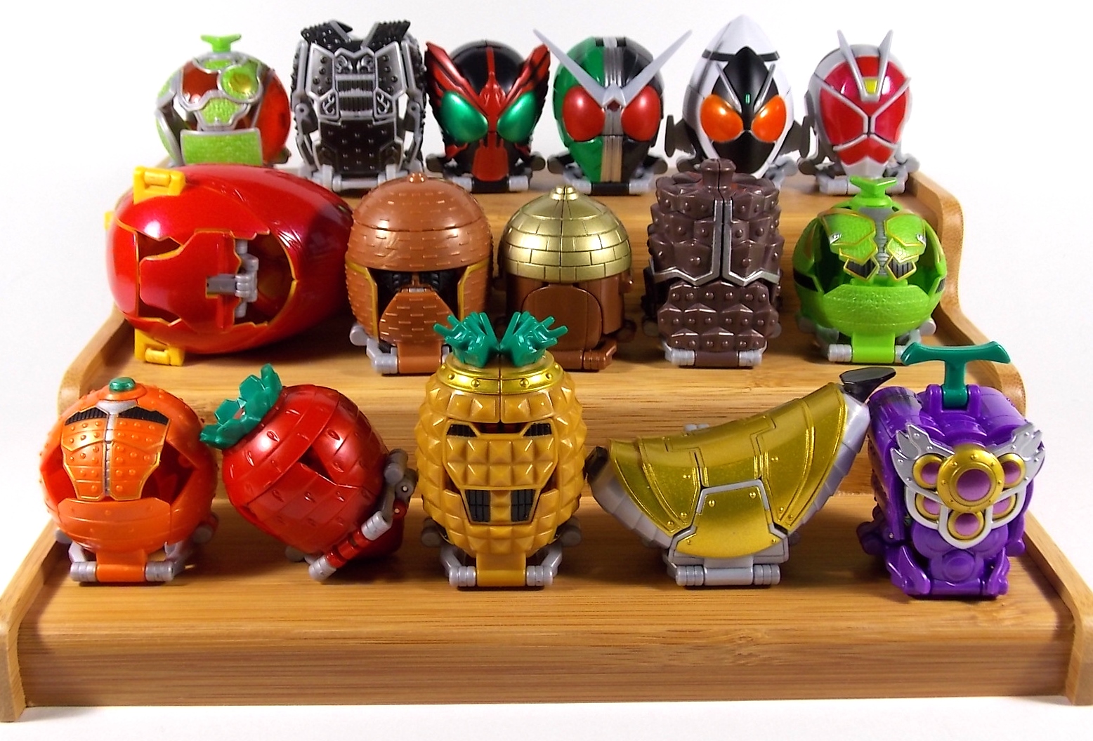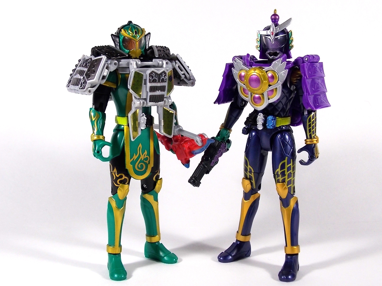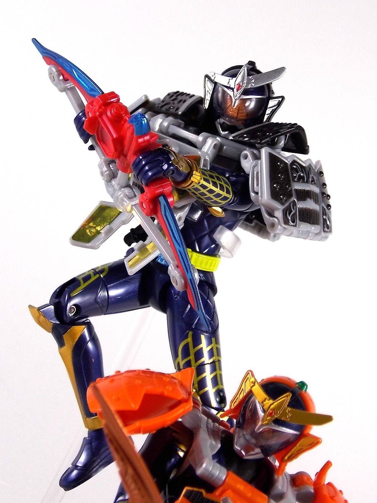 After a brief hiatus I'm back with yet another gallery of an Arms Change figure! Today is AC10 Kamen Rider Gaim Jinba Arms! Gaim Jinba Arms is probably the most unique release in the line so far. If you don't know by now, in show Jinba Arms actually contains the power of all 4 Energy Riders. Contained in this lantern shaped armor are the powers of the Peach, Melon, Lemon, & Cherry Energy Lock Seeds. And awesomely the toy replicates this gimmick! But let's start with the base body. As you can see it's physically identical to the standard Gaim included with Orange Arms. The only differences being the remolded driver and repainted faceplate/crest. This new version of the figure has the Genesis Core & Lemon Energy Lock Seed molded in place to the side. The faceplate is painted black similarly to the Bujin/Blood Gaim and the head crest is now silver rather than gold. The holster for the Musou Saber is also gone, but this figure doesn't come with one anyway. Mainly because the Jinba Arms primary weapon is that of the Energy Riders, the Sonic Arrow. However unlike Shin Zangetsu there's nowhere to store this weapon on Jinba. But this form is sort of a hack of the E. Rider powers in show so is it any wonder that it couldn't properly store such a weapon? The Arms. AC Jinba Arms has all 4 Jinba Forms contained within it. In show we see the arms rotate through the air as it falls onto Gaim's head. The toy replicates this by having the clasps which lock over an AC figures shoulders remain stationary. The 4 sides of the Arms rotate around this stationary piece on a connected ring, allowing you to access any of them at any point. Each "side" transforms exactly the same as the last. Any one of them can become a shoulder, chest, or back plate. The Jinba energies are represented under two flip down panels with foil labels under them on any of the 4 sides. These are damn nice labels, though mine had some air bubbles under them. The new visor/helmet piece is a basic remold of the Orange Arms one. Though the orange color plays off the black of this new form oh so nicely. It should be noted you do have to parts form this slightly to get the armor to work. The shoulder pads which come off the neck area are a separate piece that you need to remove and plug back on each time you rotate the arms. This piece locks the currently used face of the arms in place and fills out the neck area. It also locks together the top of the Jinba Arms making it more secure. It wouldn't have been possible to make it sort of magically attach the way it does in the CGI model so this is a good compromise. Of course I never really have anything bad to say about Arms Change, and this time is no different. AC 10 Gaim Jinba Arms is an excellent figure, and dare I say it I like it better than the original Gaim. A lot of people have been turned off by this form being "lame". Which I don't really get considering how ingenious it is to include the powers of 4 riders/forms in one. The toy being able to pull this off is just brilliant. Easily my favorite AC so far. The next gallery in our series of AC's will of course be Gaim Kachidoki Arms! So I'll be back as soon as I have one!