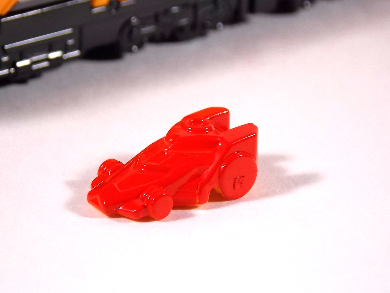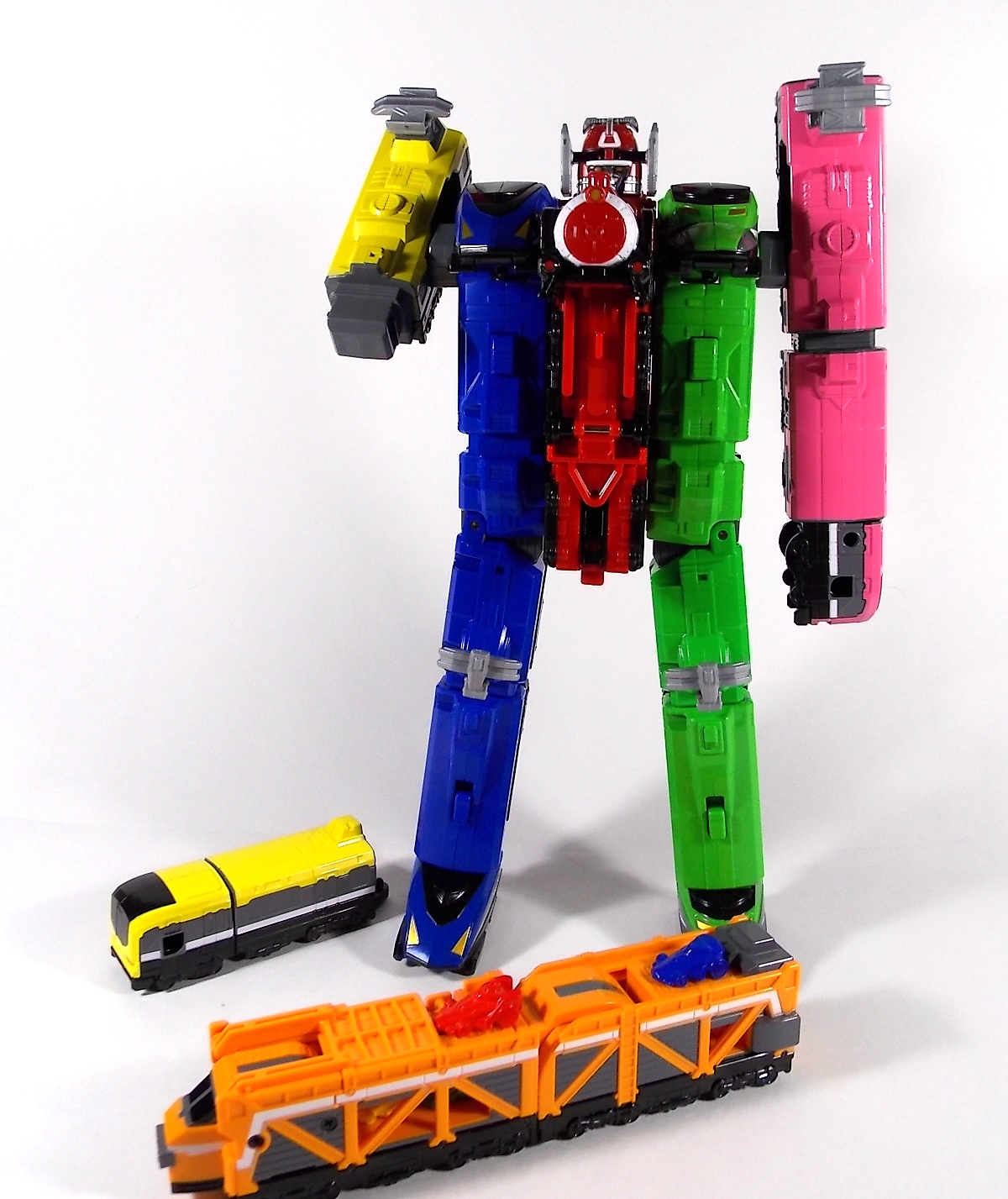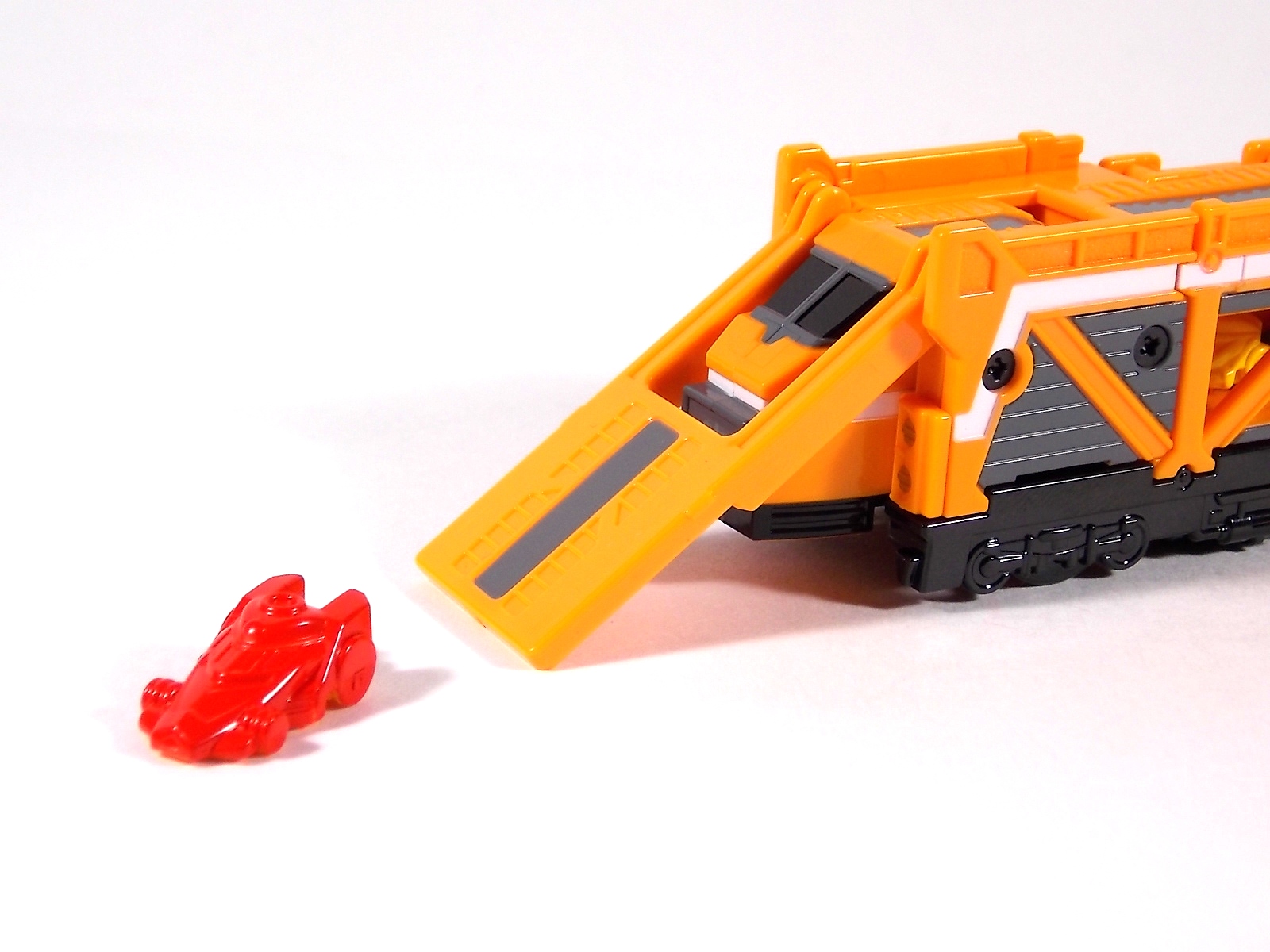 The train has made another pass at the TokuNation station for a glerry! Today we've got a doubled up one for you, the DX Car Carrier & Tank Resshas from Ressha Sentai ToQger! This pair was recently released ahead of their friend Diesel Ressha. We know they can combine with it to form Diesel Oh, but how do Tank & Car Carrier stand up on their own? Read on! Let's start with Car Carrier Ressha. This one is definitely unique. By now the size of DX Reshas should be no surprise, these things are fairly small for DX's, but they usually pack a punch, and this one is no different. Car Carrier is another 2 car Ressha with a separating forward and rear section. Just like the 5 ToQ Oh Resshas, it has a square plug in the center that keeps the two ends combined and simultaneously facilitates combinations. Just as with the other and alternate train hitch is available for use. Car Carrier's feature is of course it's car carrying ability! Sculpted into Car Carrier are all 5 of the TOQger "Cars". These mini racecar like vehicles are all non-removable save for Red's. It pegs right on top of Car Carrier. Blue is molded in place permanently, and the other store are "stored" inside Carrier permanently. Though the ability to remove red doesn't get you much, aside from a fear of losing it. As in show a ramp folds down to allows the cars to driver off. This Ressha can replace ToQ Oh's right forearm to create ToQ Oh Car Carrier. This arms is long and heavy. Tank Ressha is the next Support Ressha in the line. This piece doesn't have quite as much functionality as Car Carrier. But it does look as nice. In Ressha form it has all the same basic features as it's predecessors. Though it has no gimmick. There honestly isn't much to say about this one on it's own. When split in half Tank Resha replaces both forerams of ToQ Oh to form ToQ Oh Tank. When Carrier & Tank are used simultaneosuly, ToQ Oh Car Carrier Tank is formed! Now of course the main draw of these two is the upcoming combination Diesel Oh that they can achieve with the Diesel ressha. For now though with just these two in hand, I can show you the various moving joints and tabs that facilitate that future combo. As you can see they attach to ToQ Oh's legs with fold out clips. The way the open end of each of them points outward from the foot would suggest they have a purpose for future combos, but that's more of a guess. They can also be hilariously used as gigantic stilt leg for ToQ Oh is desired. There's lots of swap out fun possible. I can't help but recommend DX Resshas. Despite what people may think, having these things in hand will sell you on them. These toys may look like bricks, but they are crisply painted, well engineered, fun toys. As cheap as the additional Resshas are you should definitely do yourself a favor and pick some of them up.