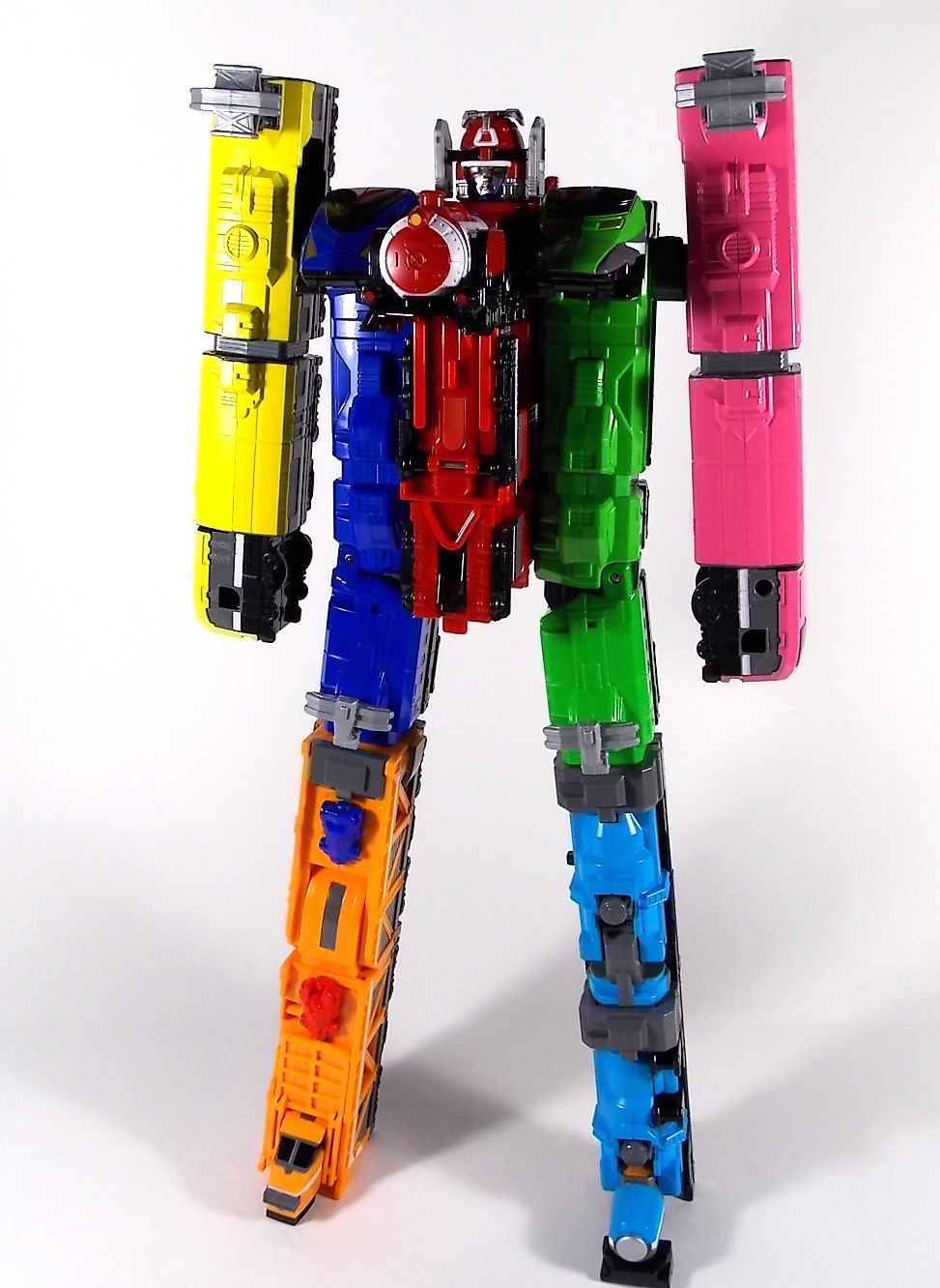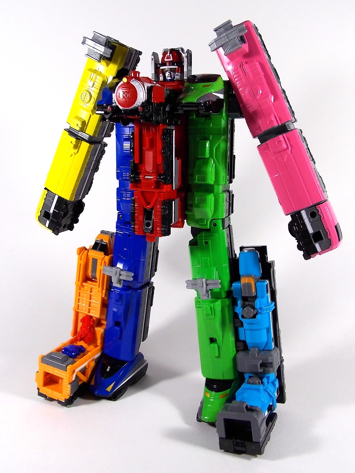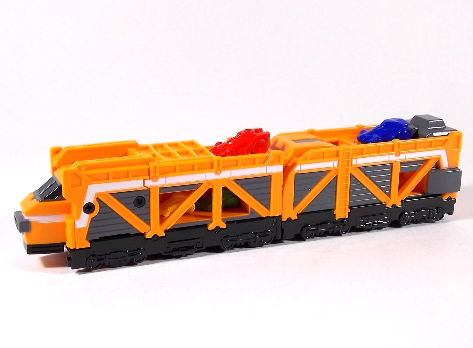The train has made another pass at the TokuNation station for a glerry! Today we've got a doubled up one for you, the DX Car Carrier & Tank Resshas from Ressha Sentai ToQger! This pair was recently released ahead of their friend Diesel Ressha. We know they can combine with it to form Diesel Oh, but how do Tank & Car Carrier stand up on their own? Read on! Let's start with Car Carrier Ressha. This one is definitely unique. By now the size of DX Reshas should be no surprise, these things are fairly small for DX's, but they usually pack a punch, and this one is no different. Car Carrier is another 2 car Ressha with a separating forward and rear section. Just like the 5 ToQ Oh Resshas, it has a square plug in the center that keeps the two ends combined and simultaneously facilitates combinations. Just as with the other and alternate train hitch is available for use. Car Carrier's feature is of course it's car carrying ability! Sculpted into Car Carrier are all 5 of the TOQger "Cars". These mini racecar like vehicles are all non-removable save for Red's. It pegs right on top of Car Carrier. Blue is molded in place permanently, and the other store are "stored" inside Carrier permanently. Though the ability to remove red doesn't get you much, aside from a fear of losing it. As in show a ramp folds down to allows the cars to driver off. This Ressha can replace ToQ Oh's right forearm to create ToQ Oh Car Carrier. This arms is long and heavy. Tank Ressha is the next Support Ressha in the line. This piece doesn't have quite as much functionality as Car Carrier. But it does look as nice. In Ressha form it has all the same basic features as it's predecessors. Though it has no gimmick. There honestly isn't much to say about this one on it's own. When split in half Tank Resha replaces both forerams of ToQ Oh to form ToQ Oh Tank. When Carrier & Tank are used simultaneosuly, ToQ Oh Car Carrier Tank is formed! Now of course the main draw of these two is the upcoming combination Diesel Oh that they can achieve with the Diesel ressha. For now though with just these two in hand, I can show you the various moving joints and tabs that facilitate that future combo. As you can see they attach to ToQ Oh's legs with fold out clips. The way the open end of each of them points outward from the foot would suggest they have a purpose for future combos, but that's more of a guess. They can also be hilariously used as gigantic stilt leg for ToQ Oh is desired. There's lots of swap out fun possible. I can't help but recommend DX Resshas. Despite what people may think, having these things in hand will sell you on them. These toys may look like bricks, but they are crisply painted, well engineered, fun toys. As cheap as the additional Resshas are you should definitely do yourself a favor and pick some of them up.