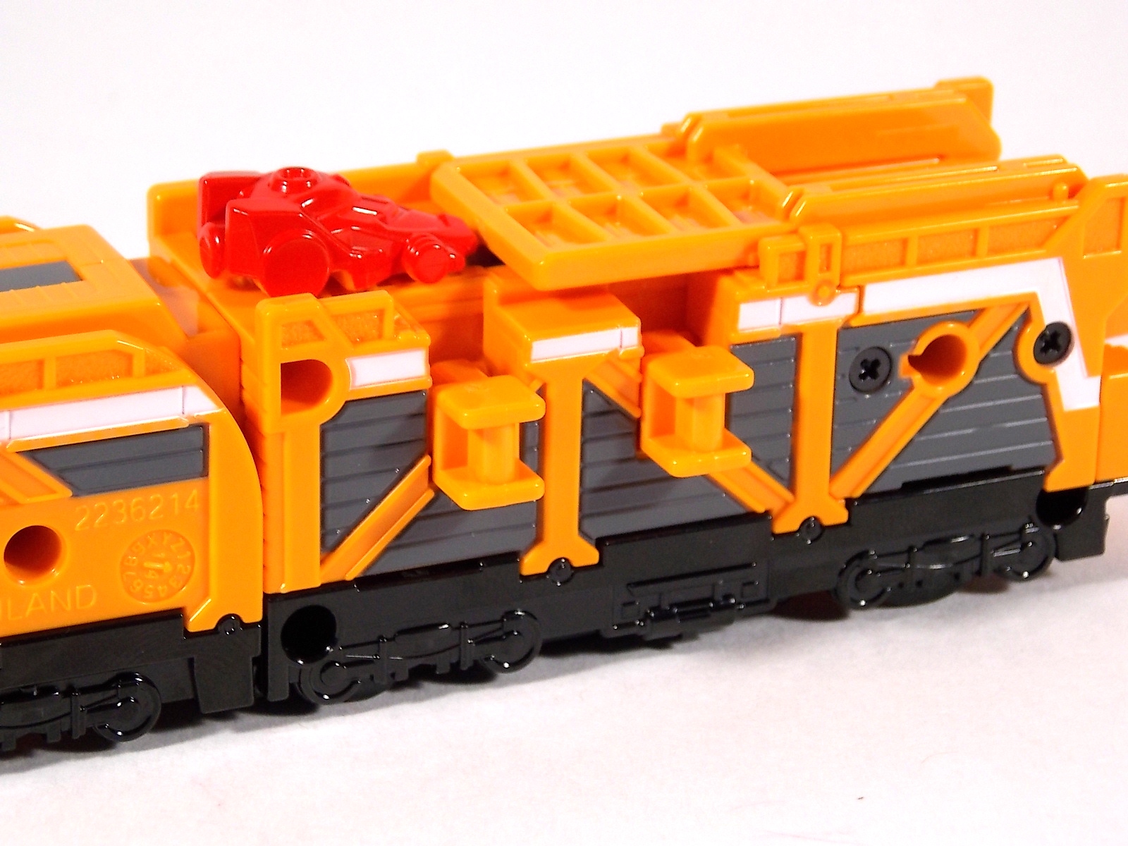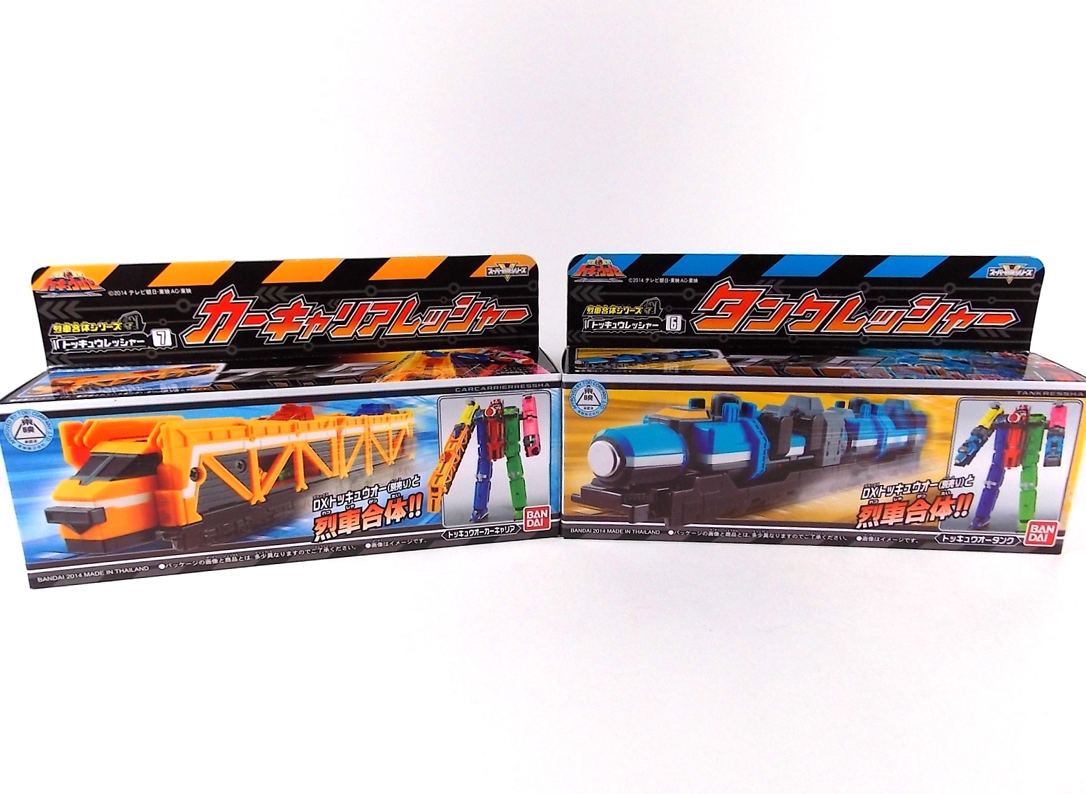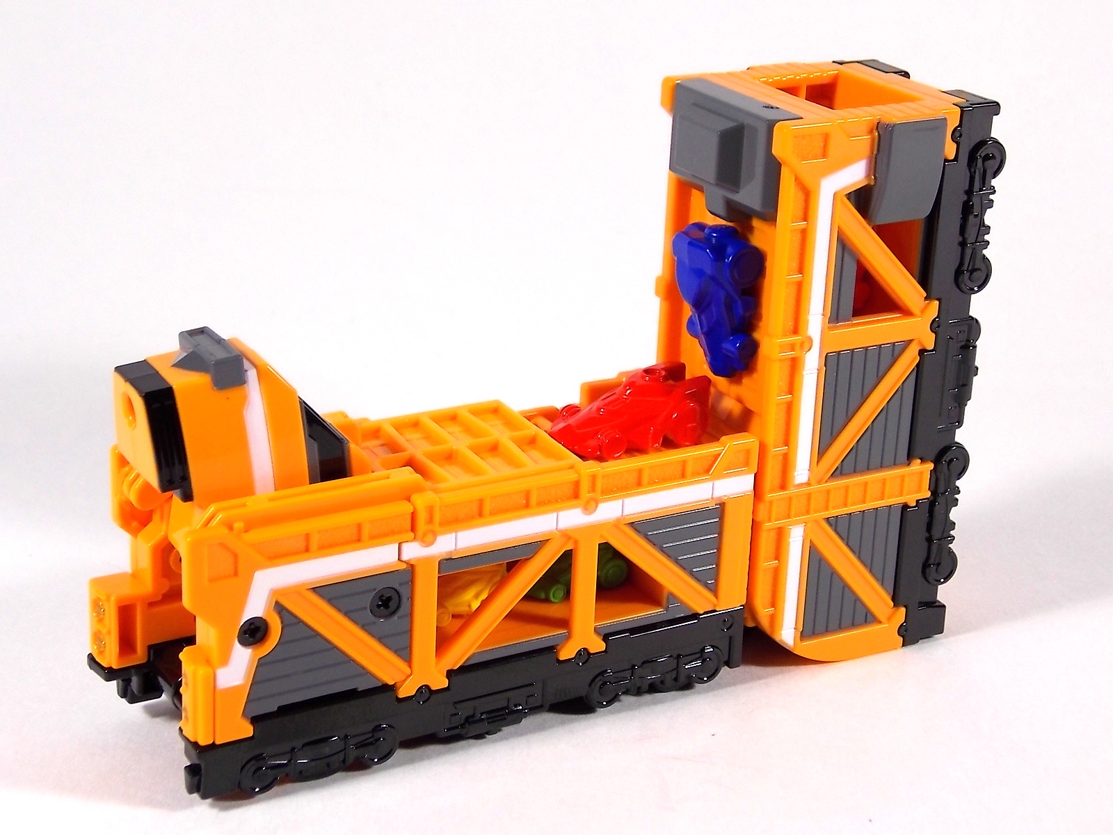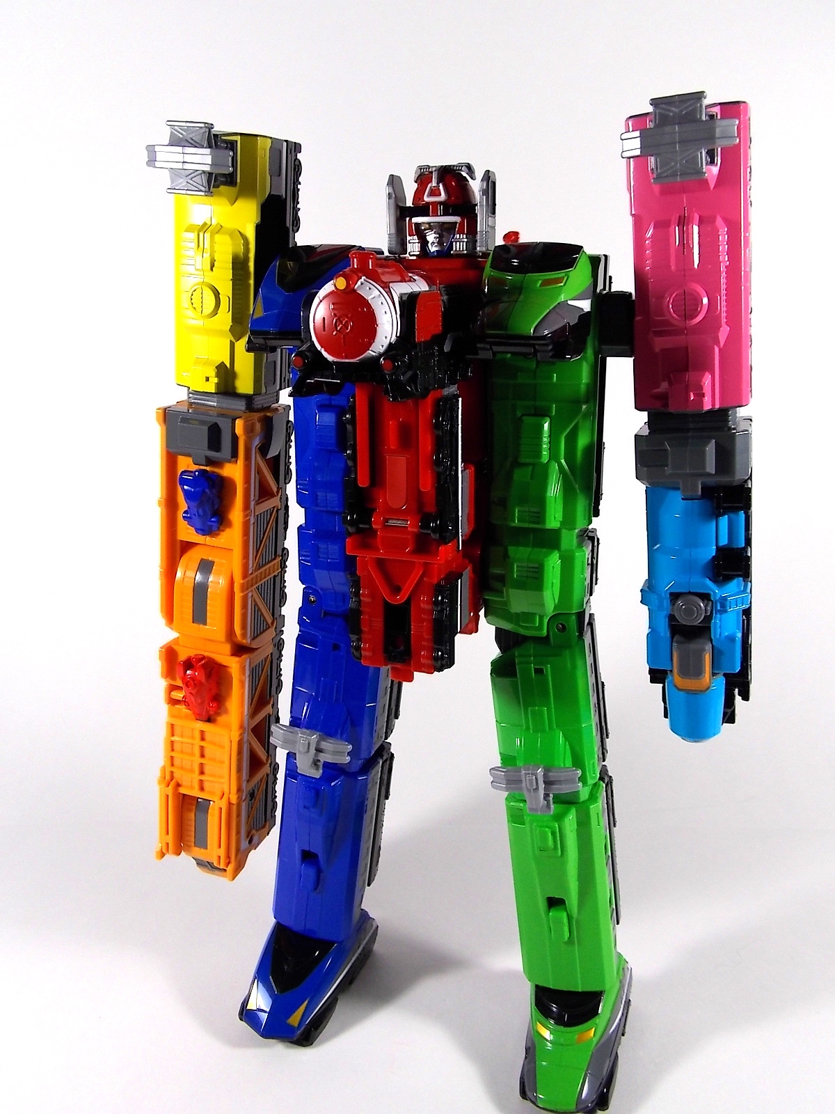 The train has made another pass at the TokuNation station for a glerry! Today we've got a doubled up one for you, the DX Car Carrier & Tank Resshas from Ressha Sentai ToQger! This pair was recently released ahead of their friend Diesel Ressha. We know they can combine with it to form Diesel Oh, but how do Tank & Car Carrier stand up on their own? Read on! Let's start with Car Carrier Ressha. This one is definitely unique. By now the size of DX Reshas should be no surprise, these things are fairly small for DX's, but they usually pack a punch, and this one is no different. Car Carrier is another 2 car Ressha with a separating forward and rear section. Just like the 5 ToQ Oh Resshas, it has a square plug in the center that keeps the two ends combined and simultaneously facilitates combinations. Just as with the other and alternate train hitch is available for use. Car Carrier's feature is of course it's car carrying ability! Sculpted into Car Carrier are all 5 of the TOQger "Cars". These mini racecar like vehicles are all non-removable save for Red's. It pegs right on top of Car Carrier. Blue is molded in place permanently, and the other store are "stored" inside Carrier permanently. Though the ability to remove red doesn't get you much, aside from a fear of losing it. As in show a ramp folds down to allows the cars to driver off. This Ressha can replace ToQ Oh's right forearm to create ToQ Oh Car Carrier. This arms is long and heavy. Tank Ressha is the next Support Ressha in the line. This piece doesn't have quite as much functionality as Car Carrier. But it does look as nice. In Ressha form it has all the same basic features as it's predecessors. Though it has no gimmick. There honestly isn't much to say about this one on it's own. When split in half Tank Resha replaces both forerams of ToQ Oh to form ToQ Oh Tank. When Carrier & Tank are used simultaneosuly, ToQ Oh Car Carrier Tank is formed! Now of course the main draw of these two is the upcoming combination Diesel Oh that they can achieve with the Diesel ressha. For now though with just these two in hand, I can show you the various moving joints and tabs that facilitate that future combo. As you can see they attach to ToQ Oh's legs with fold out clips. The way the open end of each of them points outward from the foot would suggest they have a purpose for future combos, but that's more of a guess. They can also be hilariously used as gigantic stilt leg for ToQ Oh is desired. There's lots of swap out fun possible. I can't help but recommend DX Resshas. Despite what people may think, having these things in hand will sell you on them. These toys may look like bricks, but they are crisply painted, well engineered, fun toys. As cheap as the additional Resshas are you should definitely do yourself a favor and pick some of them up.