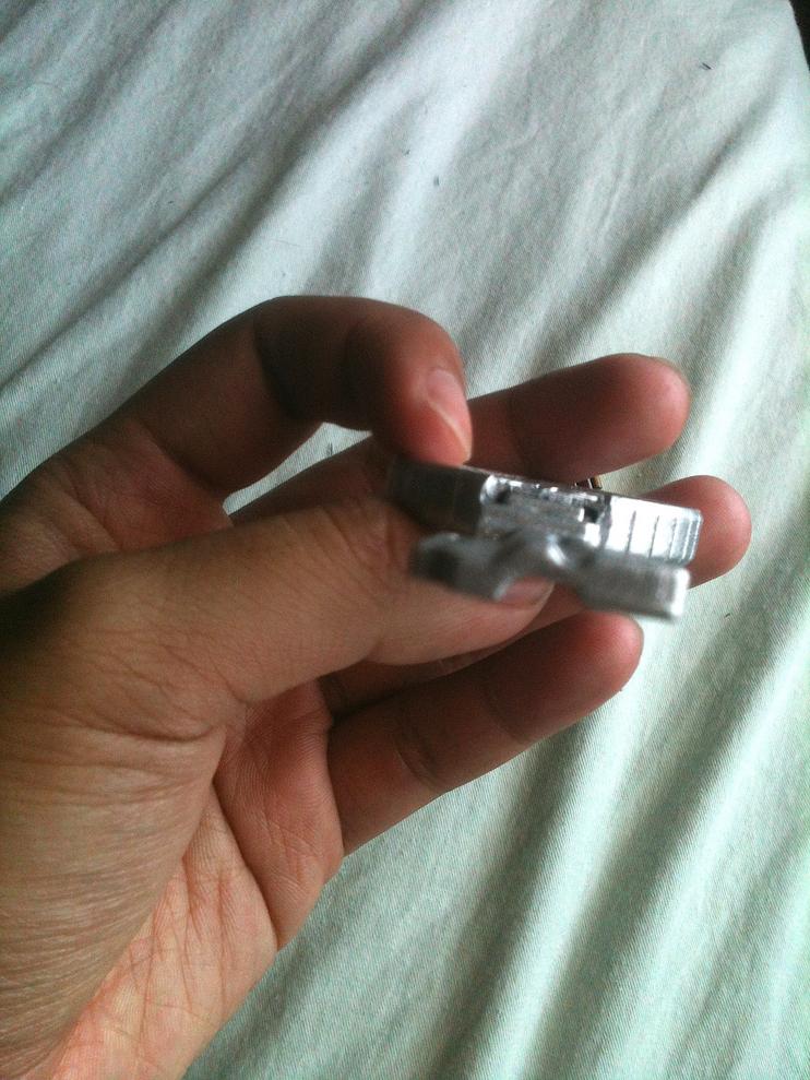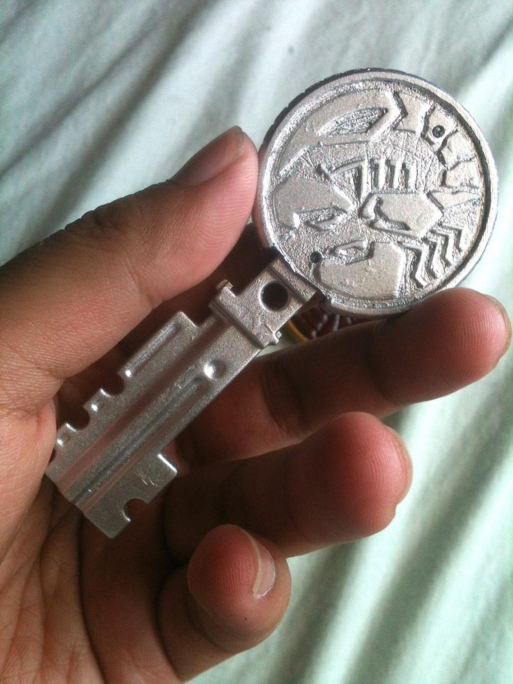 Well, key XD. I tried to strip the paint on my GokaiViolet key so I could repaint it, but it came out horrible. The only thing that was safe was the key bit at the end. And then I got an idea after looking at my Sasori Cell Medal.