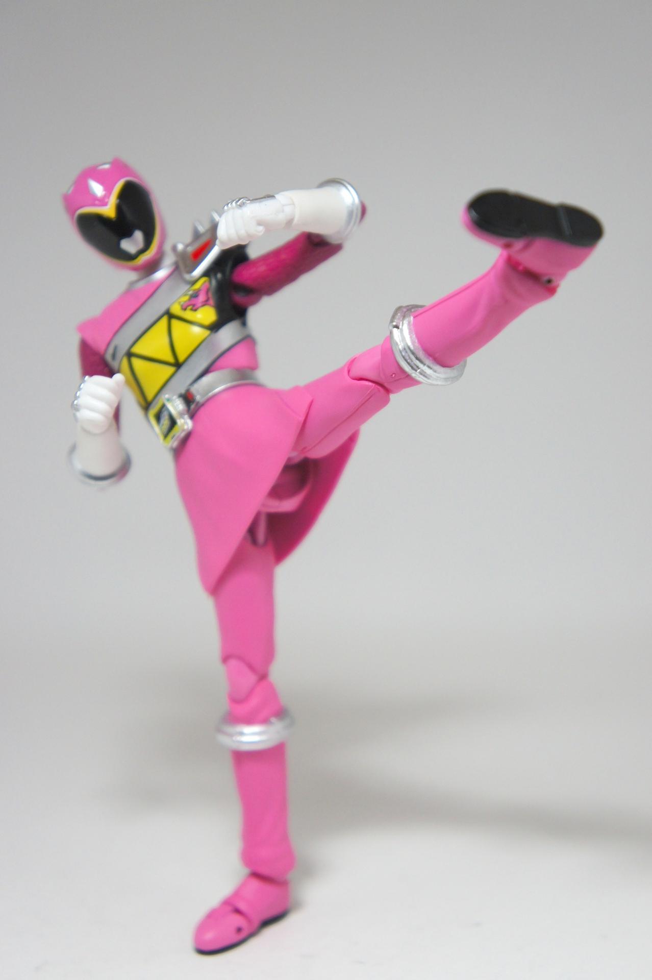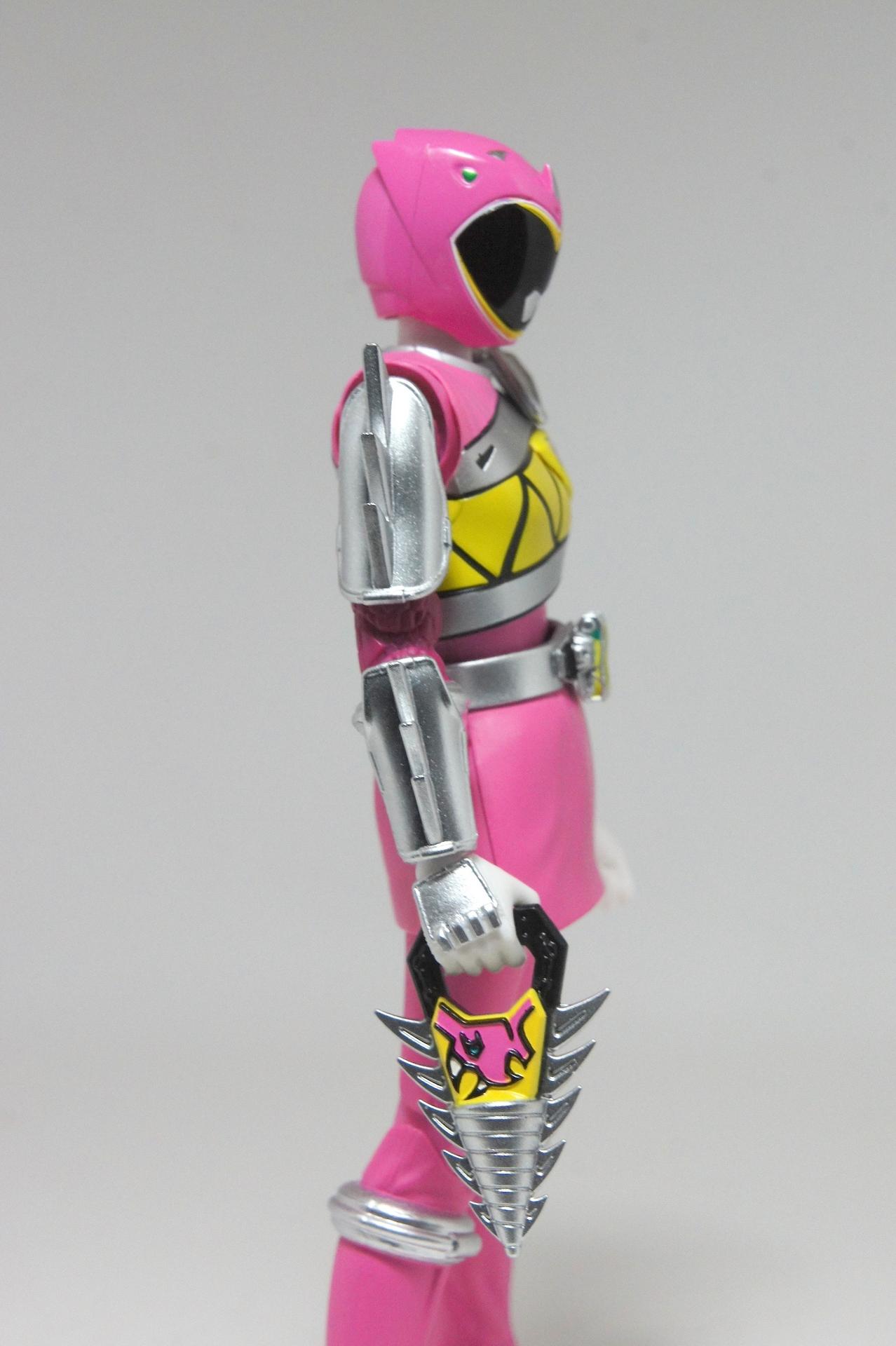 Tsuno No Yuusha! (The Horned Heroine) Kyoryu Pink! This gallery showcases 2 more members of the 37th Super Sentai, Zyuden Sentai Kyoryuger! The first of these figures is Kyoryu Black, otherwise known as Ian Yorkland! Ian is a young treasure hunter from Europe who became a Kyoryuger after an encounter with the Deboss Legion during a treasure hunt led to the death of his best friend. After falling and landing in front of a castle where his future partner Zyudenryu Parasagun was, Ian and the parasaurolophus battled until he was deemed worthy enough to be his partner. Although he makes his debut in the first episode, Ian doesn’t join the team until episode 4, when the very Deboss Legion member that he encountered months ago appears before him. A playboy, Ian is often at ends with his fellow teammate, Souji Rippukan/Kyoryu Green. Despite his playboy attitude, Ian cares for his teammates and for the girls he dates. He is designated as the leader of the team if Daigo is ever out of commission, proving to be a great strategist, but when he’s not, he’s shown to be their best sharpshooter, often dual wielding. Sharing the same body type as his fellow male Kyoryugers, Kyoryu Black is a glorious matte black body with a glossy black head and silver upper arms. Compared to the wrist issues seen on Kyoryu Red, Kyoryu Black’s hands are very easy to swap out. Just like his fellow Kyoryugers, Kyoryu Black comes with a number of accessories- 9 hands (3 for his role call poses, 2 for wielding the Gaburevolver, 2 for wielding the Gaburicalibur, and the standard Figuarts hands), a Gaburevolver, a small #2 Parasagun Zyudenchi, a Gaburicalibur, his Armed On arm and his Zyuden Arms weapon, the Parasa Shot bowgun. Just like the other Zyuden Arms weapons, the Parasa Shot has a thick handle, but can be held with the Gaburicalibur holding hand if you fiddle around with it. Also, the Parasa Shot can’t combine with the other weapons. The second figure in this set is Kyoryu Pink, representing Amy Yuuzuki! Amy is a young rich college student who resided in America when the Deboss Legion first attacked. After meeting her Zyudenryu partner, Dricera in the Grand Canyon, Amy fought the triceratops and was chosen by her to be her partner. The only girl on the team, Amy proves she is not to be messed with by being the resident kick chick- in fact; she once kicked two energy arrows behind her! Amy is the second/third member to join Daigo after witnessing him in action in episode 2. Amy is often seen at home with her butler Gentle, who tries to get her to act like the prim and proper heiress that she is. Despite this, Amy often works in the same restaurant that the team usually eats at/holds a portal into the Spirit Base. Kyoryu Pink stems away from the other Kyoryugers, with a smaller female body frame. Just like her teammates, she has multiple accessories- 4 hands for her different role call poses, 2 hands to hold the Gaburevolver, 2 hands to hold the Gaburicalibur, and the standard 2 Figuarts hands, the Gaburevolver, the Gaburicalibur, a small #5 Dricera Zyudenchi and her Armed On arm and her personal Zyuden Arms weapon, the DriceLance. As it turns out, the one included with the previous set, the Kyoryu Blue and Kyoryu Green Set, was the one for the Kentrospiker. Something to note is that she has the same sized hands as her other teammates and that her helmet seems a little small/her neck is too short. It is kind of difficult to get her into her role call pose as well. The shared accessory in this set is their Kentrospiker Part, a combination of Kyoryu Blue’s Stegochi Shield and Kyoryu Green’s Zakutor Slasher. Both can’t separate into their individual weapons. The DriceLance in that past set can combine with this accessory, forming the Shield LanSlasher! With the Fang Shot included with Kyoryu Gold, the team can complete the Kentrospiker accessory! They also lack the GaburiCannon as an accessory like the rest of their team. This set is really sweet, and I’m glad I managed to get them. They were initially released as a Tamashii Web Exclusive for April 2014. Stay tuned for Den-O’s gallery of the Thundering Hero! (See post 2 for more pics of Kyoryu Pink and the 5 Kyoryugers together!)