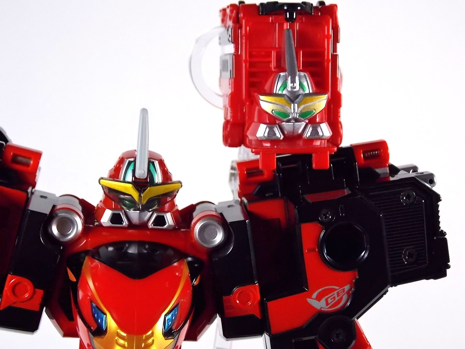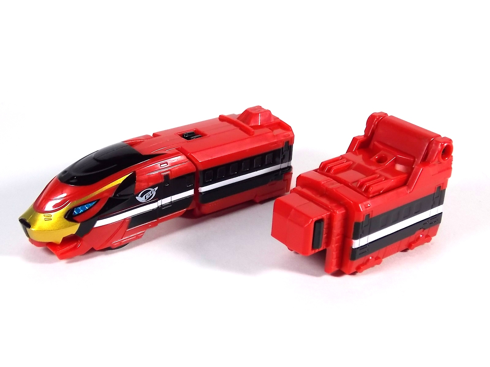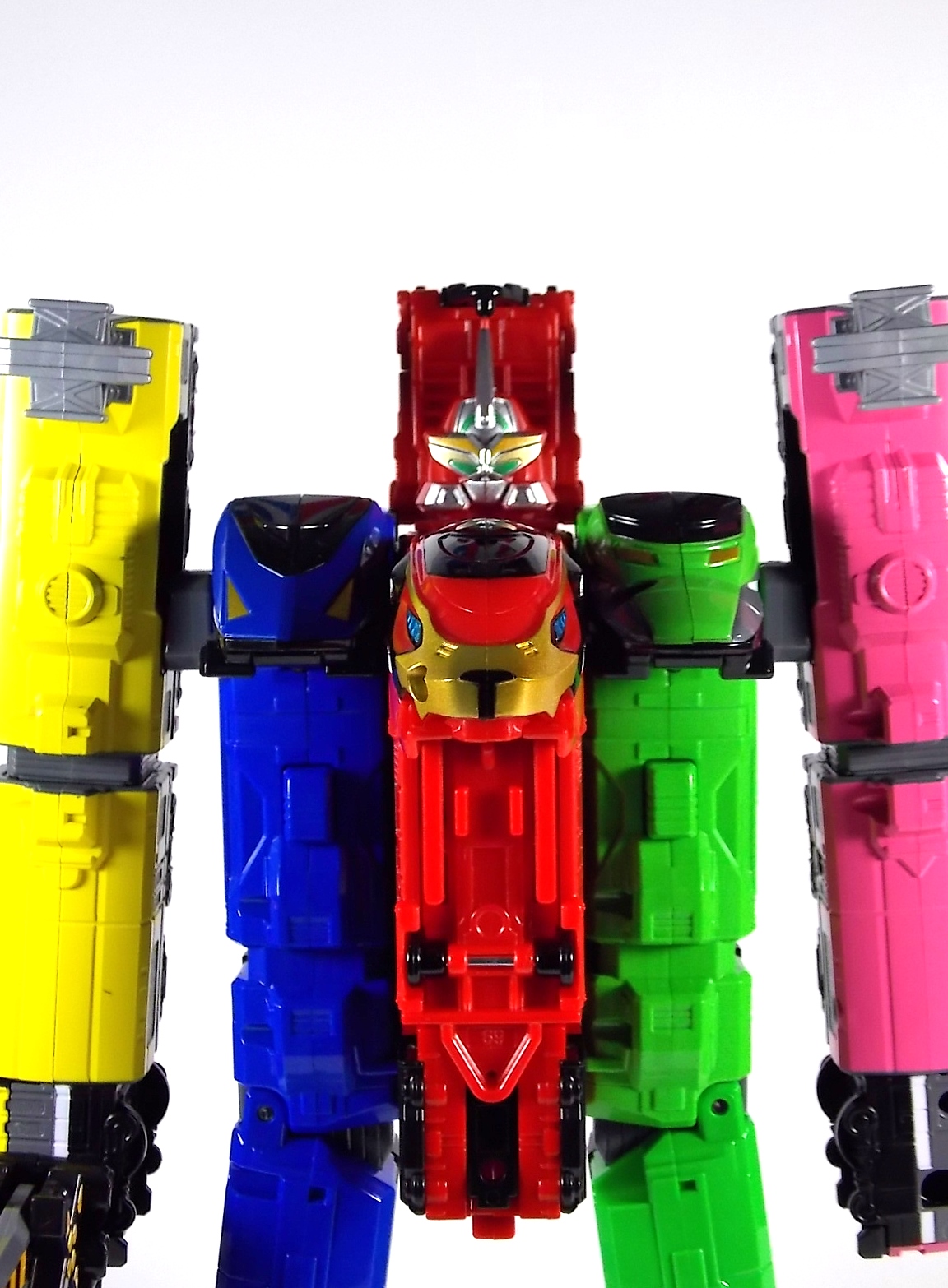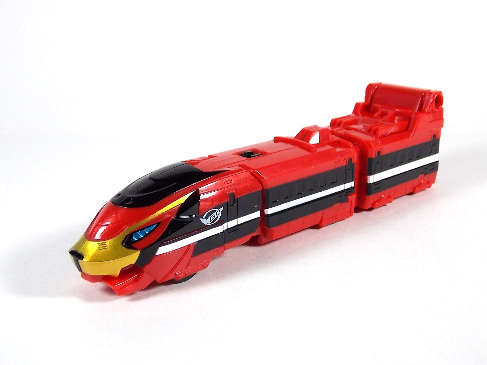 Once again we bring you a gallery full of imagination. This time in the form of the DX Go-Busters Ressha from Ressha Sentai ToQger! This is of course the first of two known EX or Legend Sentai Resshas in the line. This latest Ressha is a possible movie exclusive mecha from Heisei Rider VS Show Rider: Kamen Rider Taisen Featuring Super Sentai. In the film the featured sentai is of course the currently running ToQger, and they get a little help from their hero pals in the form of Kyoryuger Ressha & Den-Liner Ressha. However there's no confirmation currently as to whether the Go-Busters Ressha actually appears in film. As for the DX Go-Busters Ressha itself. This is a new "chest" Ressha which replaces Red Ressha in the ToQ Oh formation. Go-Busters Ressha is a full 2 car vehicle on it's own but it's designed a bit differently from the standard. As opposed to replacing Red Ressha entirely it merely replaces the front engine section. However the second car of Go-Busters Ressha is a bit smaller than the usual as well. In fact it's sole purpose is to become a new head for ToQ Oh. When combining you need only remove the engine of Red Ressha and replace it with the engine of Go-Busters Ressha and fold the front end at a 90 degree angle as normal. Then close up the doors and rotate ToQ Oh's head back into the compartment it's normally stored in. The second car of Go-Busters Ressha can then fold outward, almost inside out, revealing the new head and a set of clips to plug it in where ToQ Oh's head normally goes. Unfortunately this design doesn't match up with how it should really look. Because now you have a square block hanging off the back of the new combined head, rather than a smooth free standing head. But this is the compromise made for the transformation. As for the head itself it's based on none other than Go-Buster Ace's from Tokumei Sentai Go-busters! So it of course has the trademark shades look In comparing it to the original DX Go-Busters Ace's head you can see quite a few differences. It doesn't have the moving head fin or visor pieces and doesn't feature the translucent plastic of the visor either. Otherwise it's a fine approximation of the head sculpt, albeit it much flatter because of the way it transforms. When combined this form is known as ToQ Oh Go-Buster Ace.Of course this Ressha still features the same universal square peg/lock system of the other Resshas and has the same fold out hitches as well. So the interchangeability and playability are totally there. Though take it from me, it really only makes a good chest ![]() At the very affordable prices these additional Legend Sentai Resshas retail for, you should definitely pick them up. DX Go-Busters Ressha is worth it.