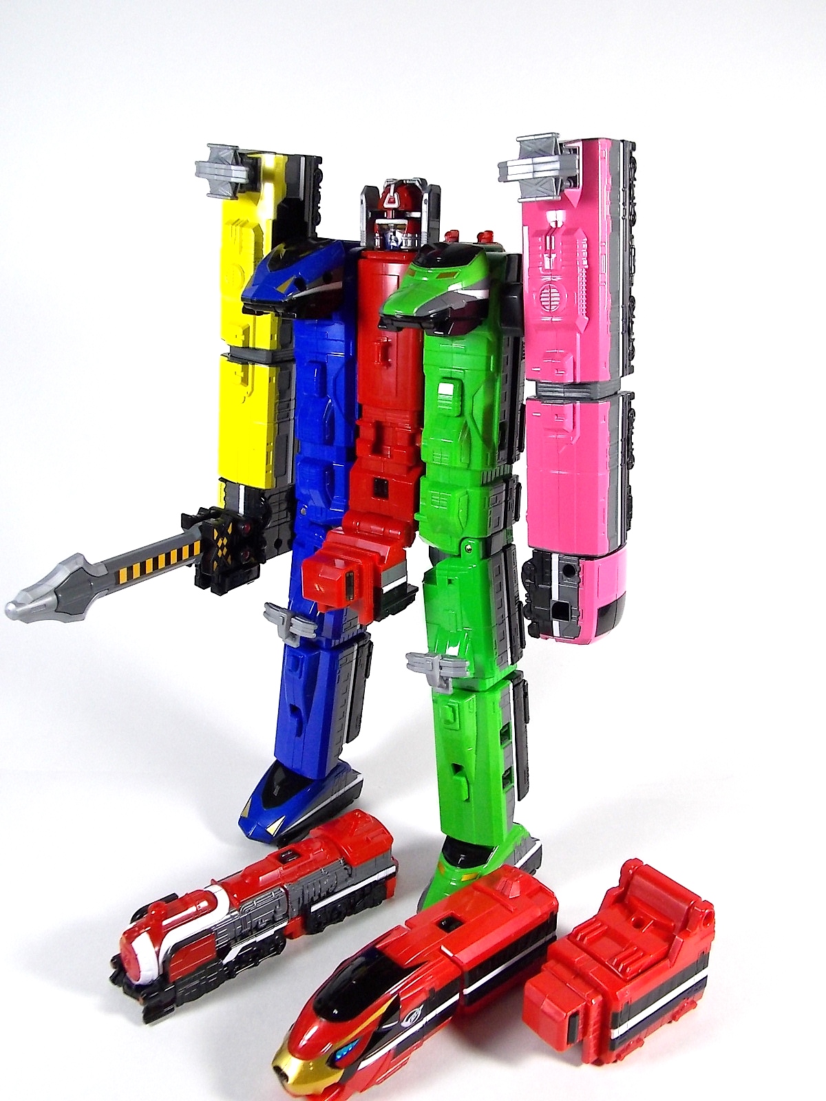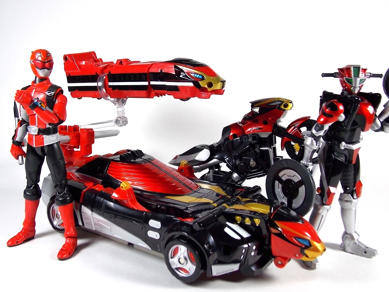 Once again we bring you a gallery full of imagination. This time in the form of the DX Go-Busters Ressha from Ressha Sentai ToQger! This is of course the first of two known EX or Legend Sentai Resshas in the line. This latest Ressha is a possible movie exclusive mecha from Heisei Rider VS Show Rider: Kamen Rider Taisen Featuring Super Sentai. In the film the featured sentai is of course the currently running ToQger, and they get a little help from their hero pals in the form of Kyoryuger Ressha & Den-Liner Ressha. However there's no confirmation currently as to whether the Go-Busters Ressha actually appears in film. As for the DX Go-Busters Ressha itself. This is a new "chest" Ressha which replaces Red Ressha in the ToQ Oh formation. Go-Busters Ressha is a full 2 car vehicle on it's own but it's designed a bit differently from the standard. As opposed to replacing Red Ressha entirely it merely replaces the front engine section. However the second car of Go-Busters Ressha is a bit smaller than the usual as well. In fact it's sole purpose is to become a new head for ToQ Oh. When combining you need only remove the engine of Red Ressha and replace it with the engine of Go-Busters Ressha and fold the front end at a 90 degree angle as normal. Then close up the doors and rotate ToQ Oh's head back into the compartment it's normally stored in. The second car of Go-Busters Ressha can then fold outward, almost inside out, revealing the new head and a set of clips to plug it in where ToQ Oh's head normally goes. Unfortunately this design doesn't match up with how it should really look. Because now you have a square block hanging off the back of the new combined head, rather than a smooth free standing head. But this is the compromise made for the transformation. As for the head itself it's based on none other than Go-Buster Ace's from Tokumei Sentai Go-busters! So it of course has the trademark shades look In comparing it to the original DX Go-Busters Ace's head you can see quite a few differences. It doesn't have the moving head fin or visor pieces and doesn't feature the translucent plastic of the visor either. Otherwise it's a fine approximation of the head sculpt, albeit it much flatter because of the way it transforms. When combined this form is known as ToQ Oh Go-Buster Ace.Of course this Ressha still features the same universal square peg/lock system of the other Resshas and has the same fold out hitches as well. So the interchangeability and playability are totally there. Though take it from me, it really only makes a good chest ![]() At the very affordable prices these additional Legend Sentai Resshas retail for, you should definitely pick them up. DX Go-Busters Ressha is worth it.