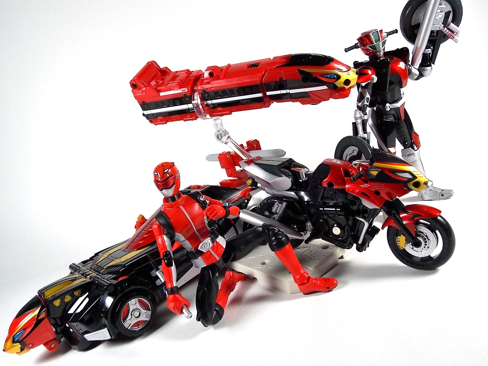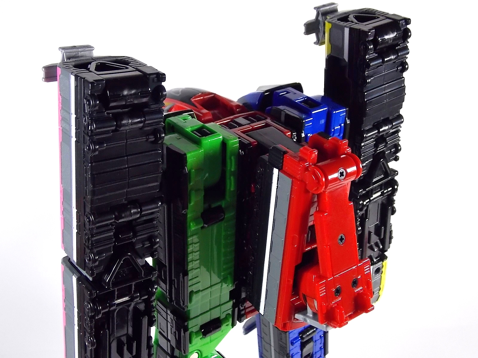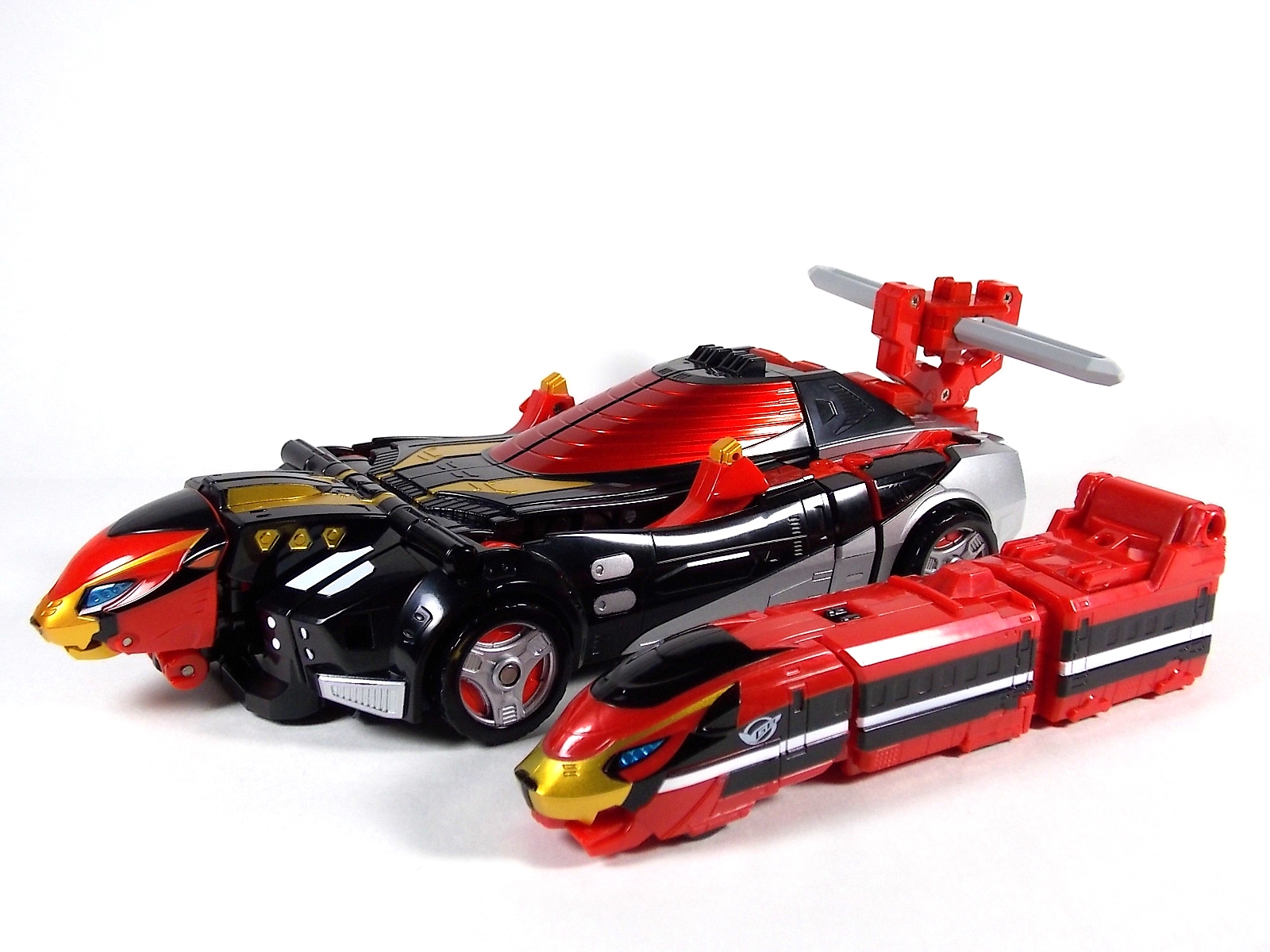 Once again we bring you a gallery full of imagination. This time in the form of the DX Go-Busters Ressha from Ressha Sentai ToQger! This is of course the first of two known EX or Legend Sentai Resshas in the line. This latest Ressha is a possible movie exclusive mecha from Heisei Rider VS Show Rider: Kamen Rider Taisen Featuring Super Sentai. In the film the featured sentai is of course the currently running ToQger, and they get a little help from their hero pals in the form of Kyoryuger Ressha & Den-Liner Ressha. However there's no confirmation currently as to whether the Go-Busters Ressha actually appears in film. As for the DX Go-Busters Ressha itself. This is a new "chest" Ressha which replaces Red Ressha in the ToQ Oh formation. Go-Busters Ressha is a full 2 car vehicle on it's own but it's designed a bit differently from the standard. As opposed to replacing Red Ressha entirely it merely replaces the front engine section. However the second car of Go-Busters Ressha is a bit smaller than the usual as well. In fact it's sole purpose is to become a new head for ToQ Oh. When combining you need only remove the engine of Red Ressha and replace it with the engine of Go-Busters Ressha and fold the front end at a 90 degree angle as normal. Then close up the doors and rotate ToQ Oh's head back into the compartment it's normally stored in. The second car of Go-Busters Ressha can then fold outward, almost inside out, revealing the new head and a set of clips to plug it in where ToQ Oh's head normally goes. Unfortunately this design doesn't match up with how it should really look. Because now you have a square block hanging off the back of the new combined head, rather than a smooth free standing head. But this is the compromise made for the transformation. As for the head itself it's based on none other than Go-Buster Ace's from Tokumei Sentai Go-busters! So it of course has the trademark shades look In comparing it to the original DX Go-Busters Ace's head you can see quite a few differences. It doesn't have the moving head fin or visor pieces and doesn't feature the translucent plastic of the visor either. Otherwise it's a fine approximation of the head sculpt, albeit it much flatter because of the way it transforms. When combined this form is known as ToQ Oh Go-Buster Ace.Of course this Ressha still features the same universal square peg/lock system of the other Resshas and has the same fold out hitches as well. So the interchangeability and playability are totally there. Though take it from me, it really only makes a good chest ![]() At the very affordable prices these additional Legend Sentai Resshas retail for, you should definitely pick them up. DX Go-Busters Ressha is worth it.