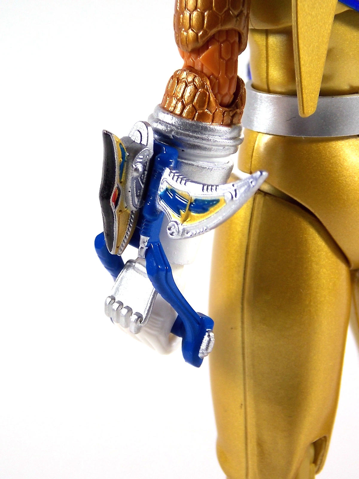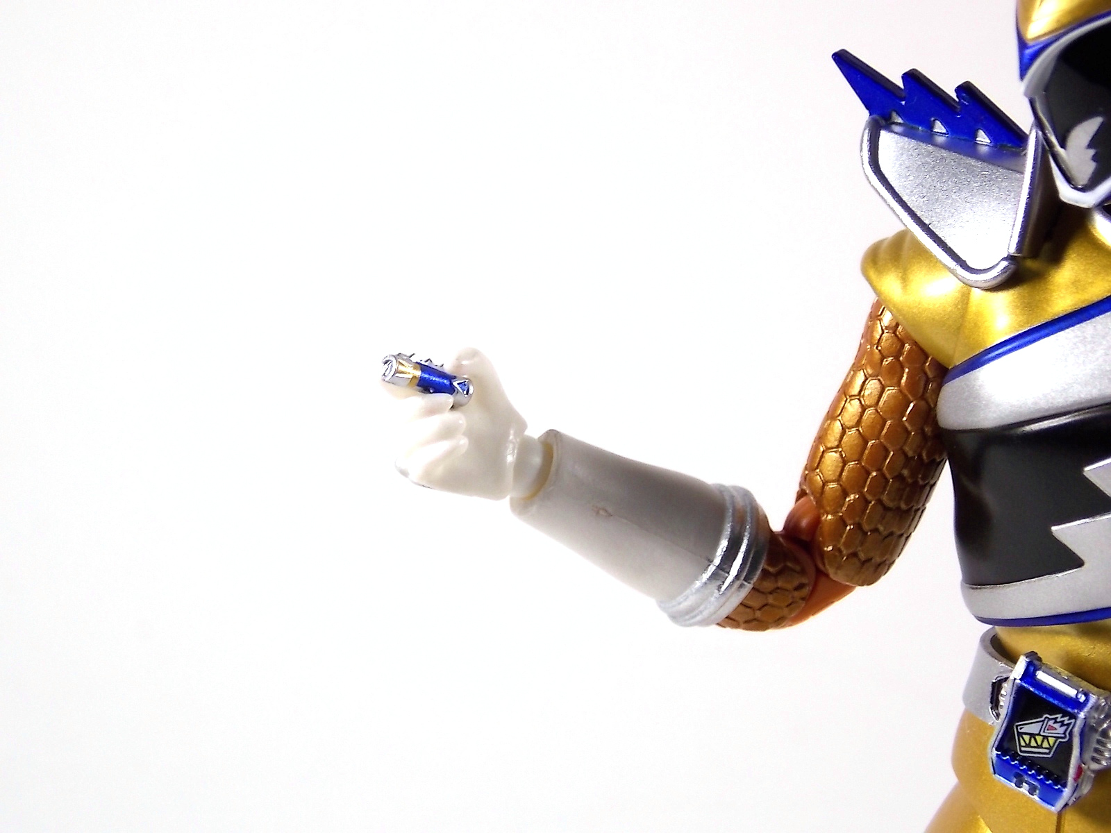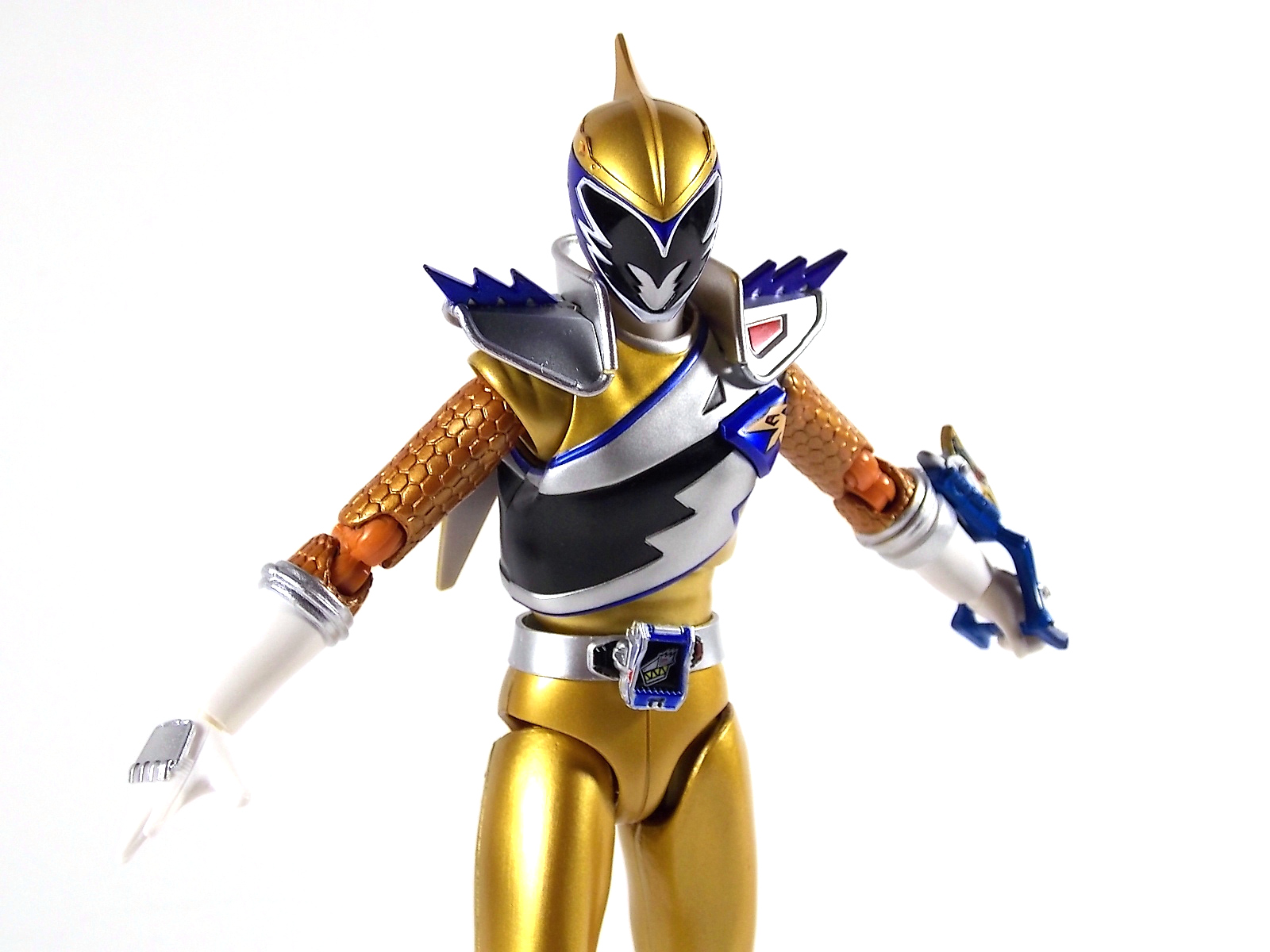 Zyuden Sentai Kyoryuger is long over by now but the last (so far) figure from the series in the S.H. Figuarts line was recently released. S.H. Figuarts Kyoryu Gold is yet another sixth sentai ranger to add to your collection. In fact, Kyoryu Gold is actually the 6th, 6th ranger SHF to be released. There's something kind of awesome about that. But more to the point, the figure! S.H. Figuarts Kyoryu Gold was recently released as a Tamashii Web Exclusive. As such he comes in the new and increasingly more common windowless style box. Not a problem if you ask me considering the nature of how exclusives are sold. However like most exclusives he doesn't come with a wealth of additional accessories. For starters Utsusemimaru, or Uchy as his teammates loved to call him, is a gorgeous figure. The Kyoryuger mold has never looked this good. As the 6th release from Kyoryuger, bearing more than a few reused molded parts from his predecessors, he's a step above the rest. Perhaps it's the crisp gold paint or the gorgeous blue trim. Something about this figure really makes it shine, for lack of a better term. It has a fantastic range of motion as can be expected after 5 other releases in this similar body type. His shoulder armor is hinged to get out of the way for dynamic posing, and his wings are just the right size so as not to interfere with anything. Some have complained the wings are a bit on the small side, but they appear to be only slightly undersized. Effect parts of the wings enlarged and or flapping would have been nice but that's expecting too much from a TWE release. I've yet to notice any glaring QC issue my Kyoryu Gold. Though I can't say all of them are perfect, I can say mine appears to be. Nice crisp paint applications, and strong solid joints go very far here. As mentioned the accessory count is low but that's to be expected. Gold includes 5 extra hands, 2 of which are for his left wrist and make no damn sense. The Gaburi Changer is a separate piece despite being packed already attached to the left arm. It can be removed, and pegs into the wrist, and it can be taken out of the hand. Though there's no real purpose to this. The Changer was almost exclusively seen being grasped in his left hand in show footage. The two open left hands can't possibly be used in any realistic way with how this toy is designed. Having them open doesn't allow him any greater ability to hold something when that blue bar from the Change is still smack in the middle of his palm. Kyoryu Gold's trademark weapon the Zandar Thunder sword is also included. The paint is exquisite on this bad boy, right down to the actual "Zandar Thunder" text which goes from the hand guard down the blade. It's a gorgeous weapon. Unfortunately though it's practically not functional. The Zandar can be opened to reveal what would have been the 3 Zyudenchi slots on the real deal. But the SHF opts not to hollow those spots out, leaving only tiny indentations instead. Which brings us to the next included accessory, a generic Zyudenchi that would appear to be the #6 Pteragordon Zyudenchi. However this item is useless due to the nature of the Zandar as designed here. It can barely be held in Kyoryu Gold's hand. Unfortunately a hand specifically meant for holding Zyudenchi's is not included with Gold. The accessories are rounded out with the inclusion of the combined Fang Shot (Gabutyra Fang, Parasagun). This piece is meant to be used with the [B]Shield Lan Slasher[/B that came in the Kyoryu Blue & Green 2-pack to form the completed Kentro Spiker. Overall S.H. Figuarts Kyoryu Gold is yet another wonderful addition to the Kyoryuger line of SHF's. Each has been quite solid but he'd definitely the bast of the 6 released thus far. Here's hoping the rest of the team are eventually produced. Though if the last couple years have taught us anything, it's that sentai releases in this line are few and far between.